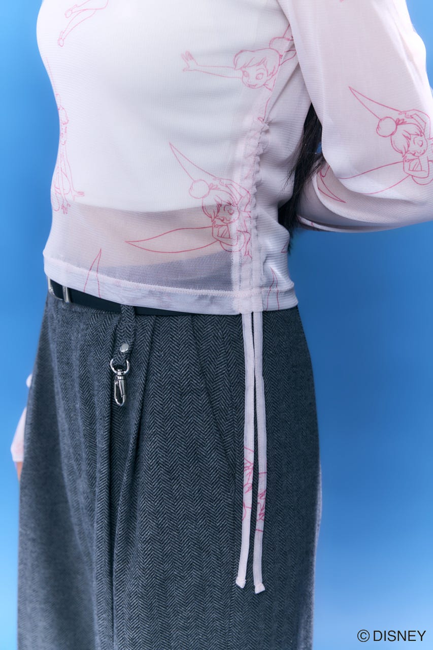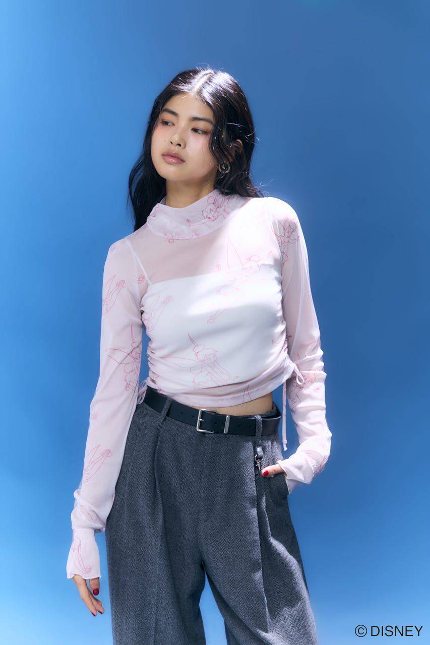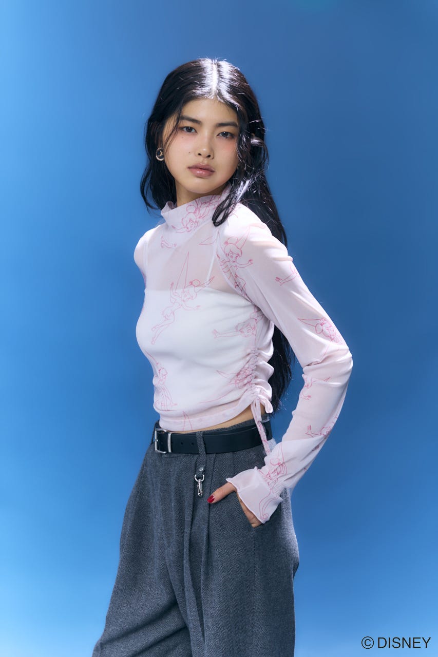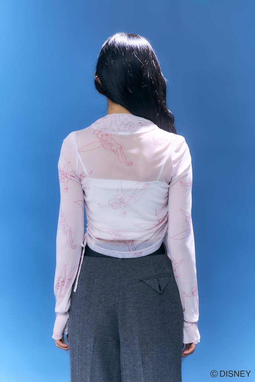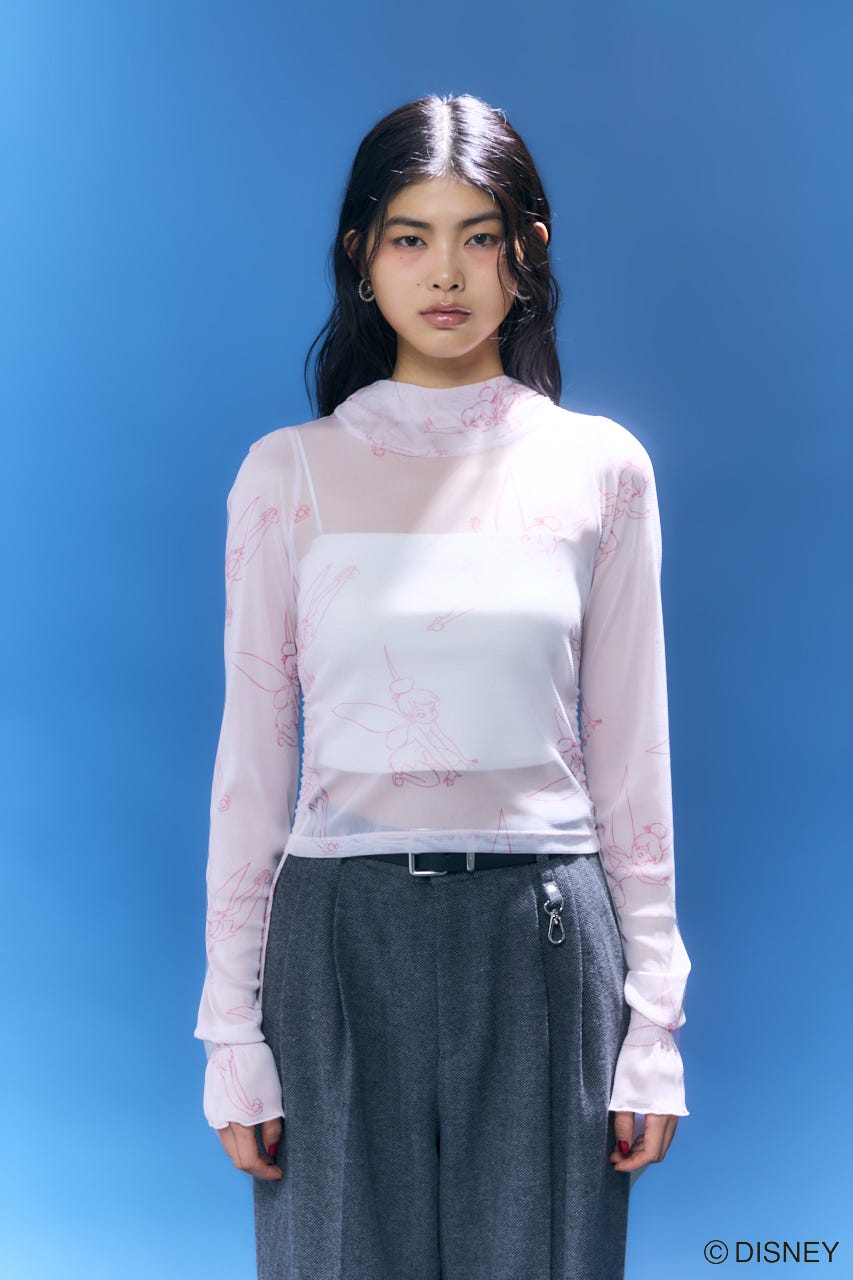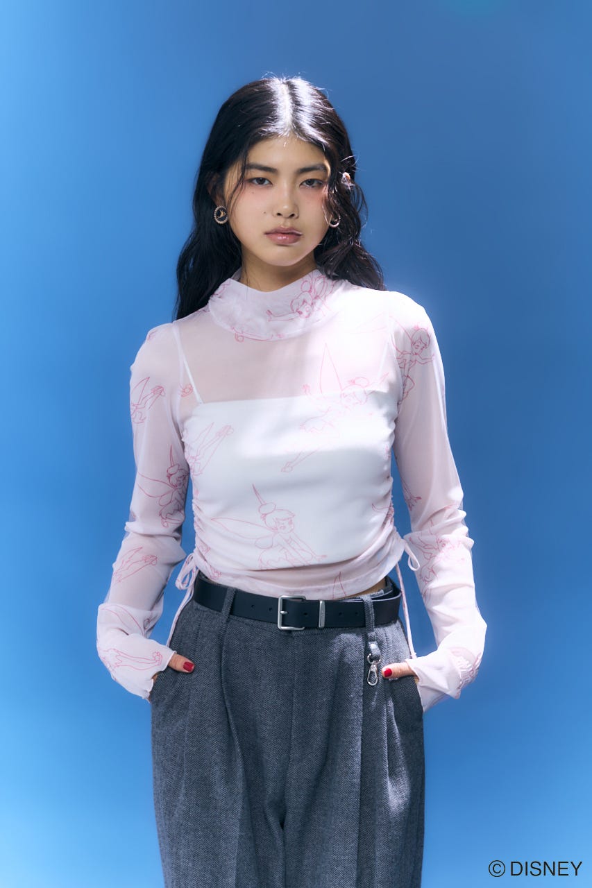 キャンディースリーブのシアートップスに様々な表情やポーズのティンカーベルを散りばめたオリジナルの総柄を作成しキャラクターの魅力を引き出しています。