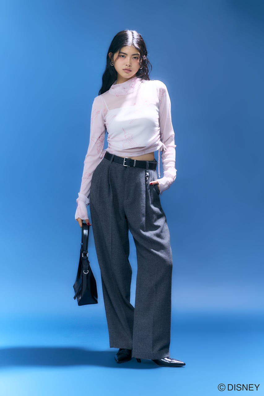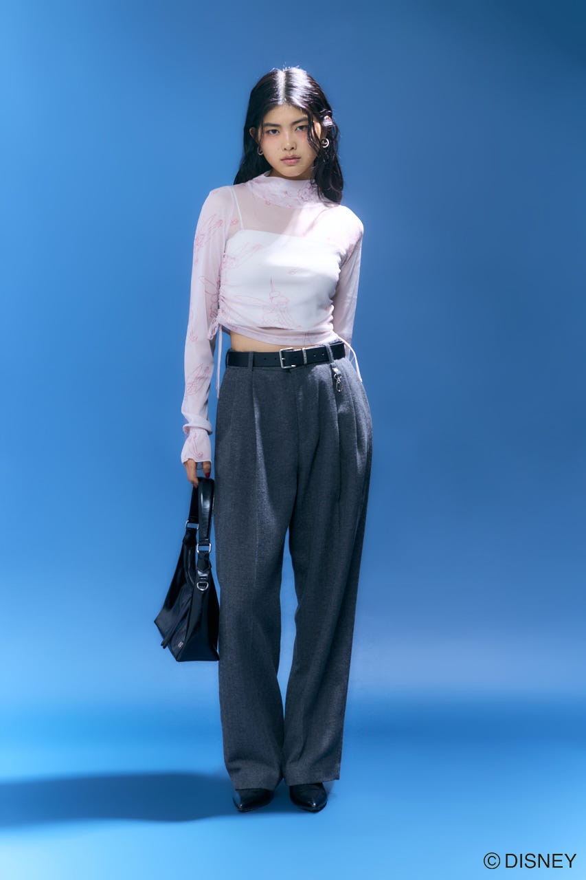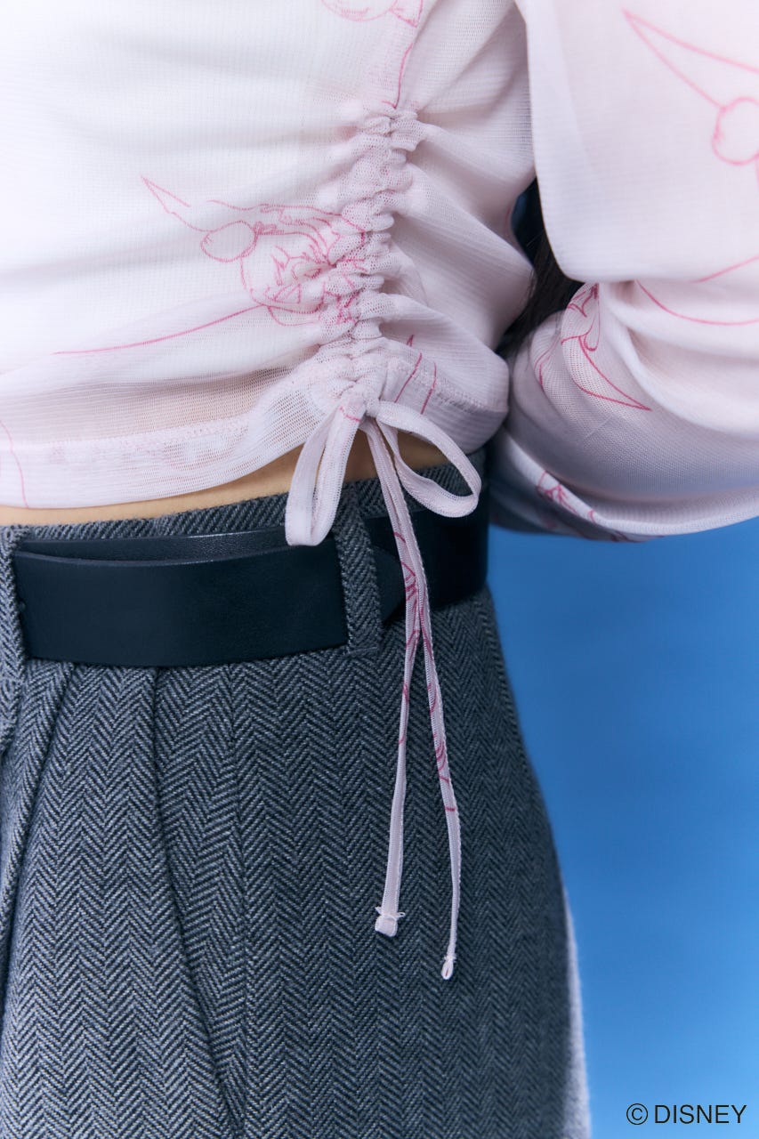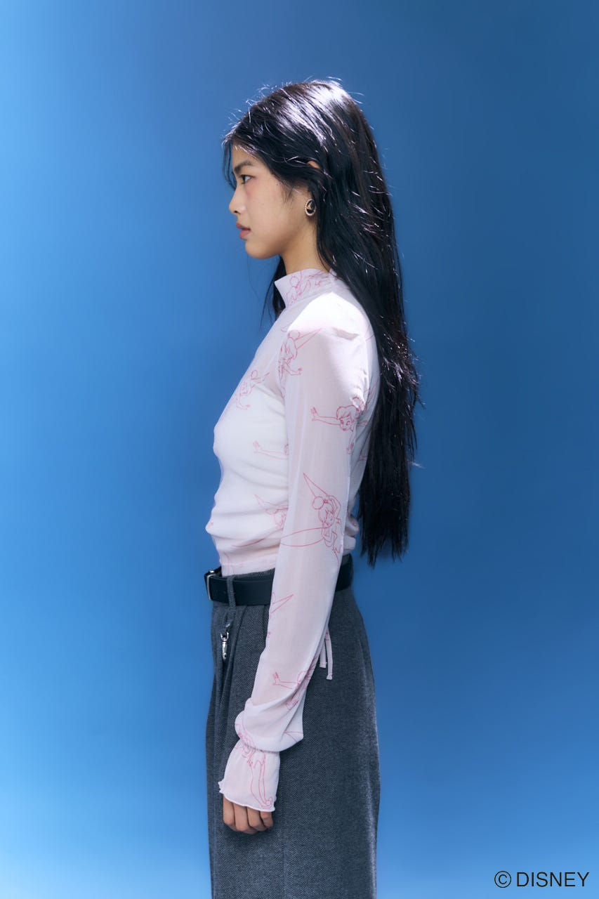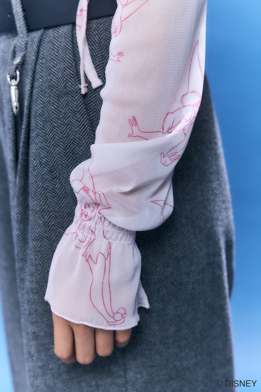 キャンディースリーブのシアートップスに様々な表情やポーズのティンカーベルを散りばめたオリジナルの総柄を作成しキャラクターの魅力を引き出しています。