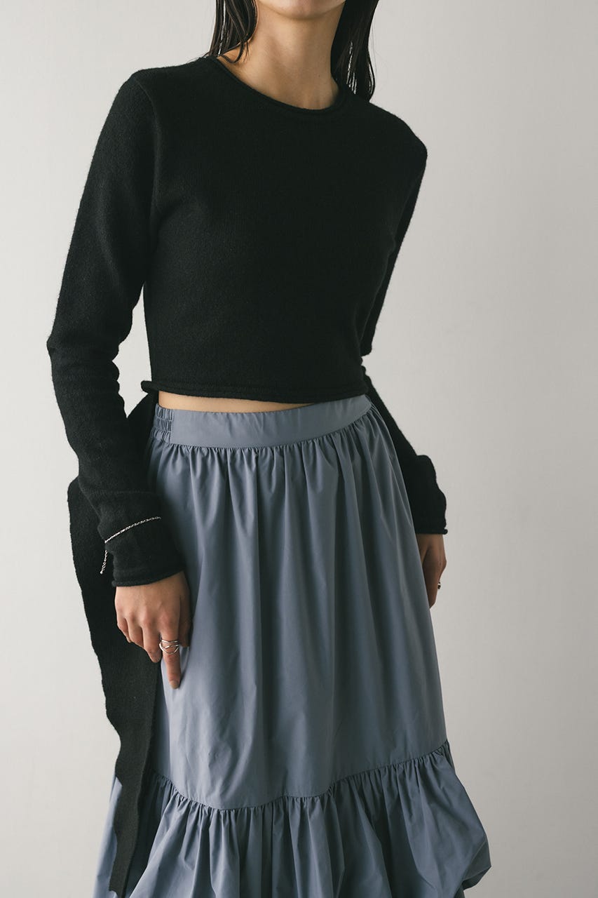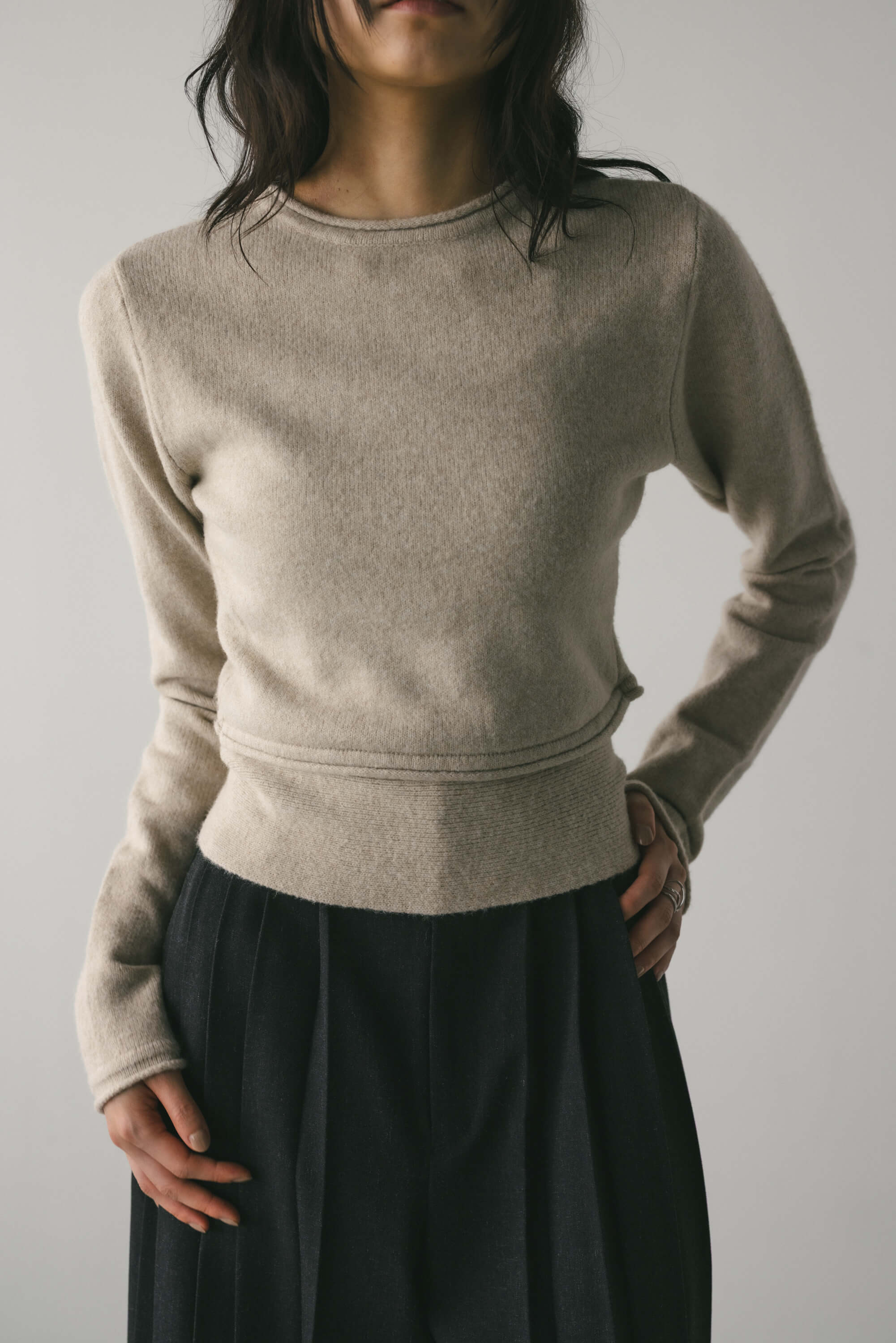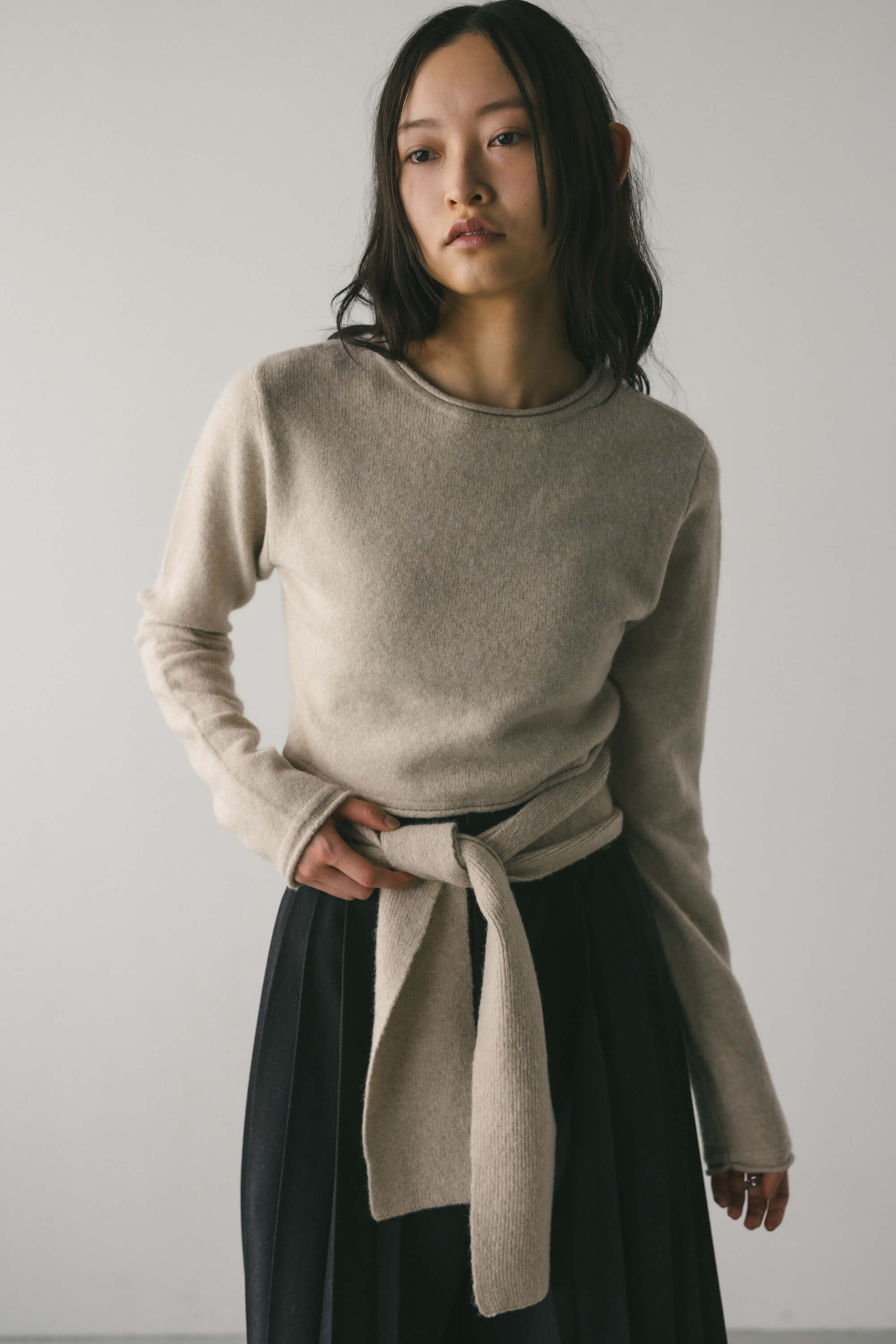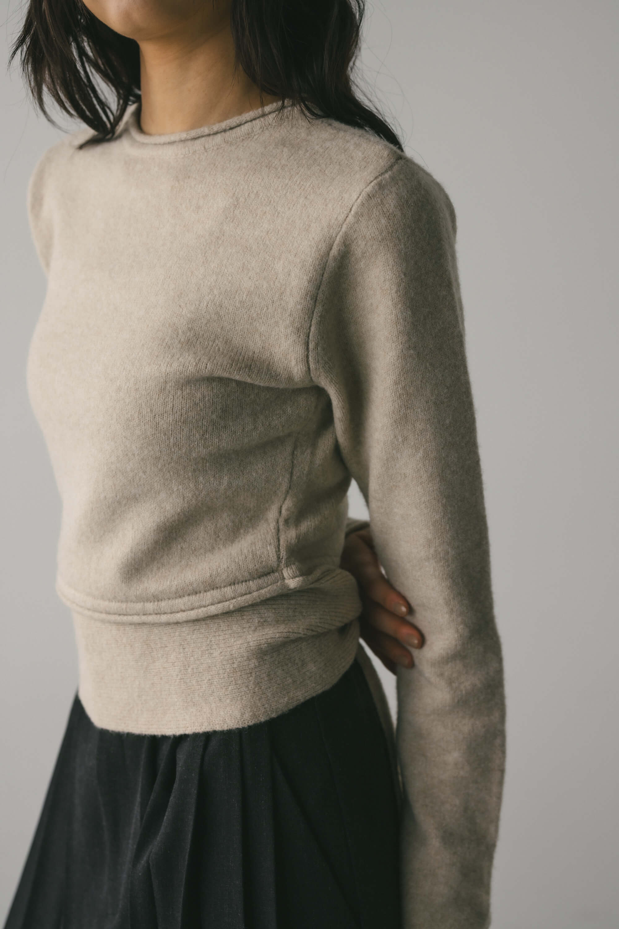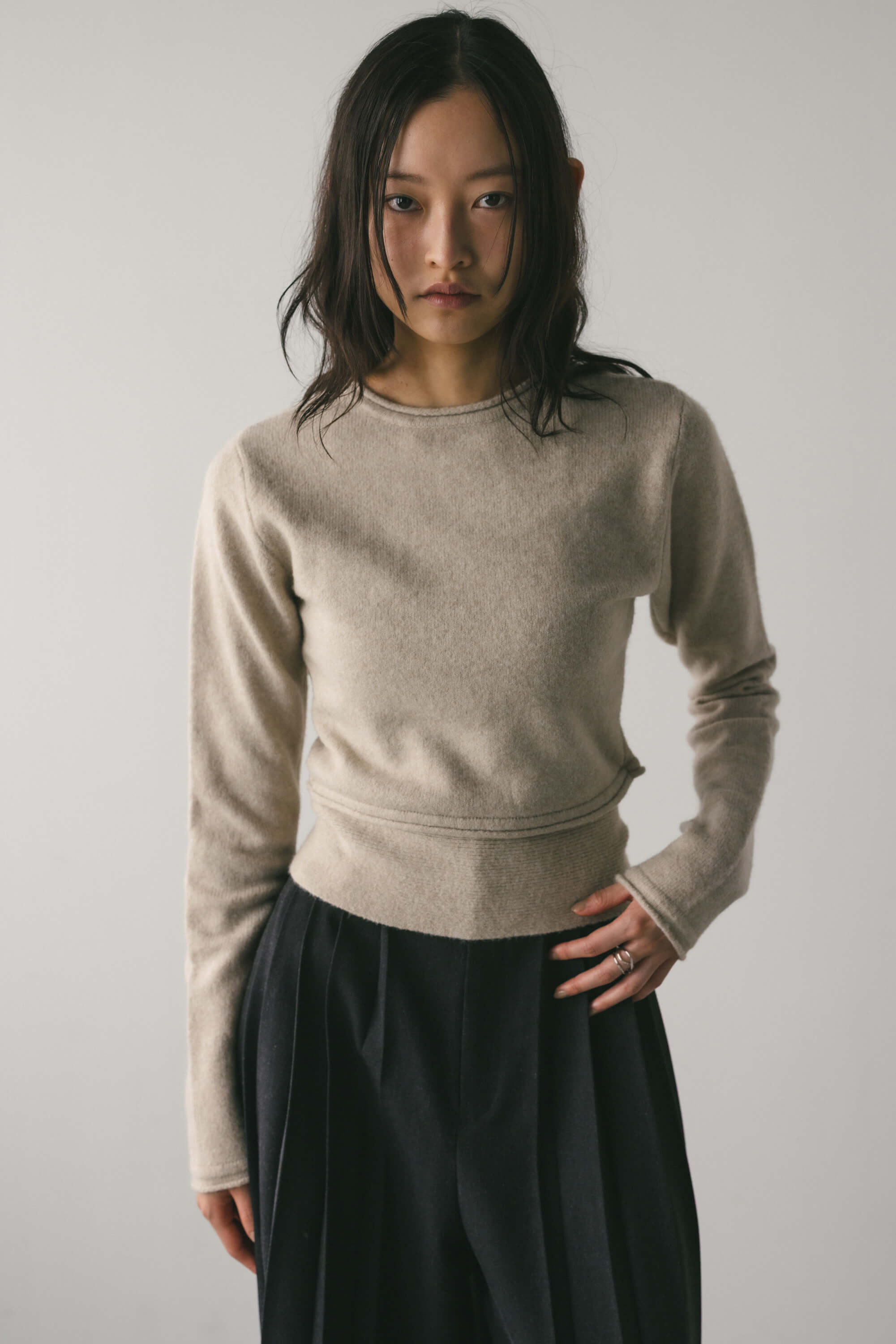 ウエストマークできるデザインがポイントのショート丈のコンパクトニット。