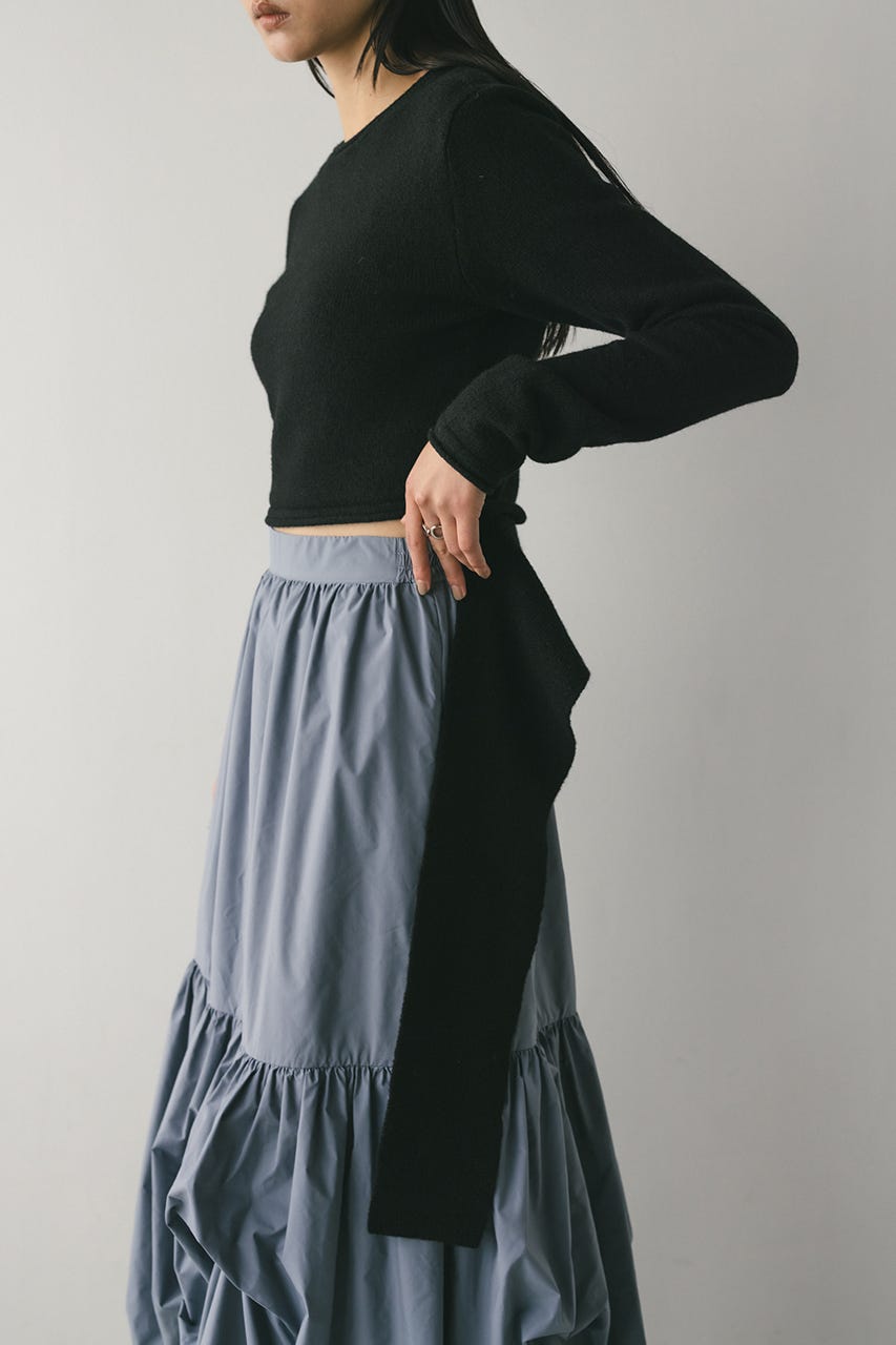 ドッキングされているウエスト紐はルーズに片結びして垂らしたスタイリングがおすすめ。