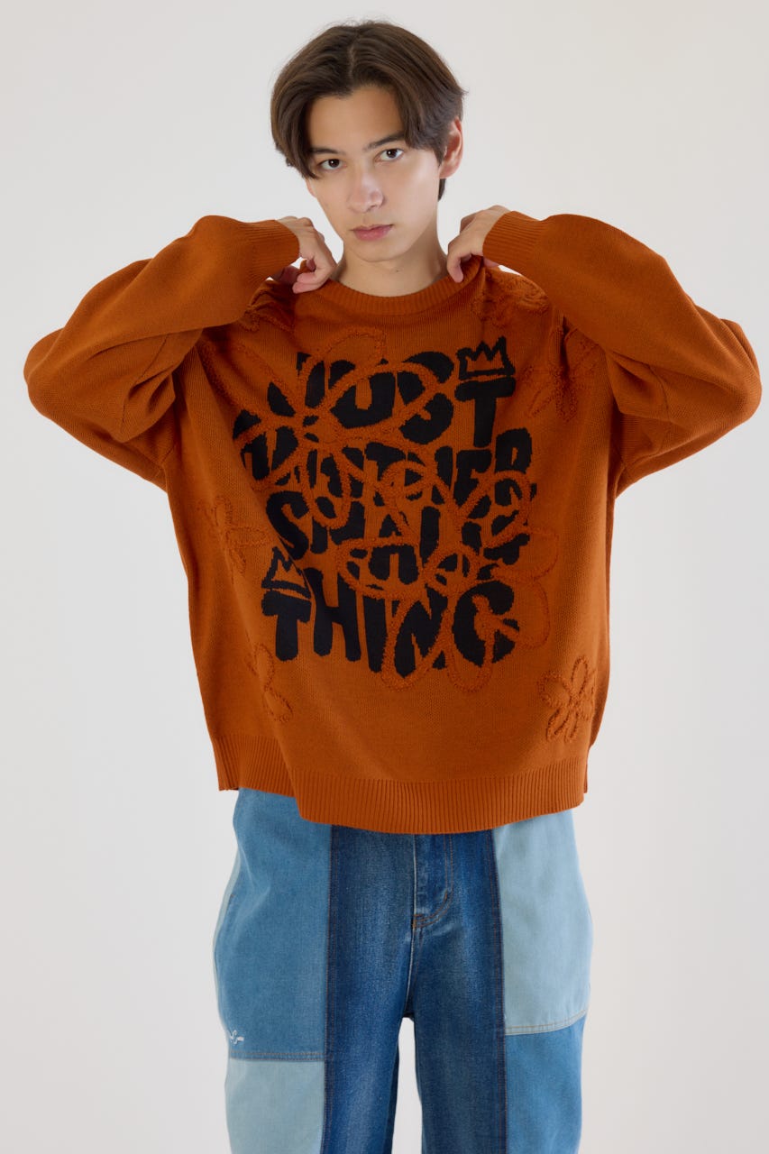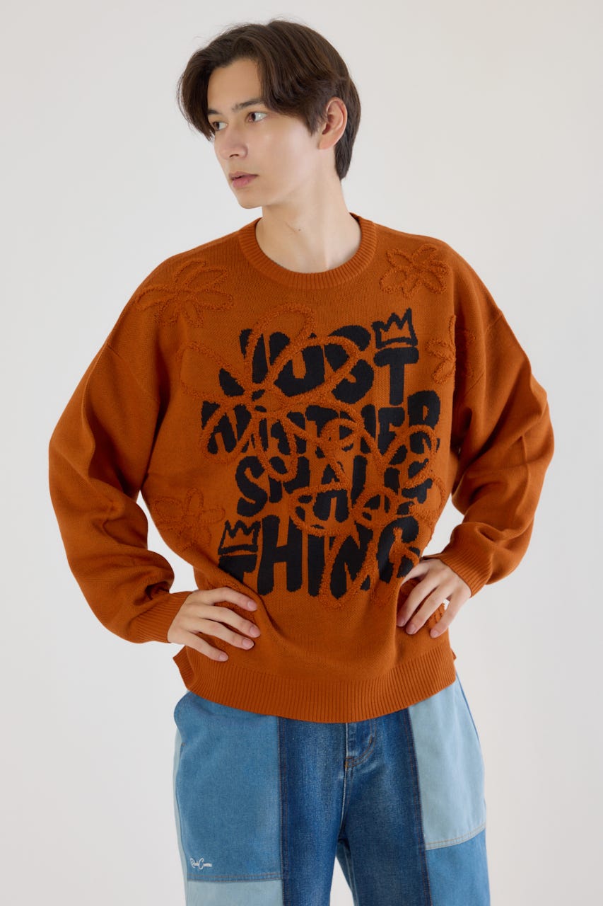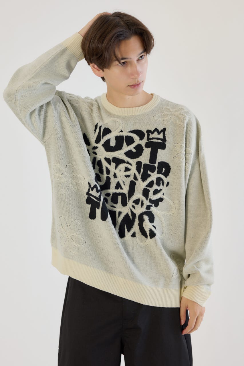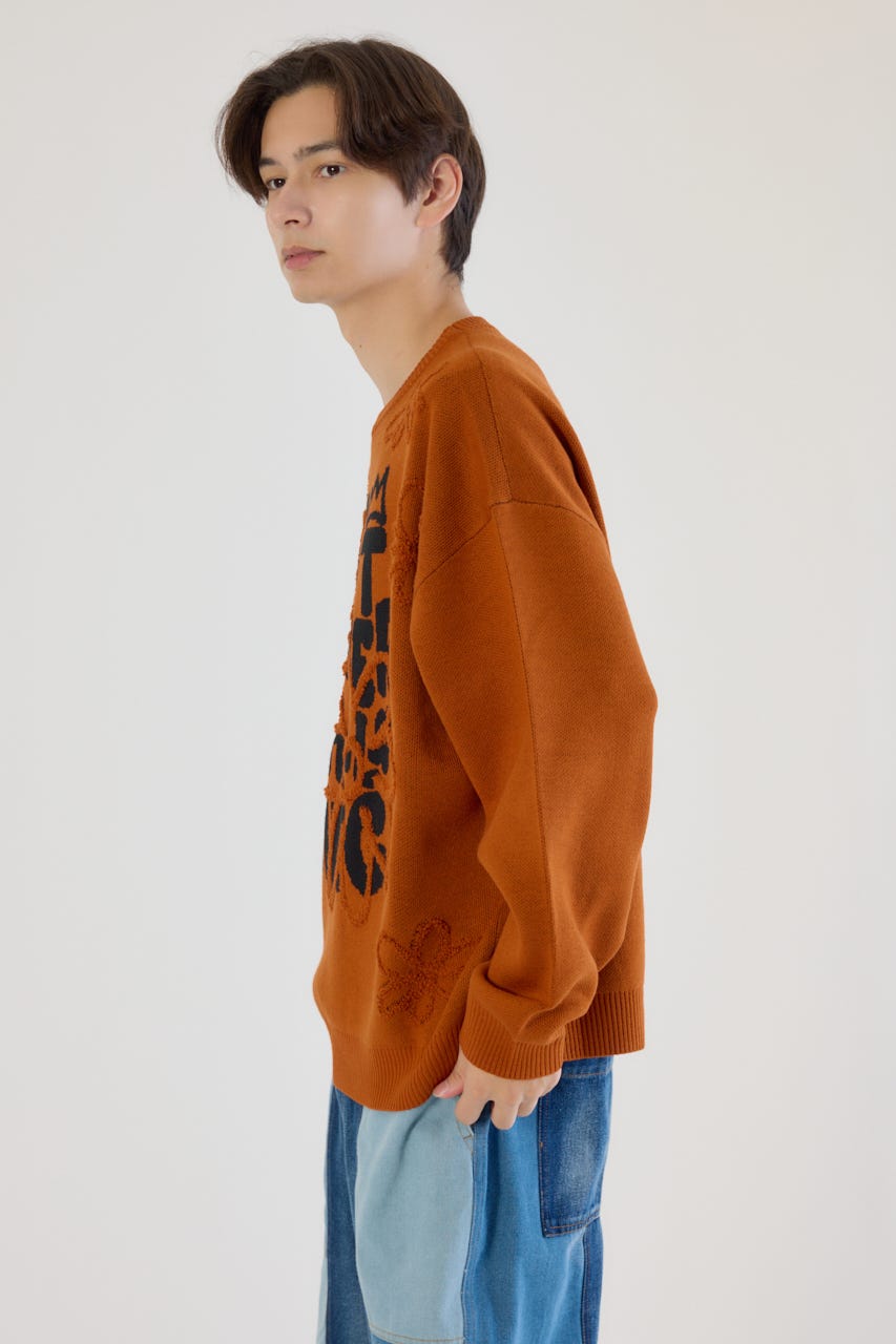 手書き風の柔らかいフォントに、前身頃全体に施した立体感あるフラワーグラフィックがキャッチーなニットトップス。