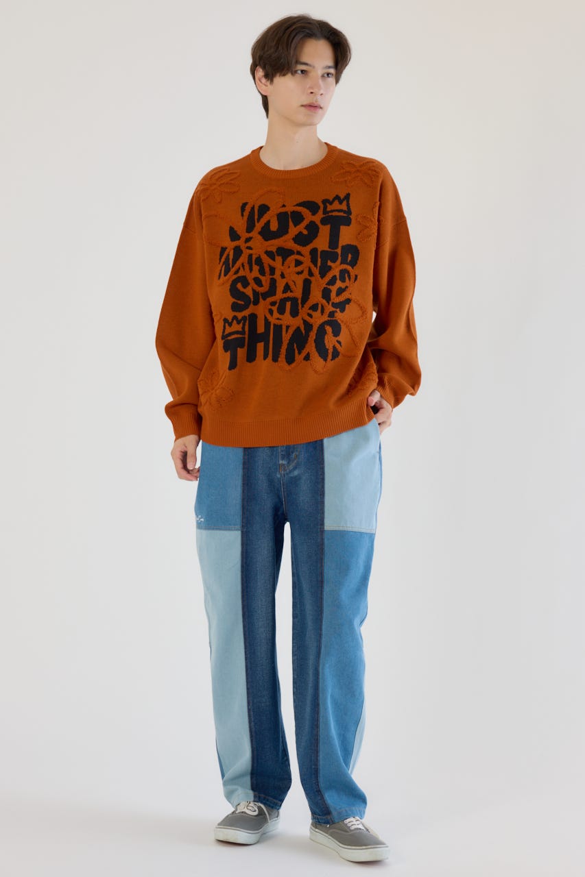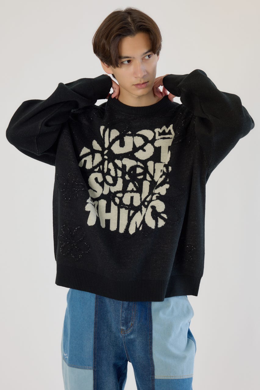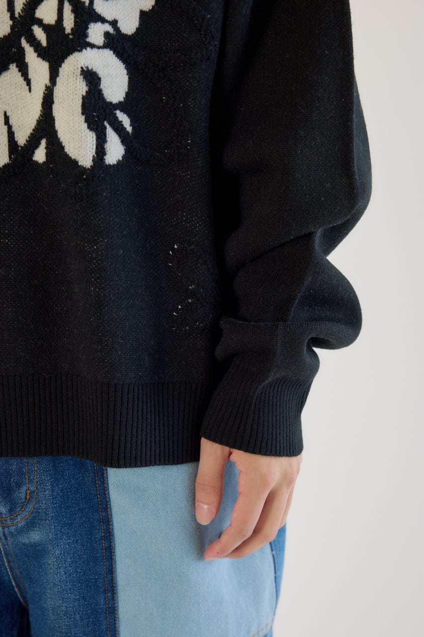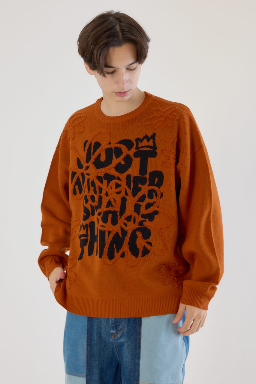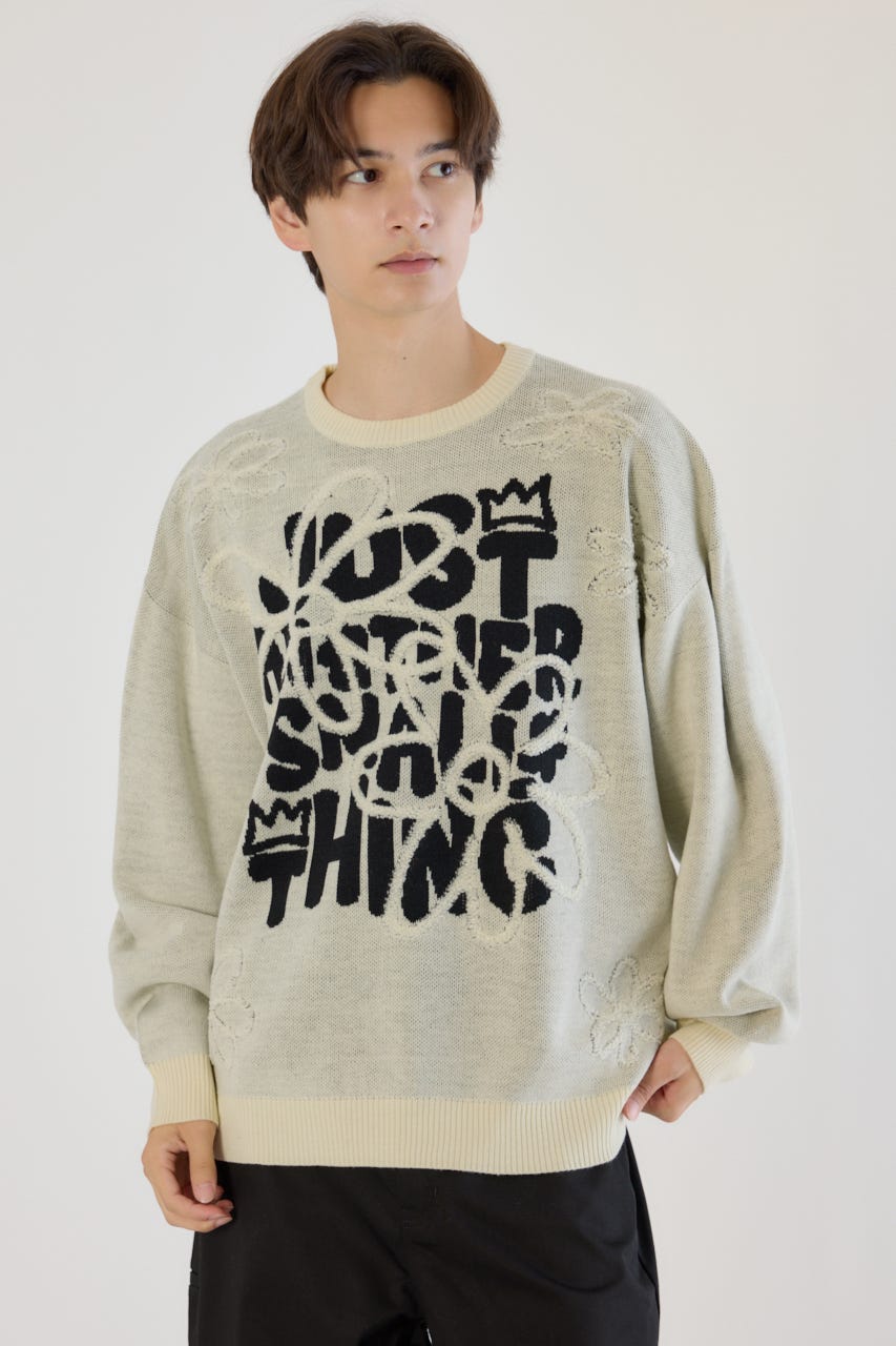 手書き風の柔らかいフォントに、前身頃全体に施した立体感あるフラワーグラフィックがキャッチーなニットトップス。