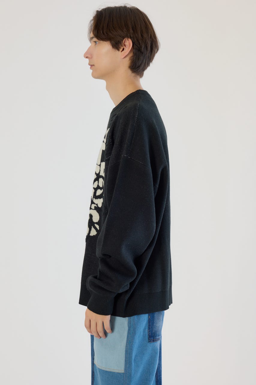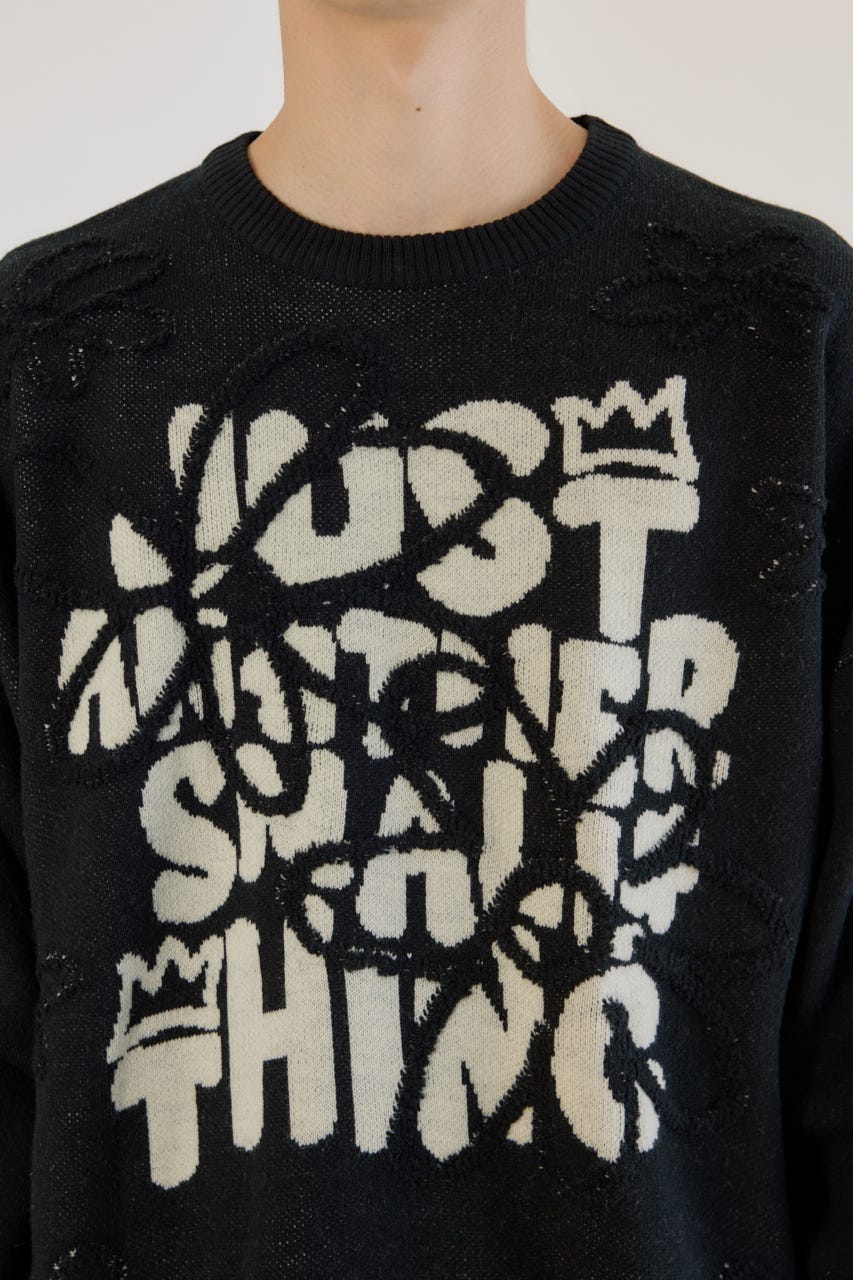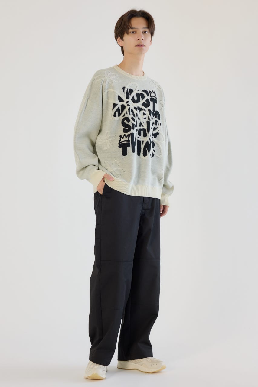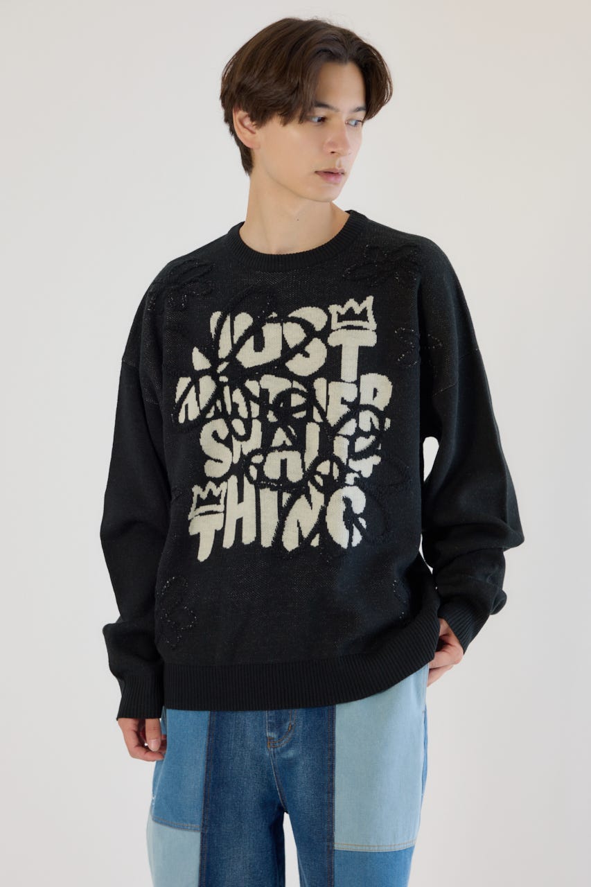 手書き風の柔らかいフォントに、前身頃全体に施した立体感あるフラワーグラフィックがキャッチーなニットトップス。