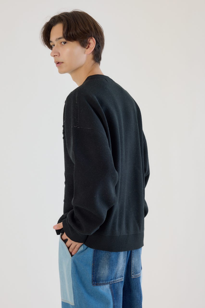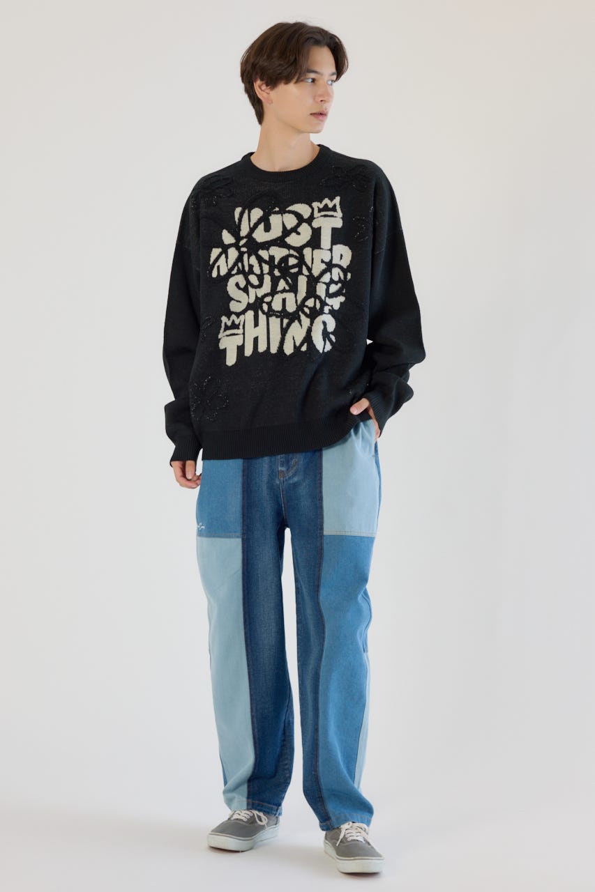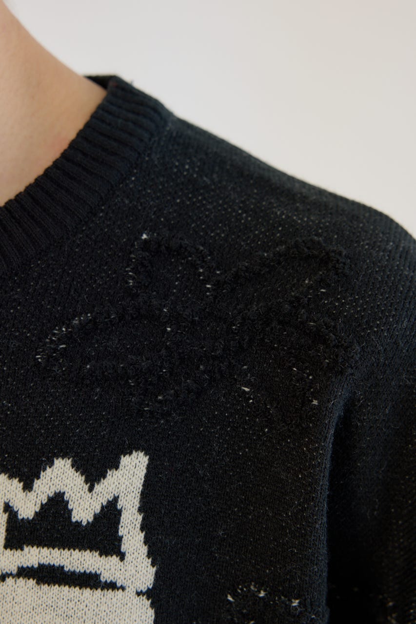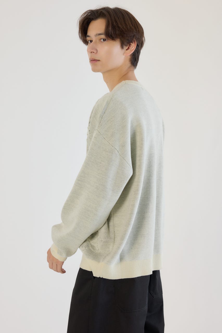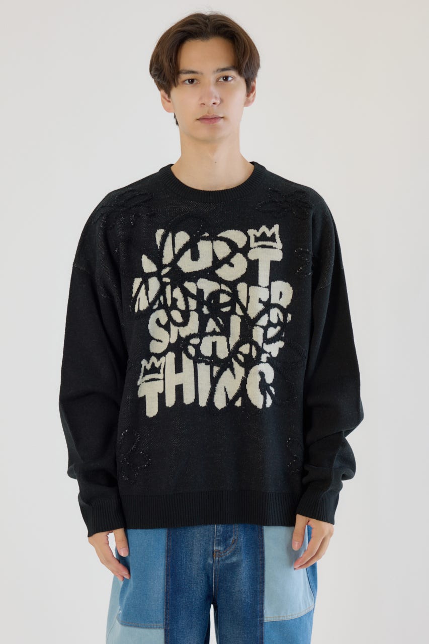 手書き風の柔らかいフォントに、前身頃全体に施した立体感あるフラワーグラフィックがキャッチーなニットトップス。