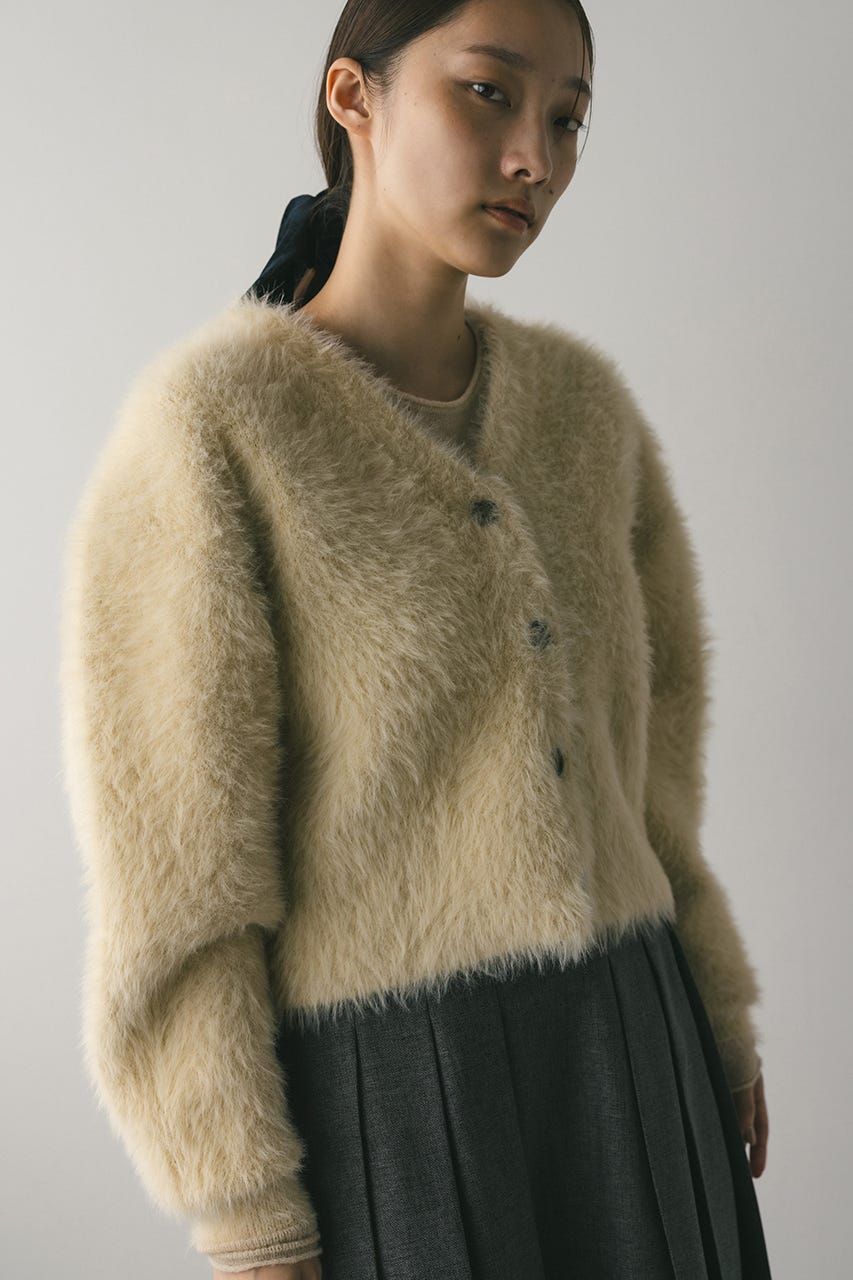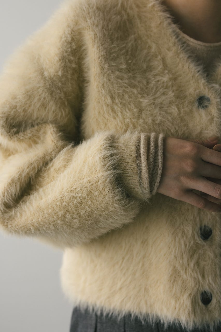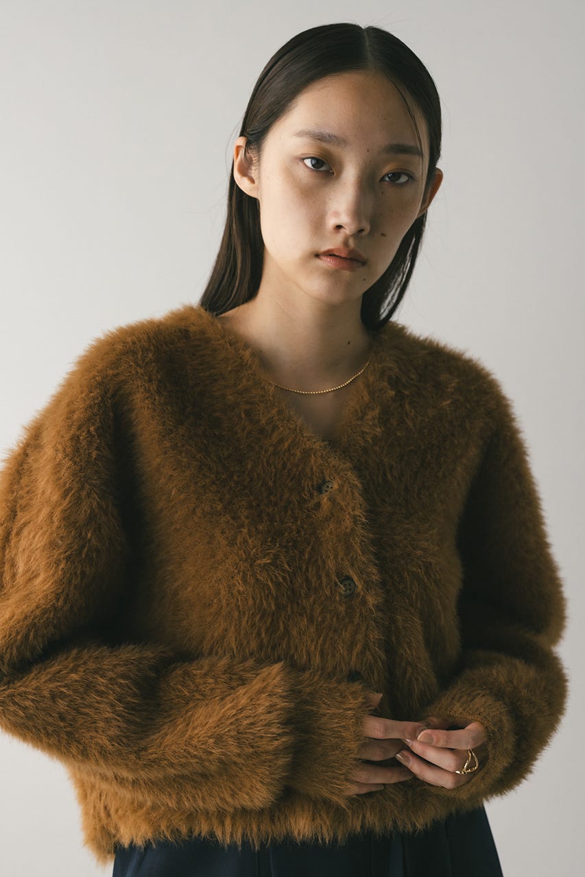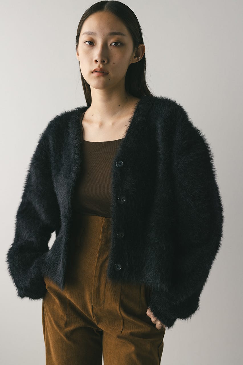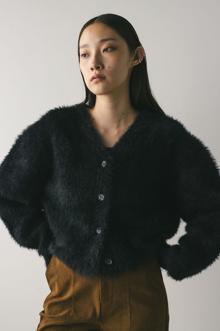 暖かさとふんわりとした柔らかい肌触りを叶えるシャギーの毛足が可愛いアウターライクなニットカーディガン。