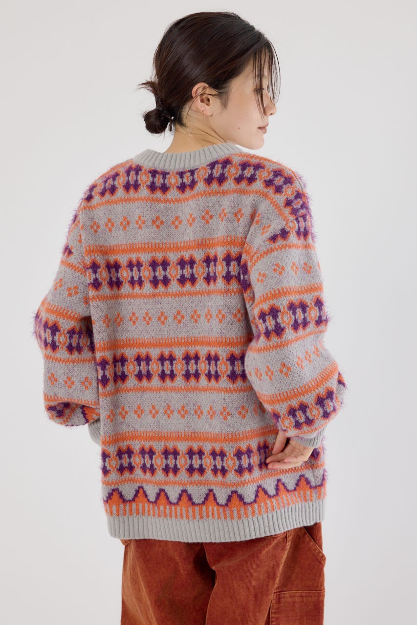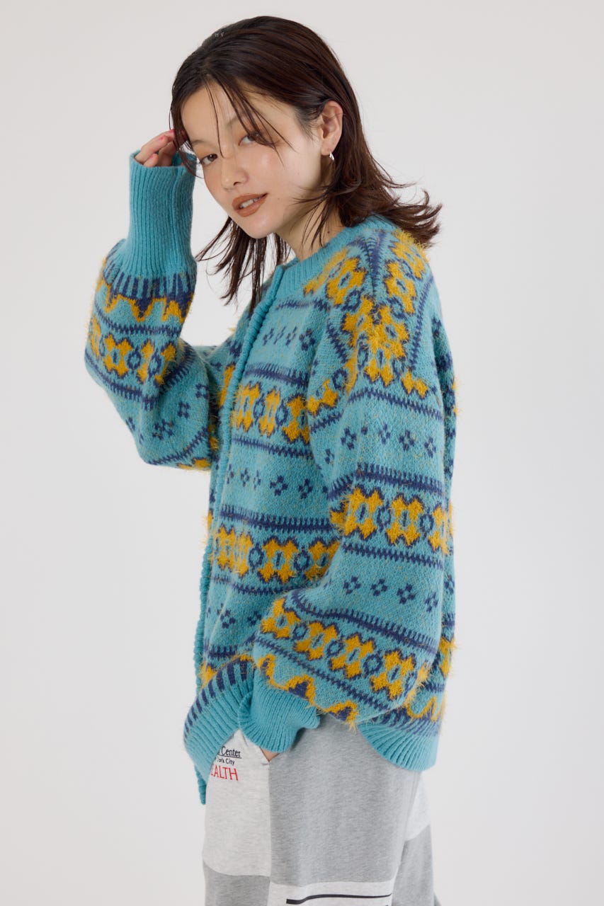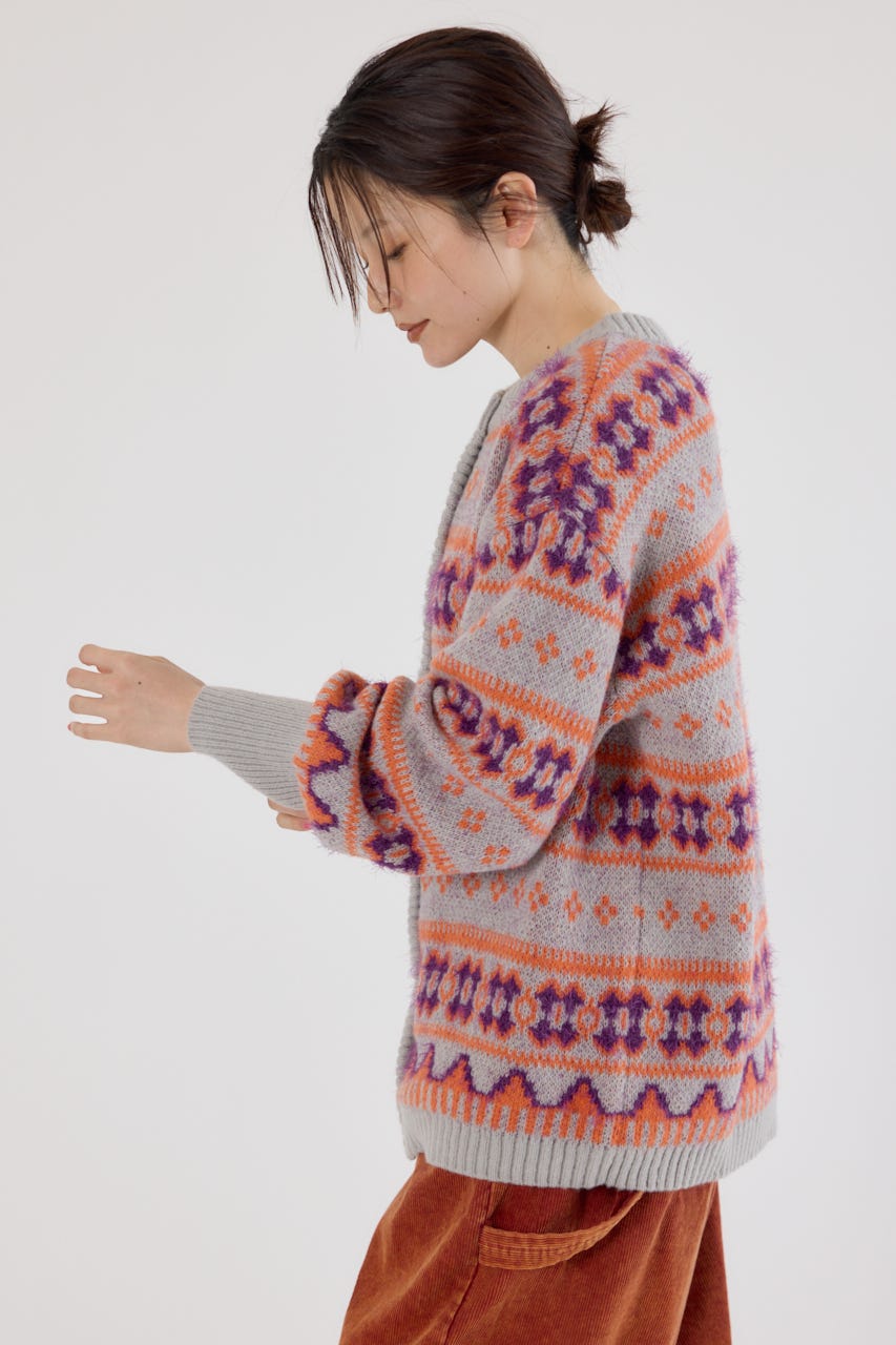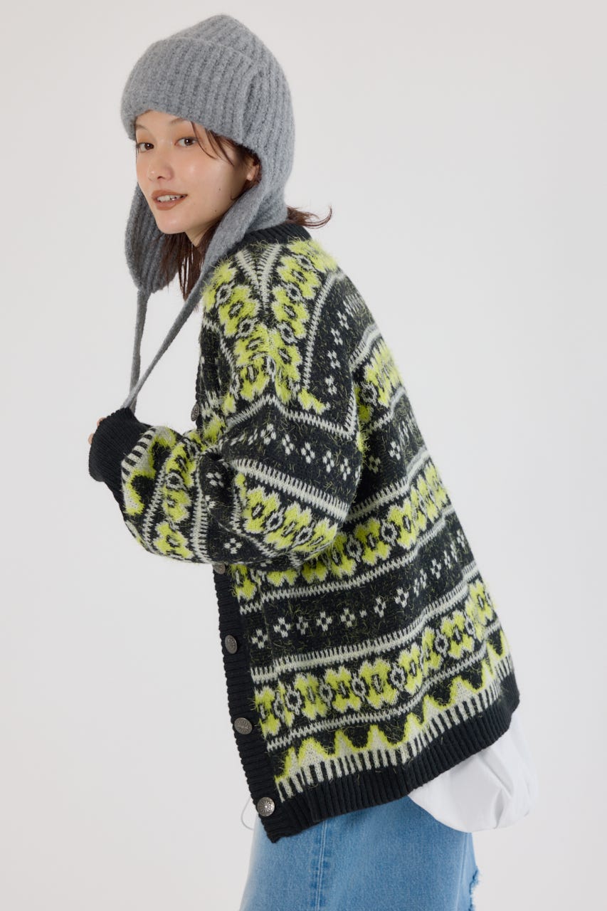 シャギー意匠糸を使用しているため、素材特性上、編地表面にネップや糸の浮きが多少生じる場合があります。
