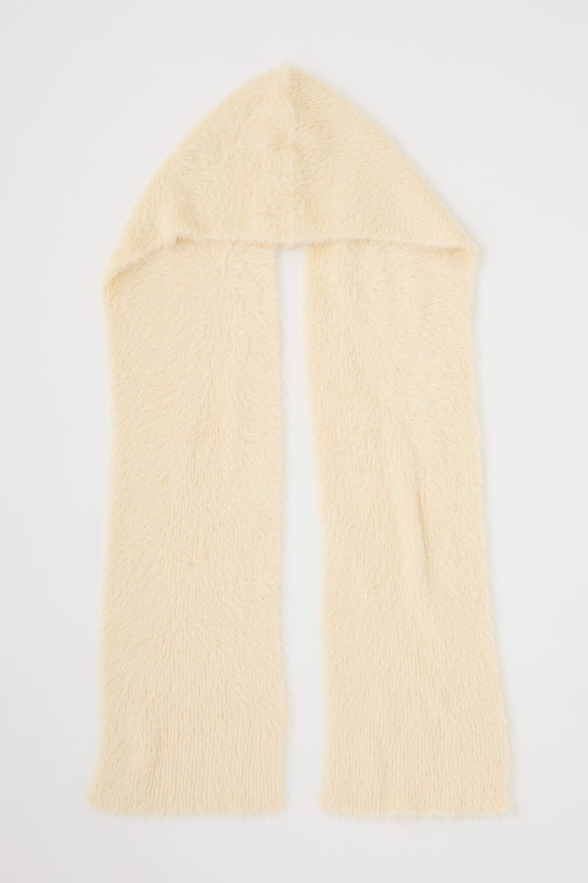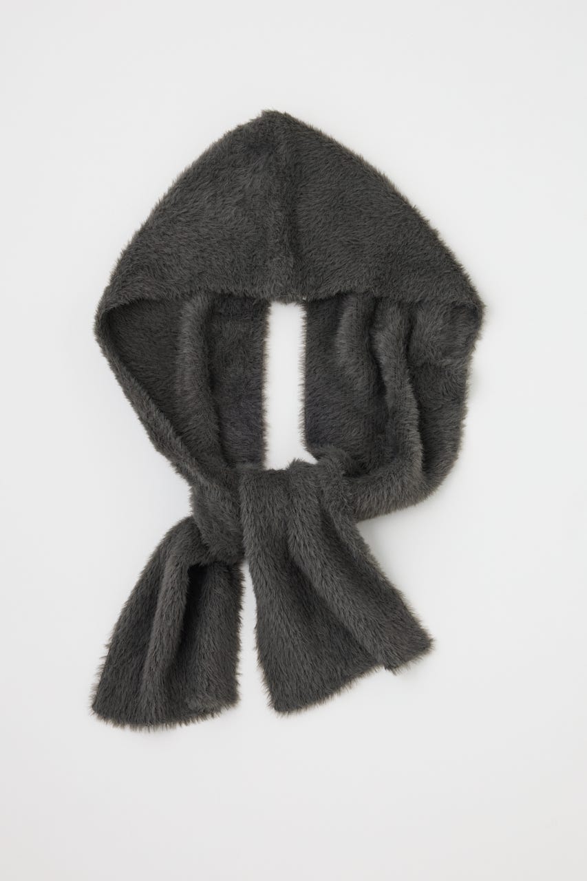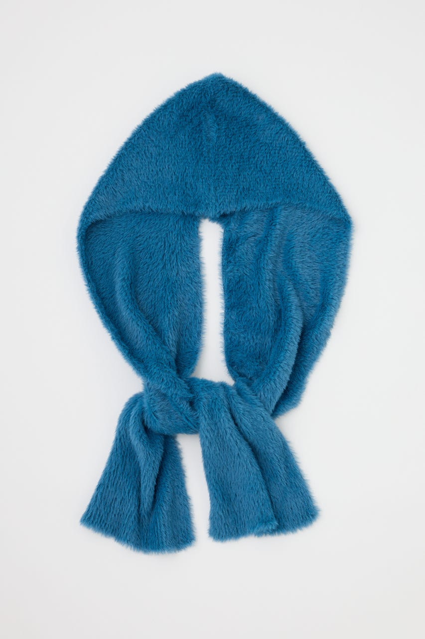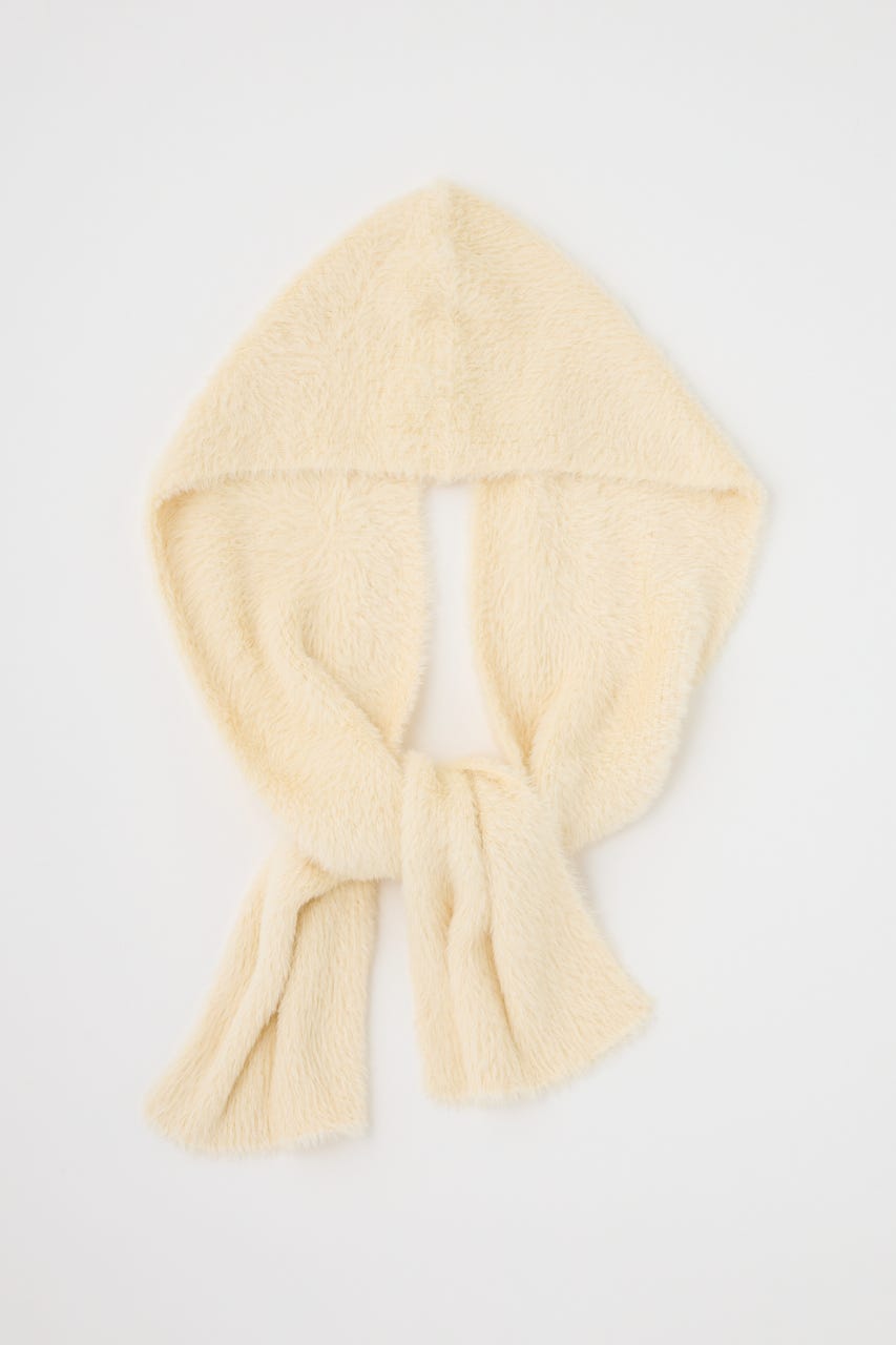 ふわふわとした肌触りの良い糸を使用したフード付きのマフラー。
