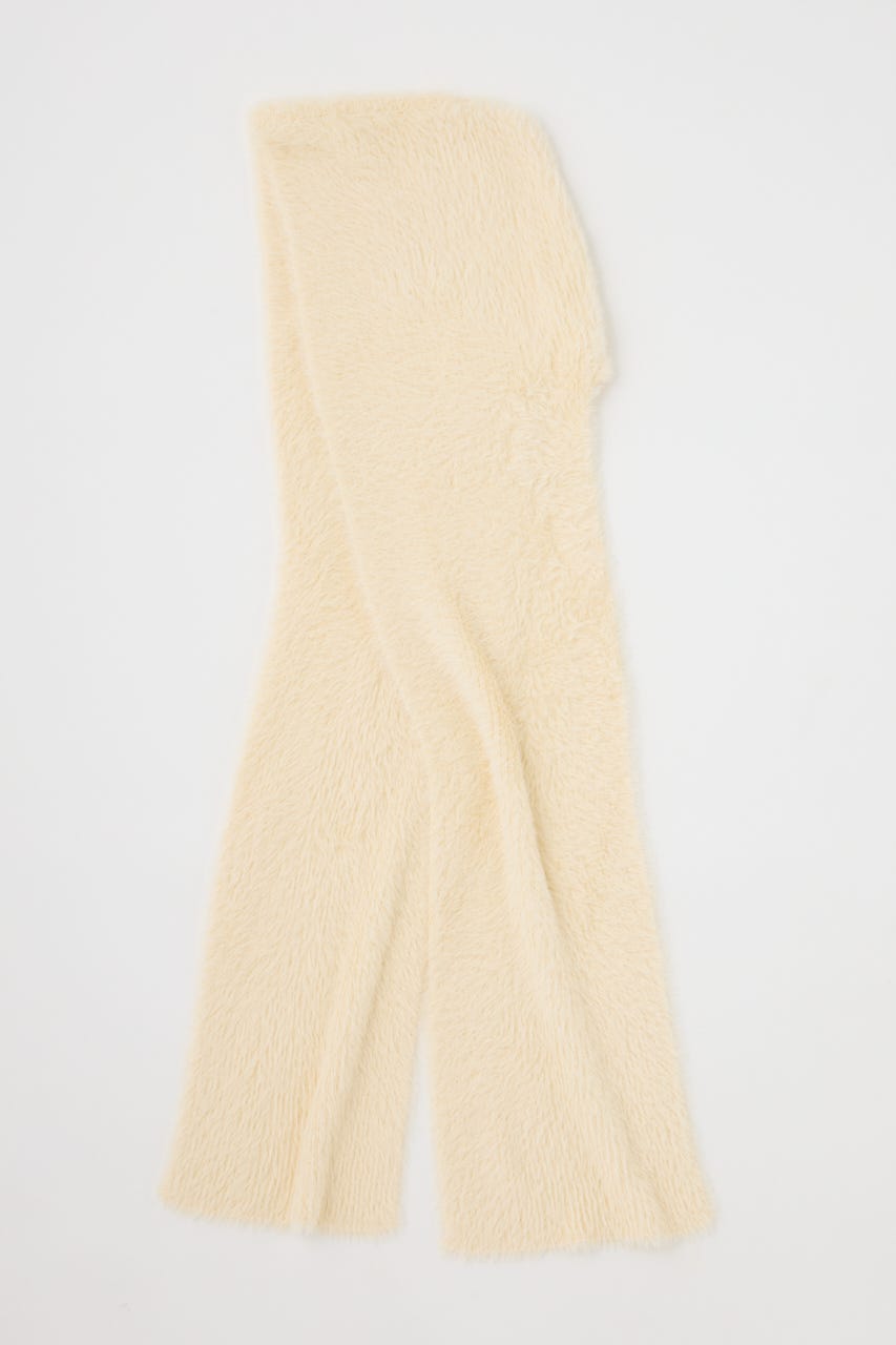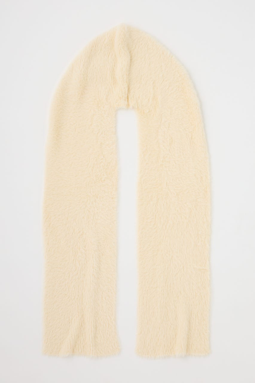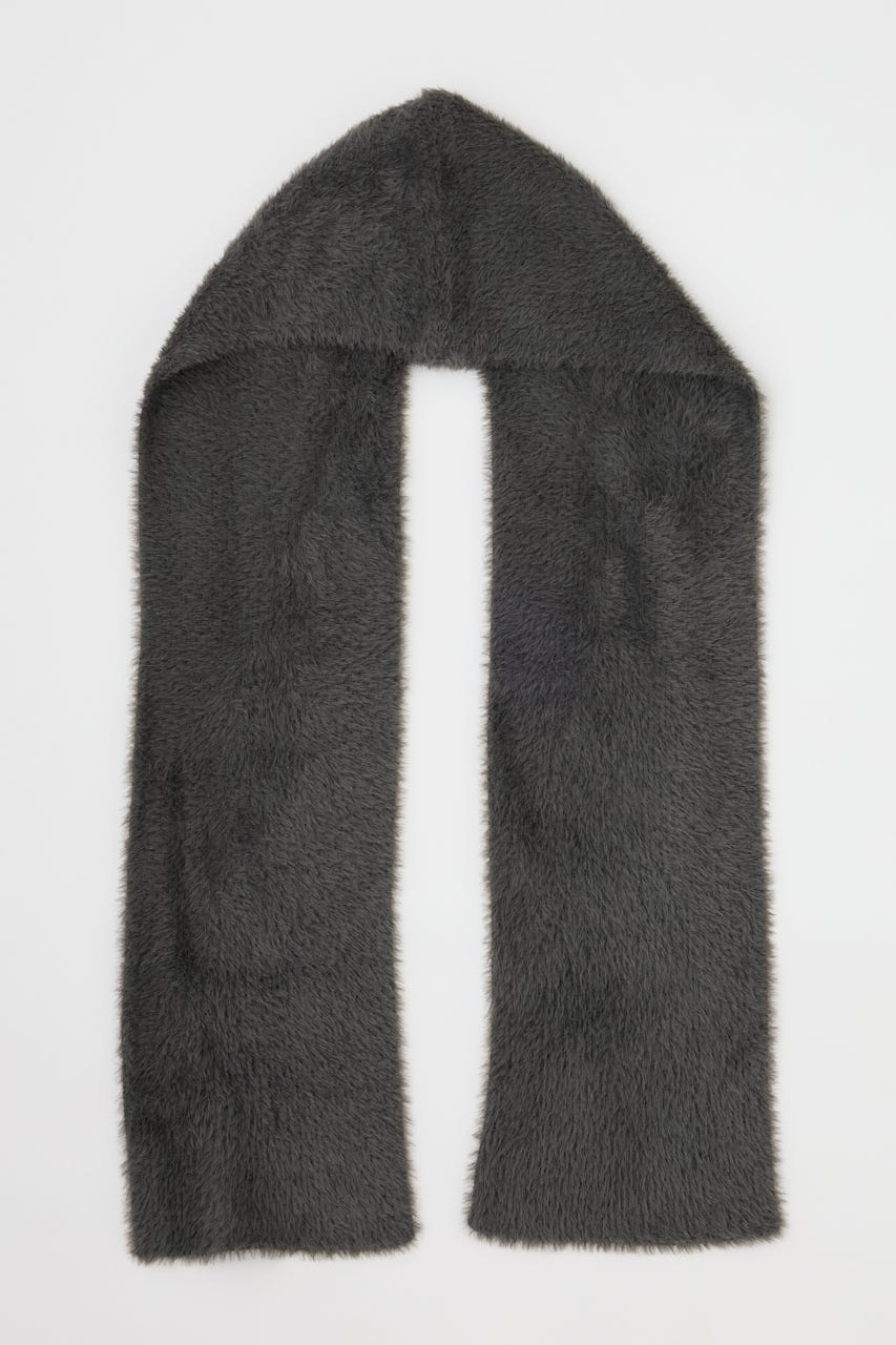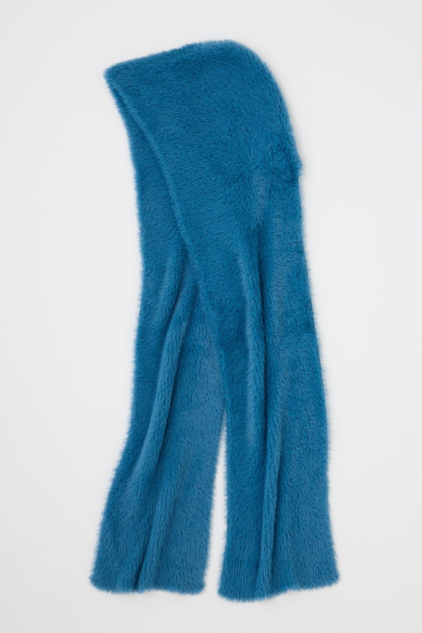 ふわふわとした肌触りの良い糸を使用したフード付きのマフラー。
