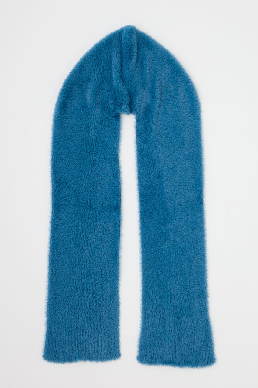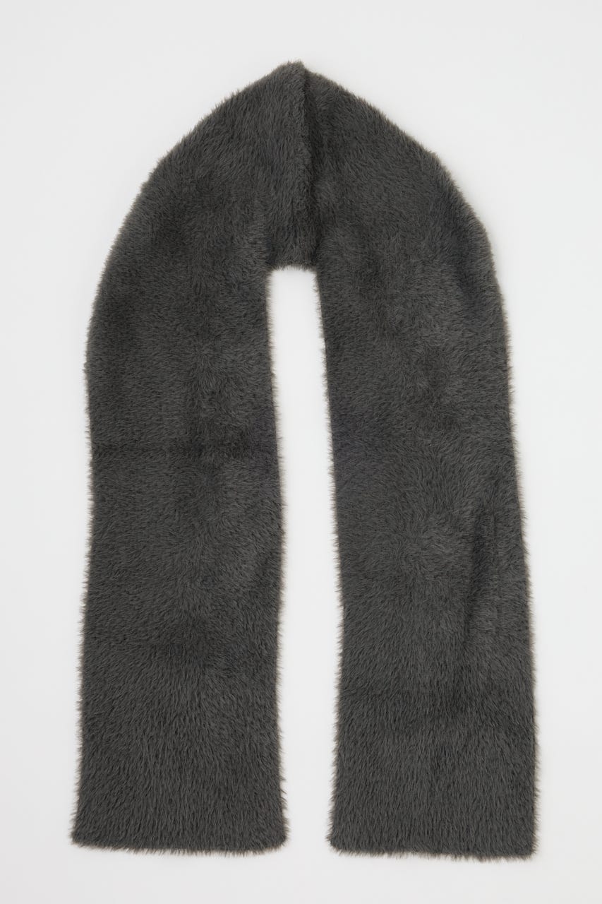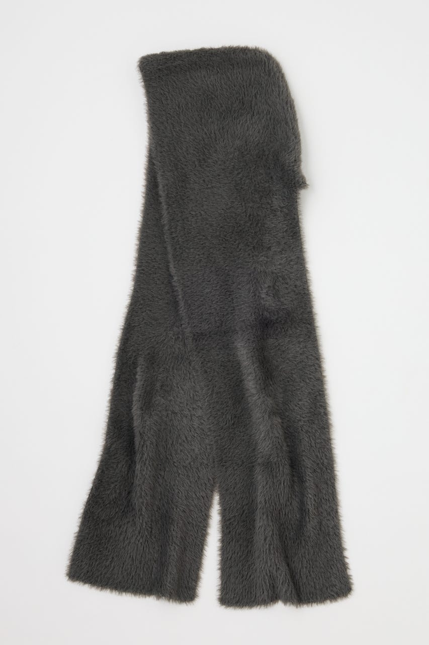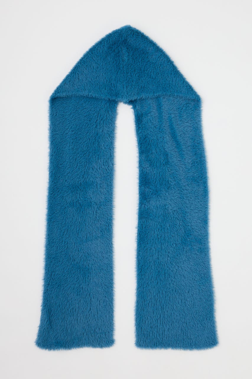 ふわふわとした肌触りの良い糸を使用したフード付きのマフラー。