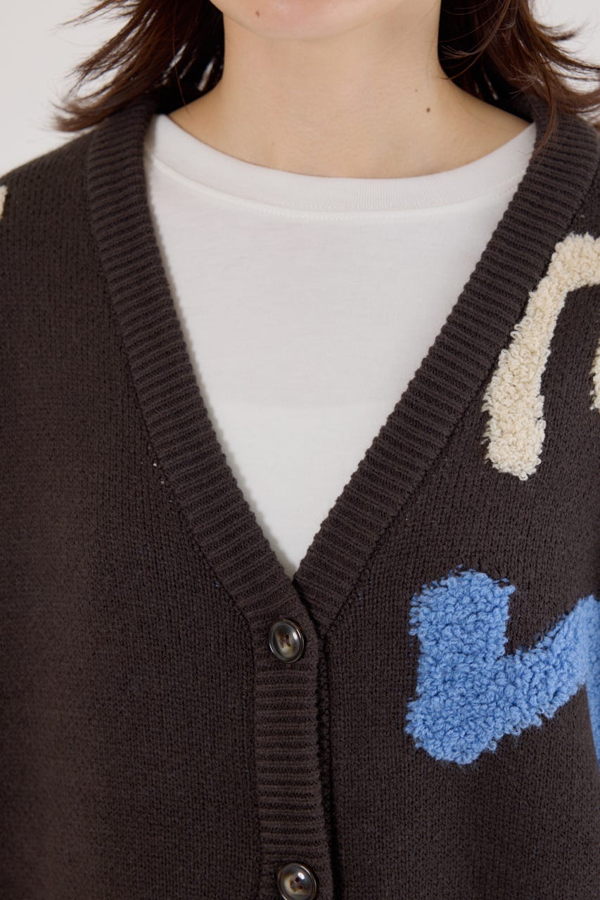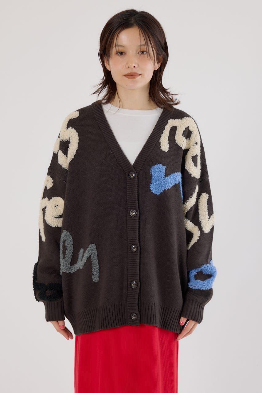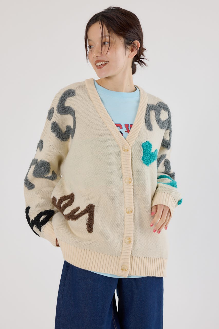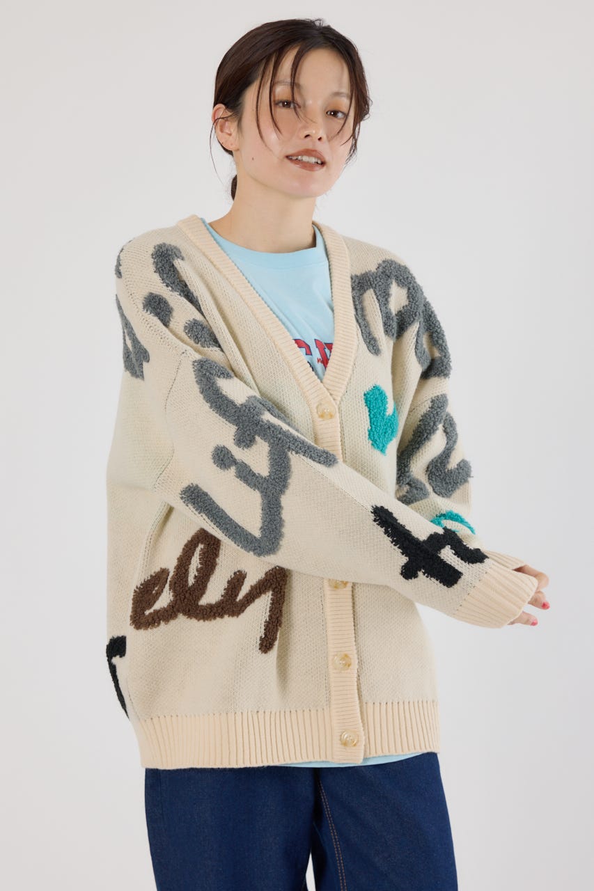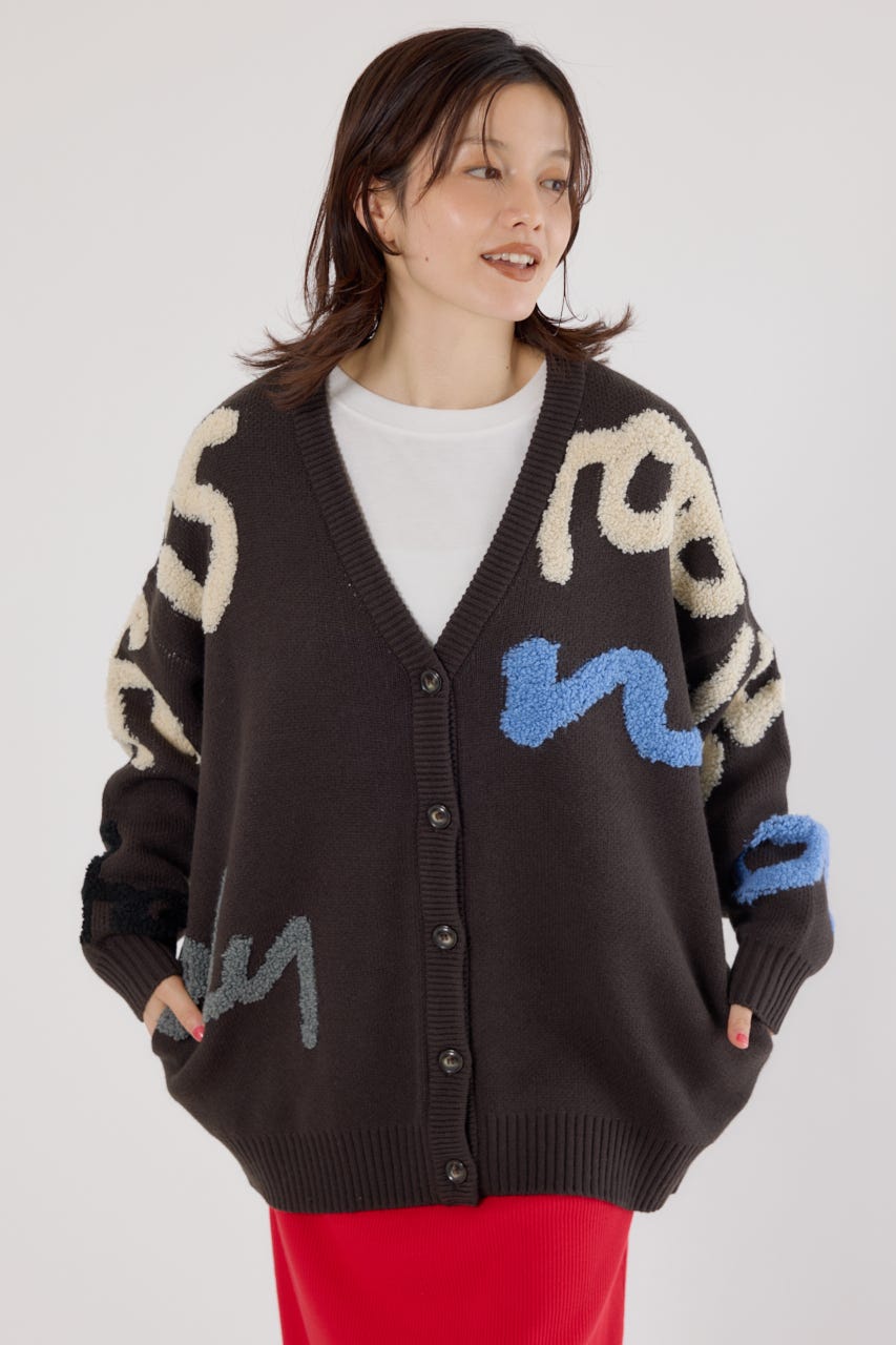 キャッチーなメッセージロゴを入れたモノグラム柄のネックニットカーディガン。