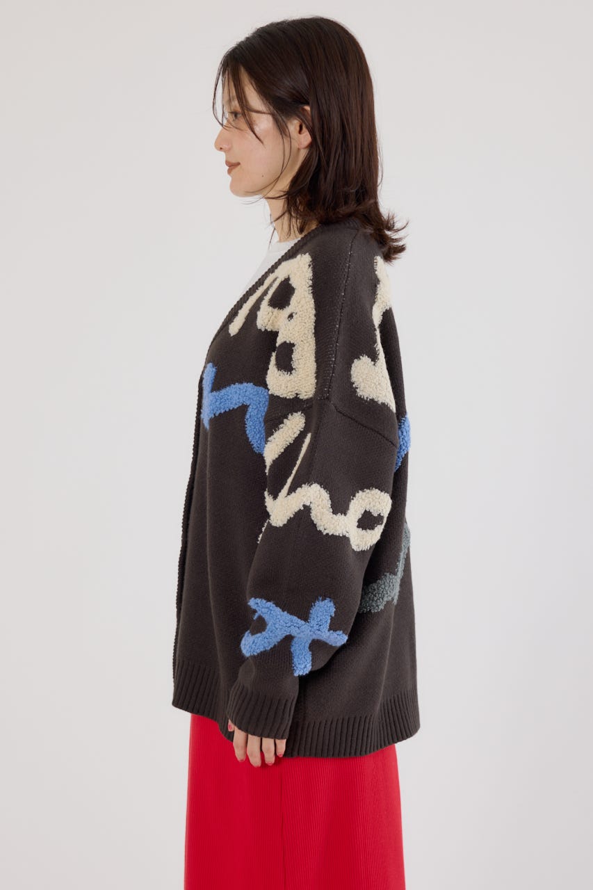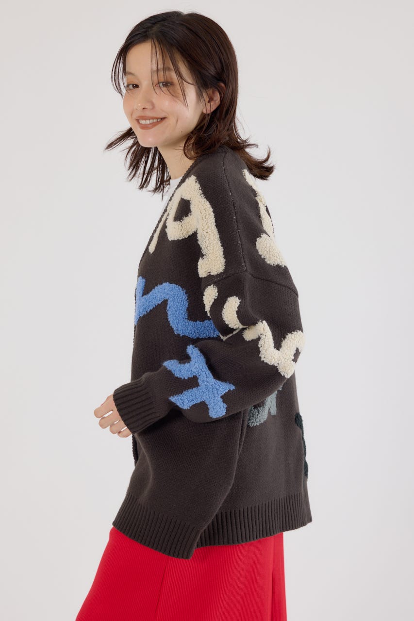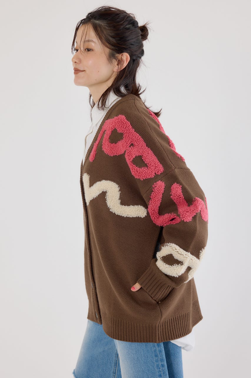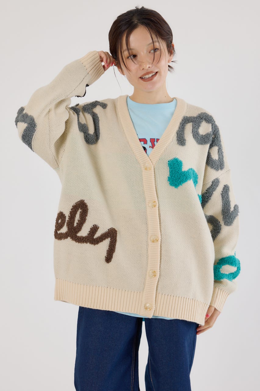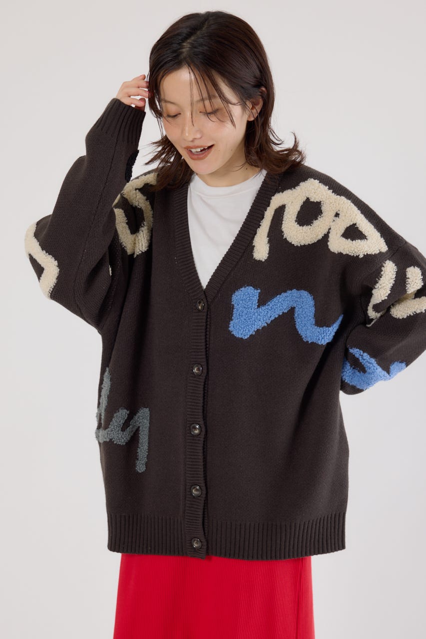 キャッチーなメッセージロゴを入れたモノグラム柄のネックニットカーディガン。