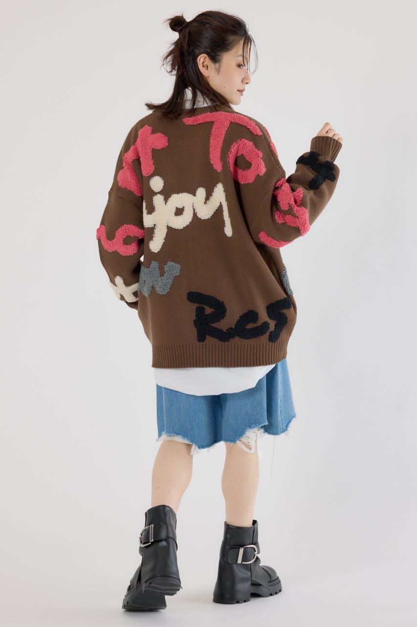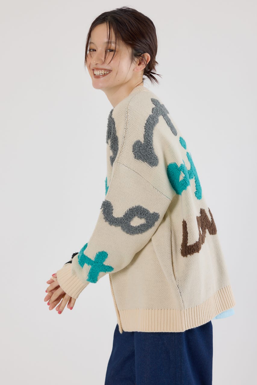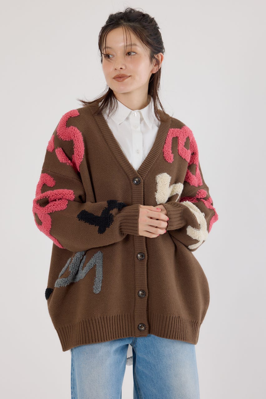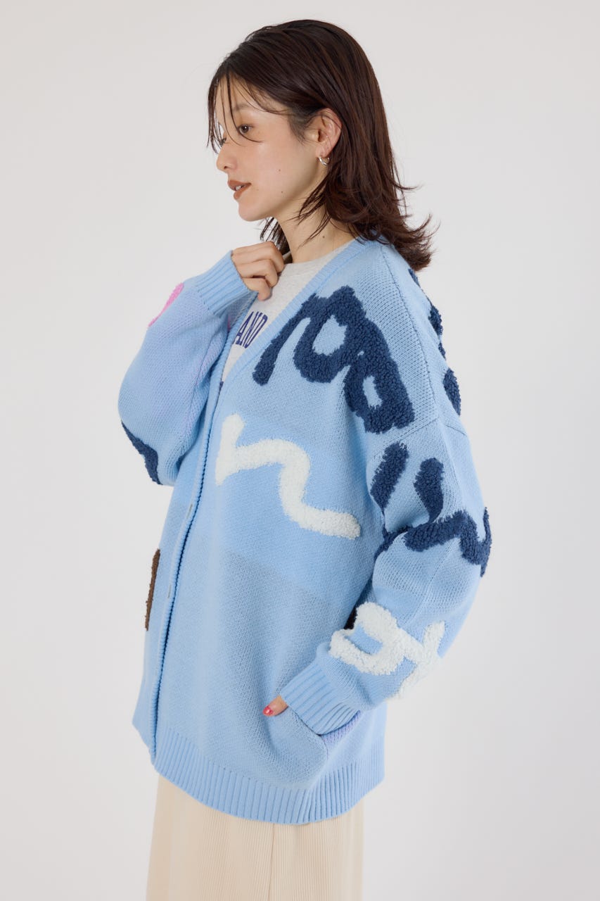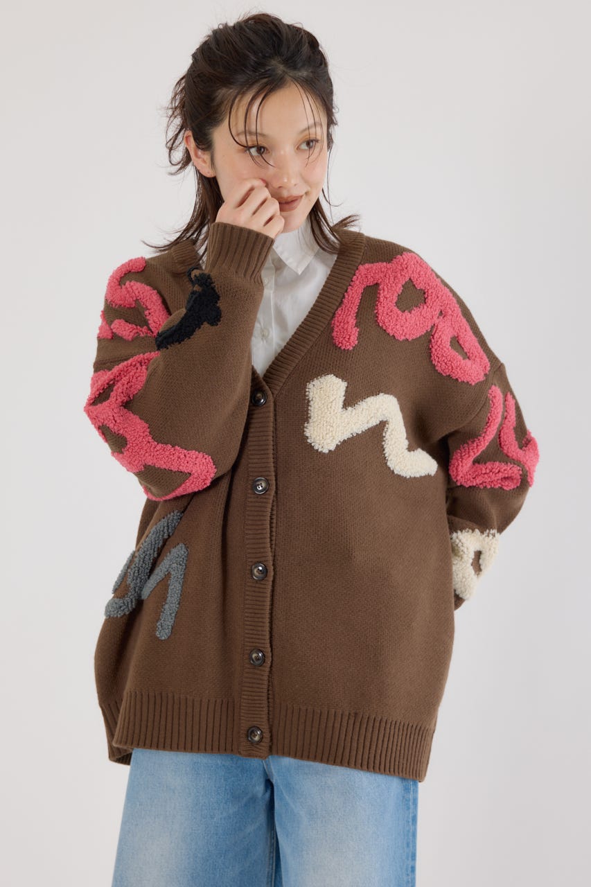 キャッチーなメッセージロゴを入れたモノグラム柄のネックニットカーディガン。