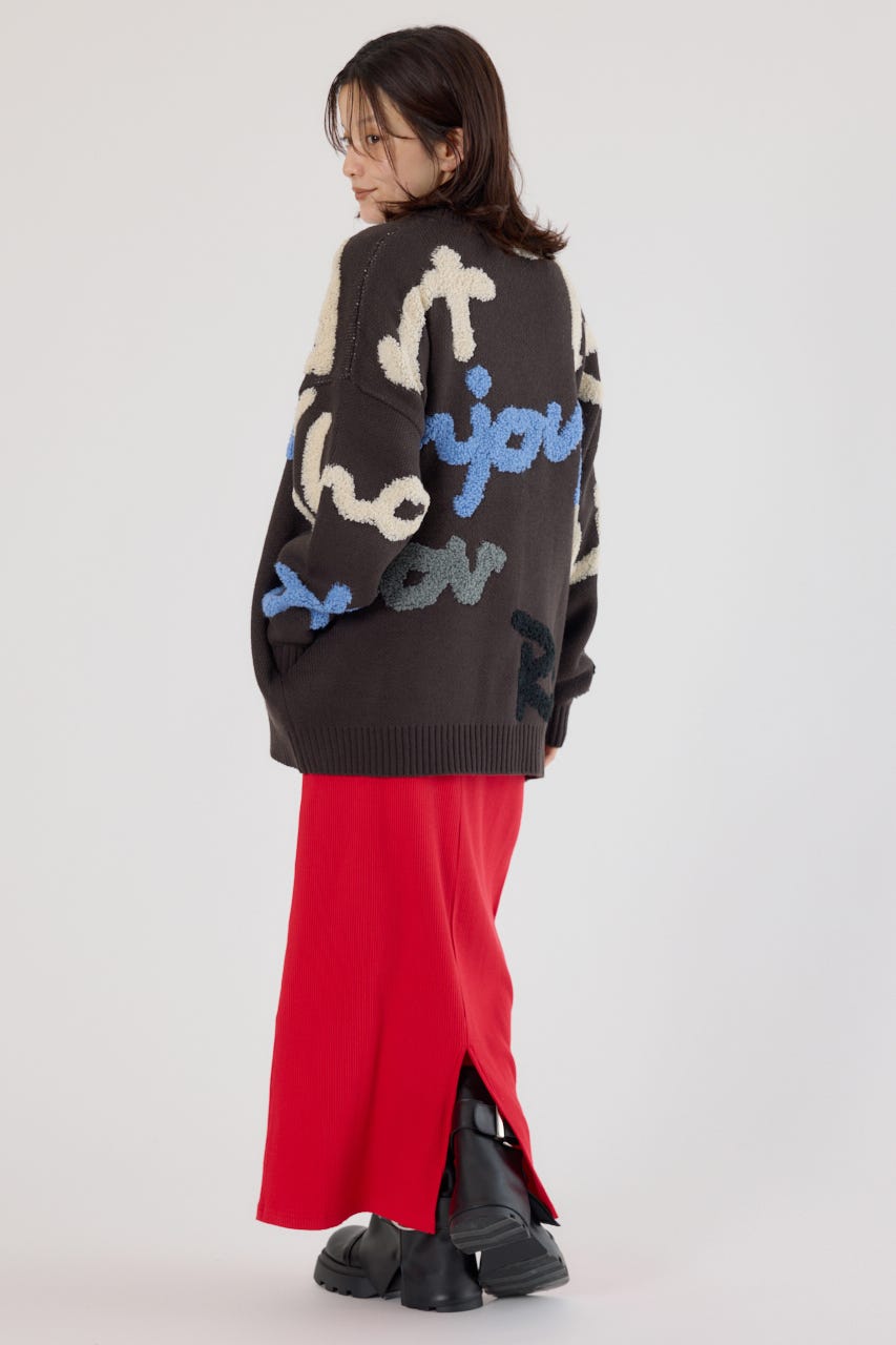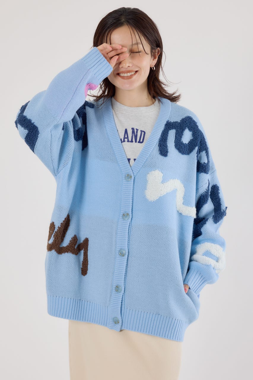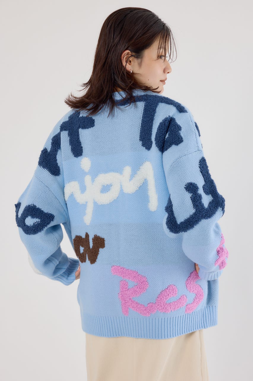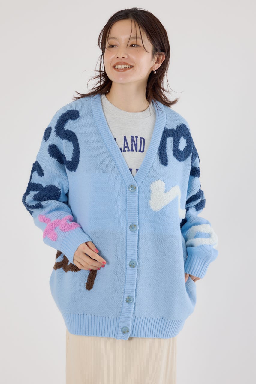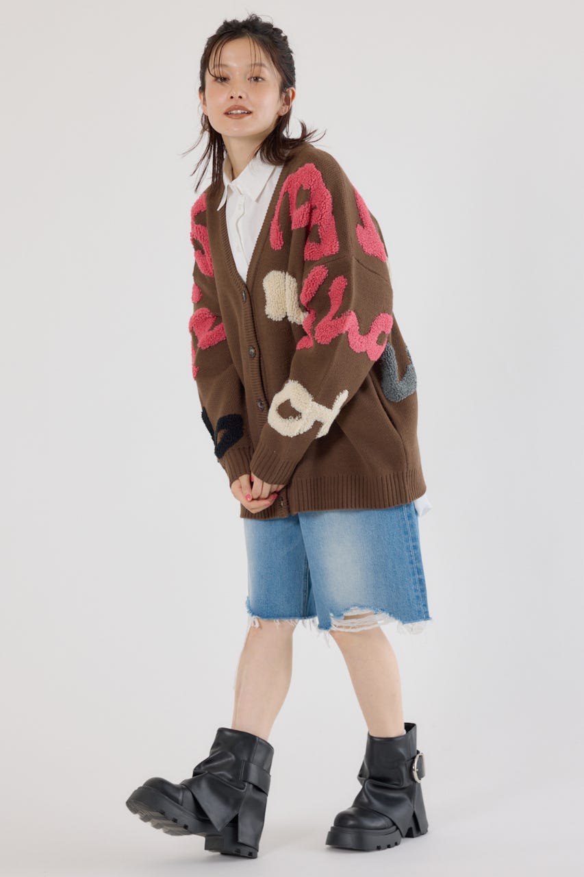 キャッチーなメッセージロゴを入れたモノグラム柄のネックニットカーディガン。