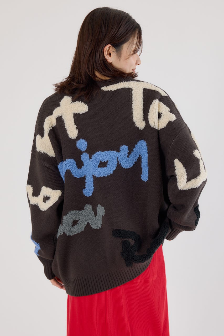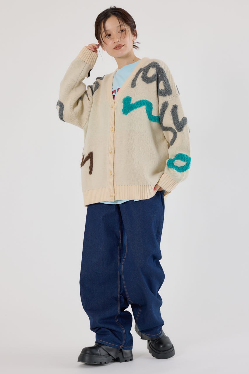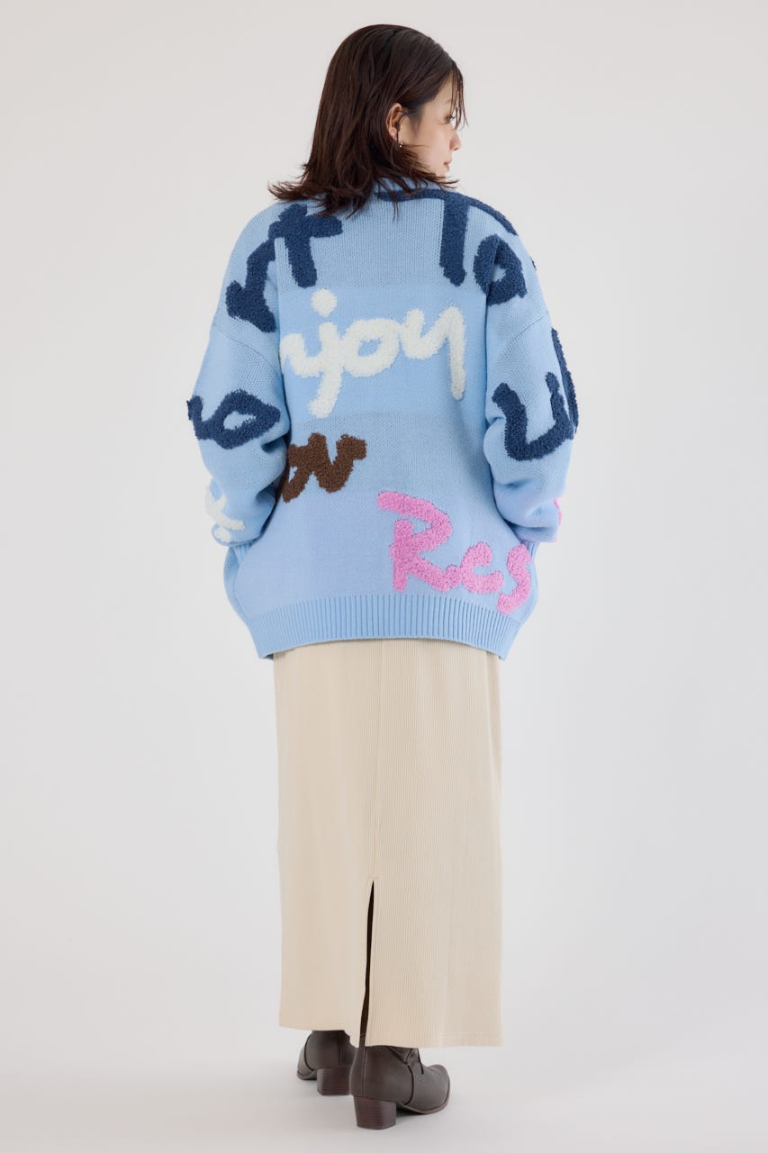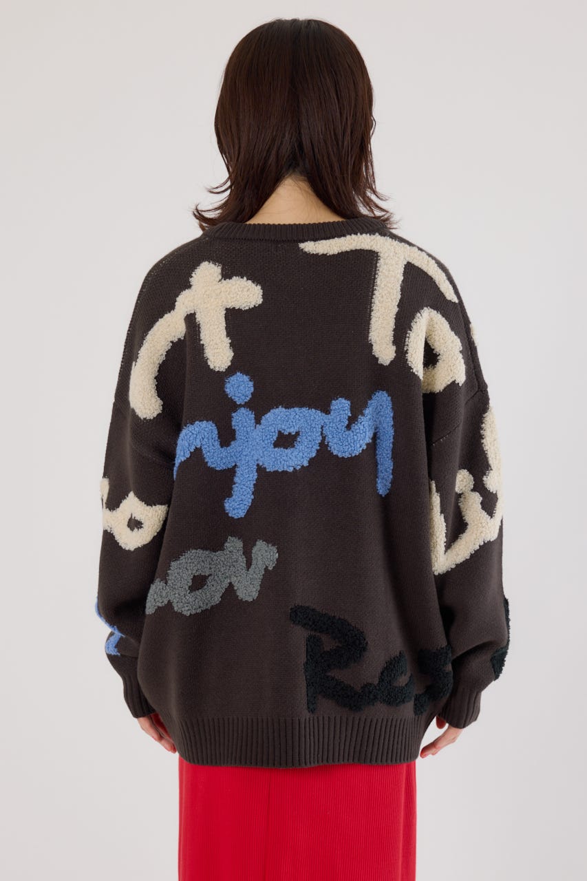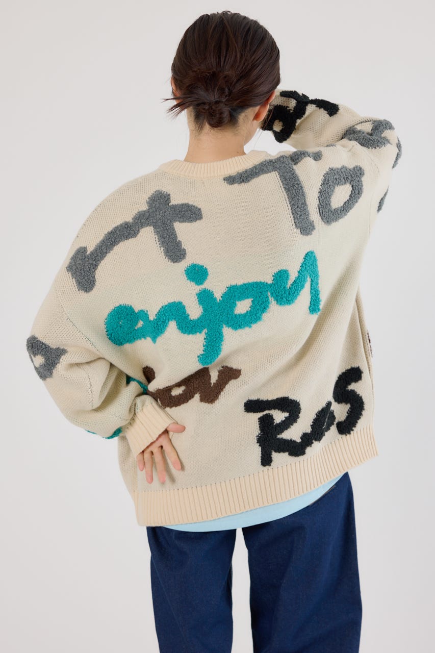 キャッチーなメッセージロゴを入れたモノグラム柄のネックニットカーディガン。