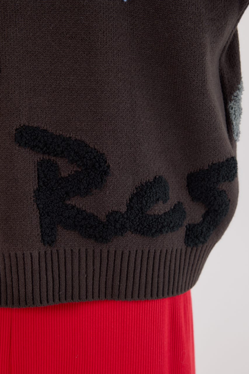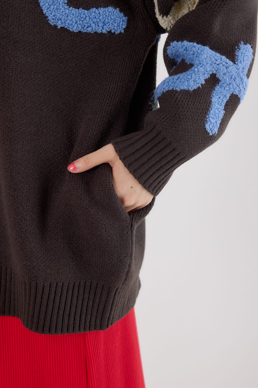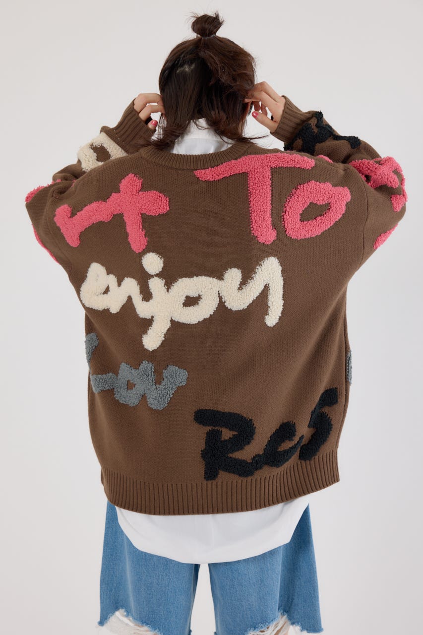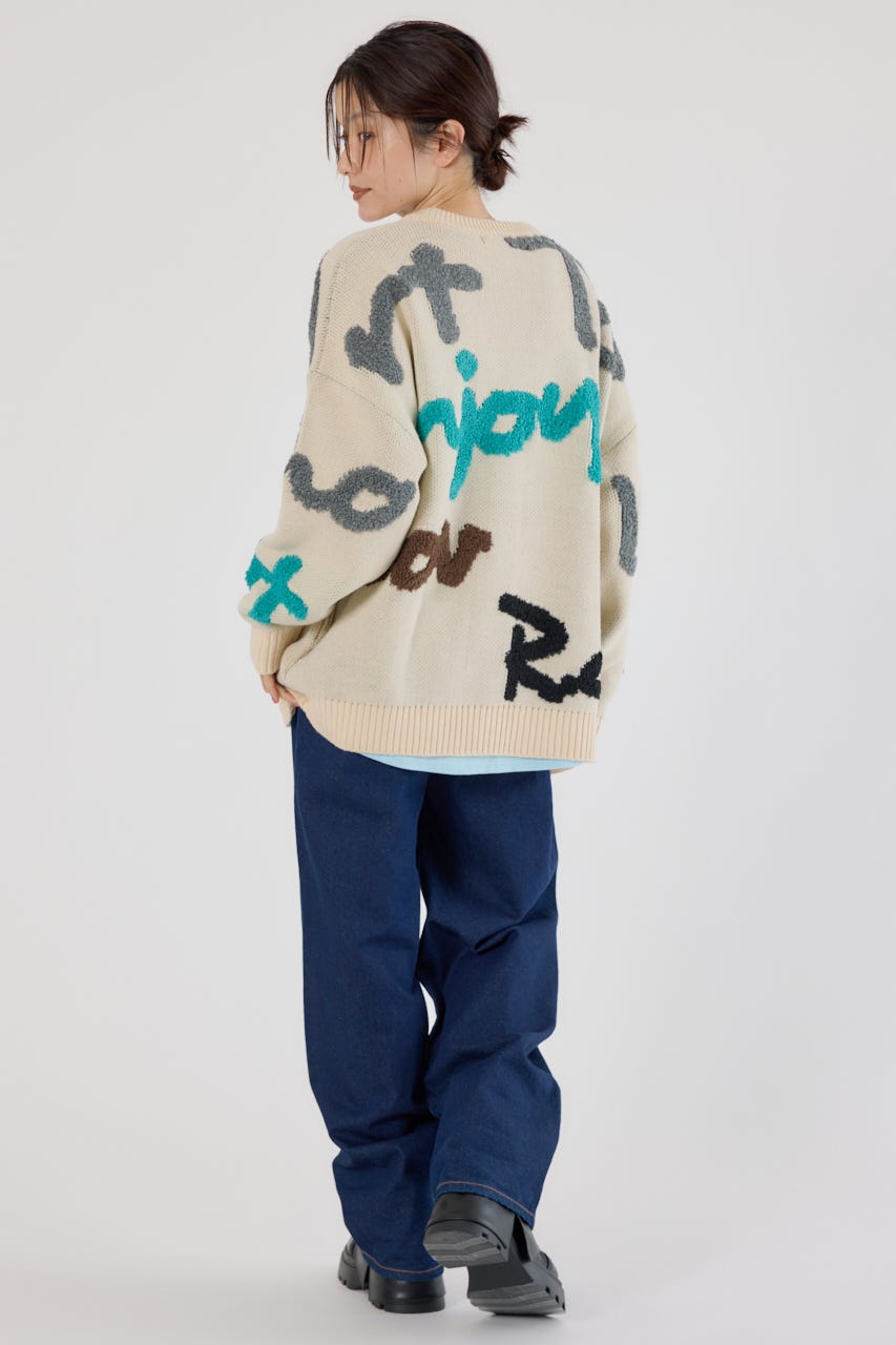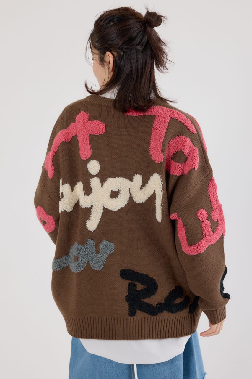 キャッチーなメッセージロゴを入れたモノグラム柄のネックニットカーディガン。