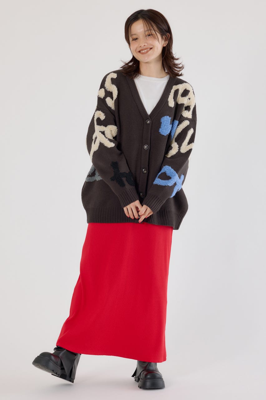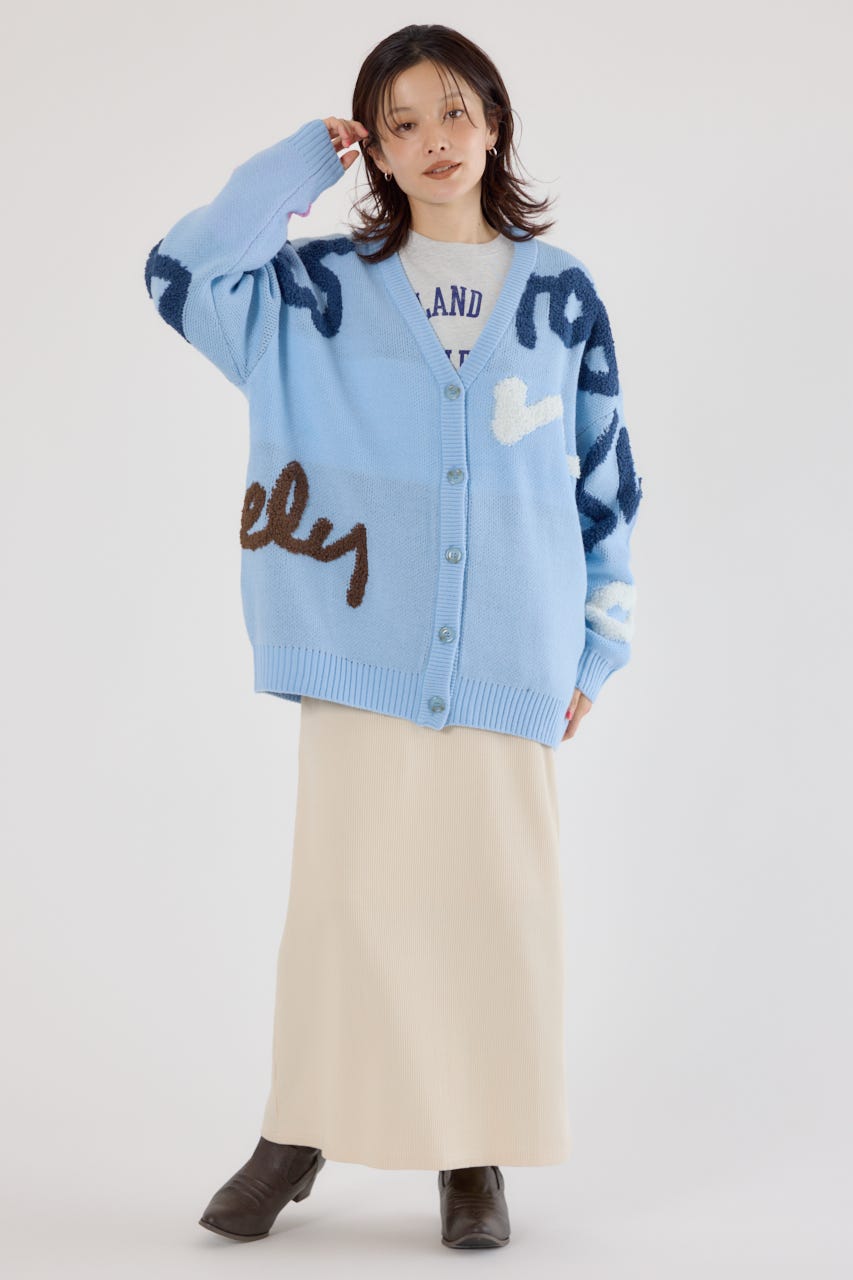 メッセージ柄のカーディガンは主役になるアイテムなので、シンプルなボトムとの合わせがおすすめ。