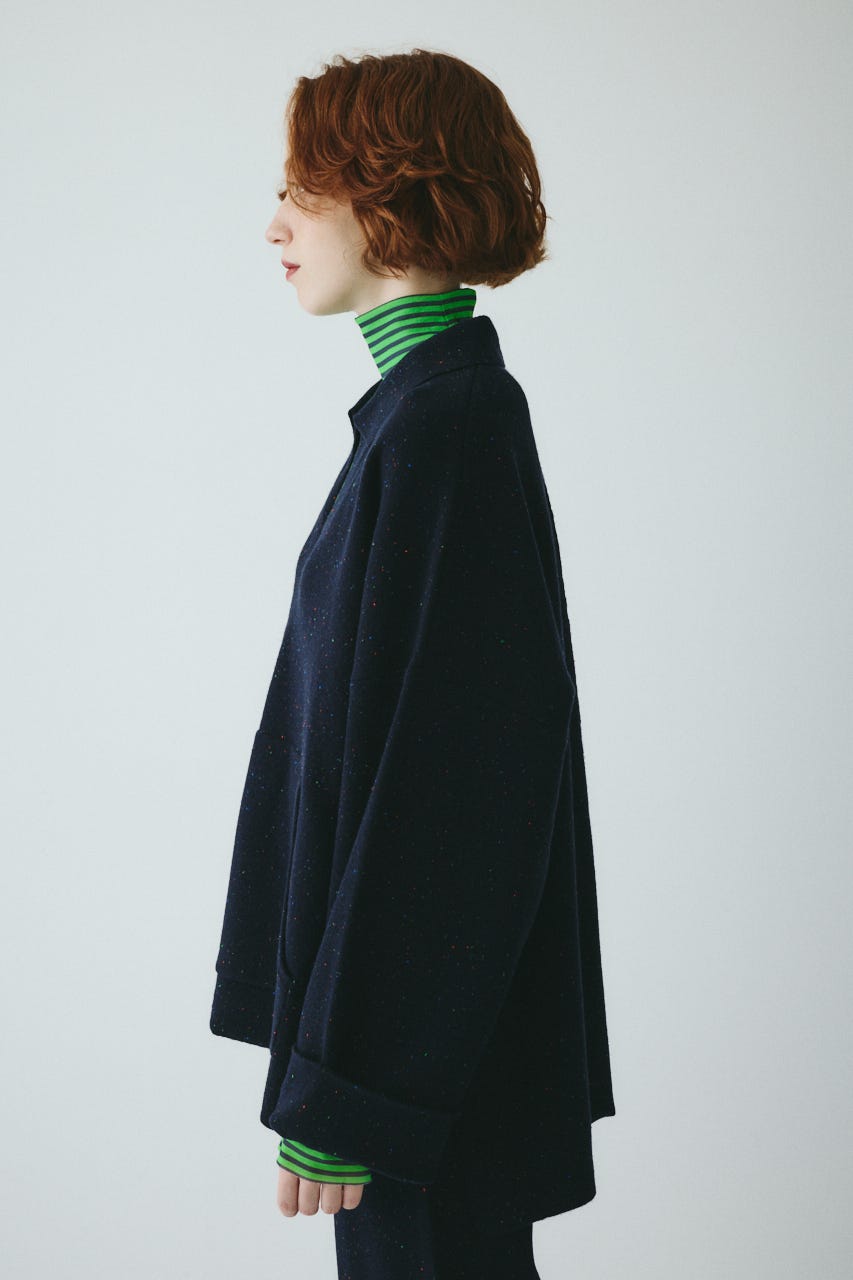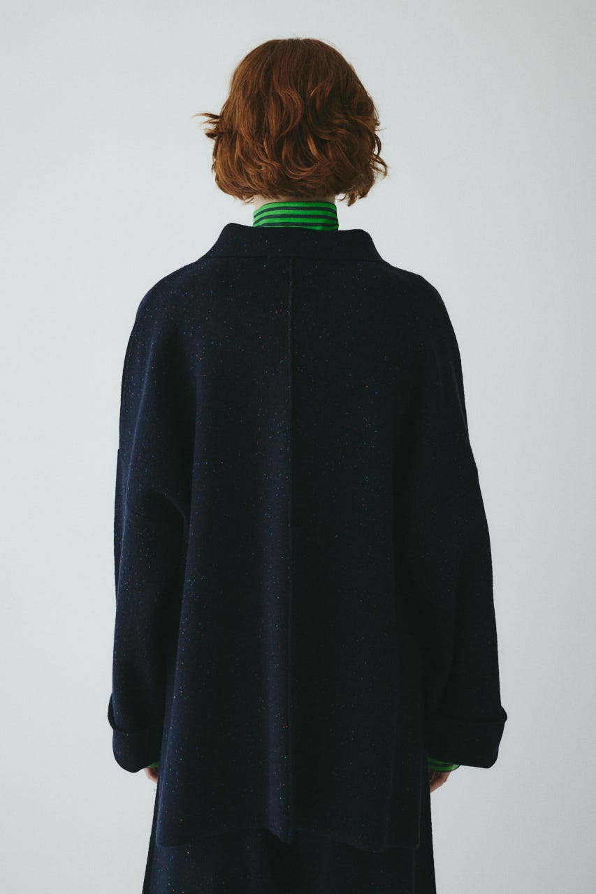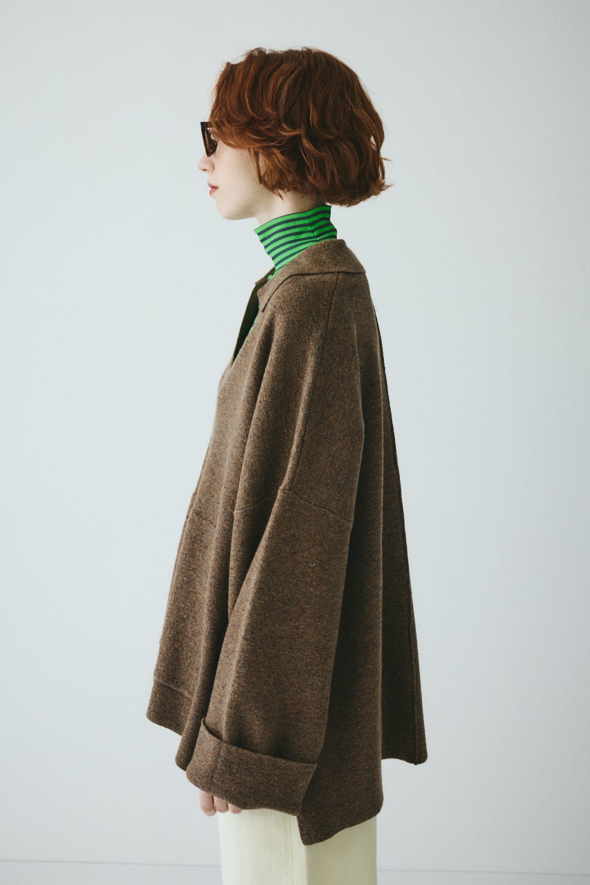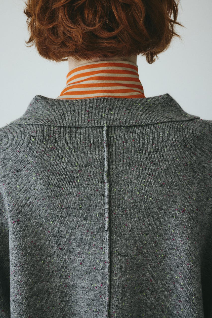 立体感のある袖やウエスト部分のライン、ヒップまで隠れるシルエットなど、立体感のあるフォルムを意識した作りとなっており、温かみのあるカラーMIXのネップヤーンを用いて、肉感のある接結編みに仕立てています。