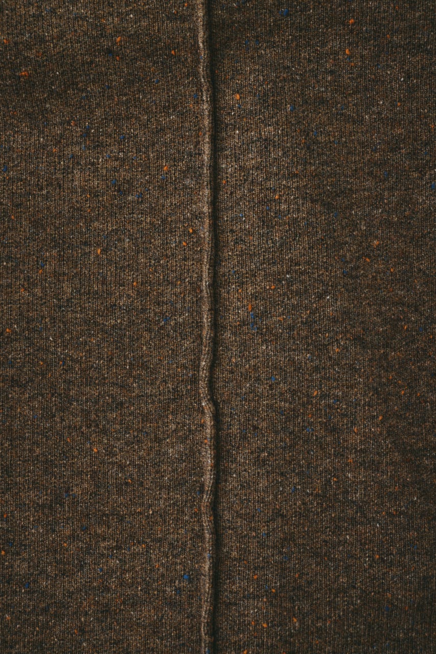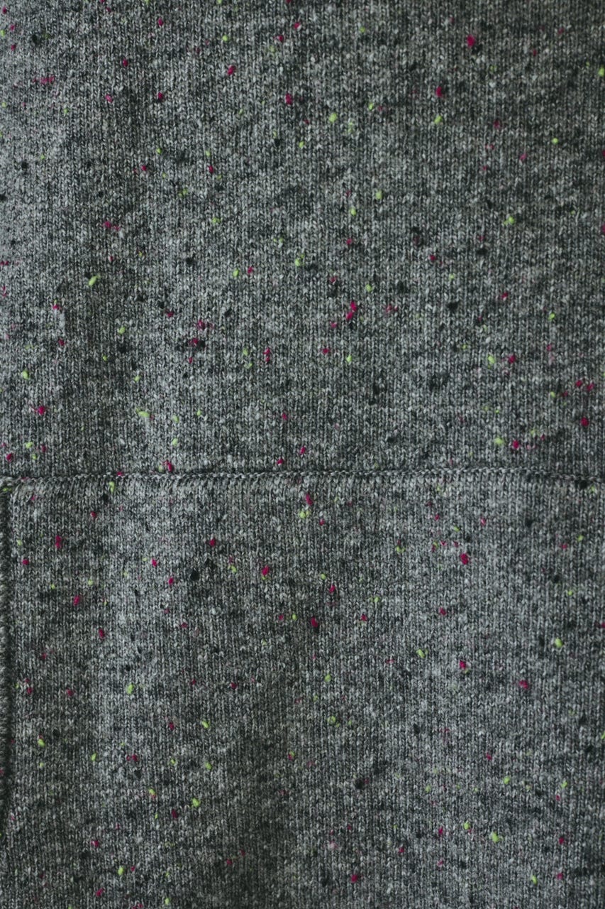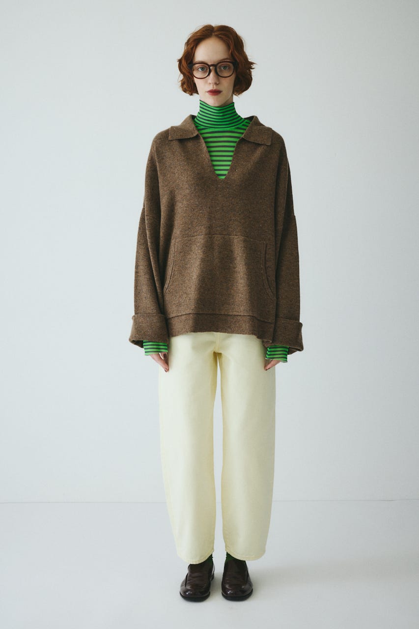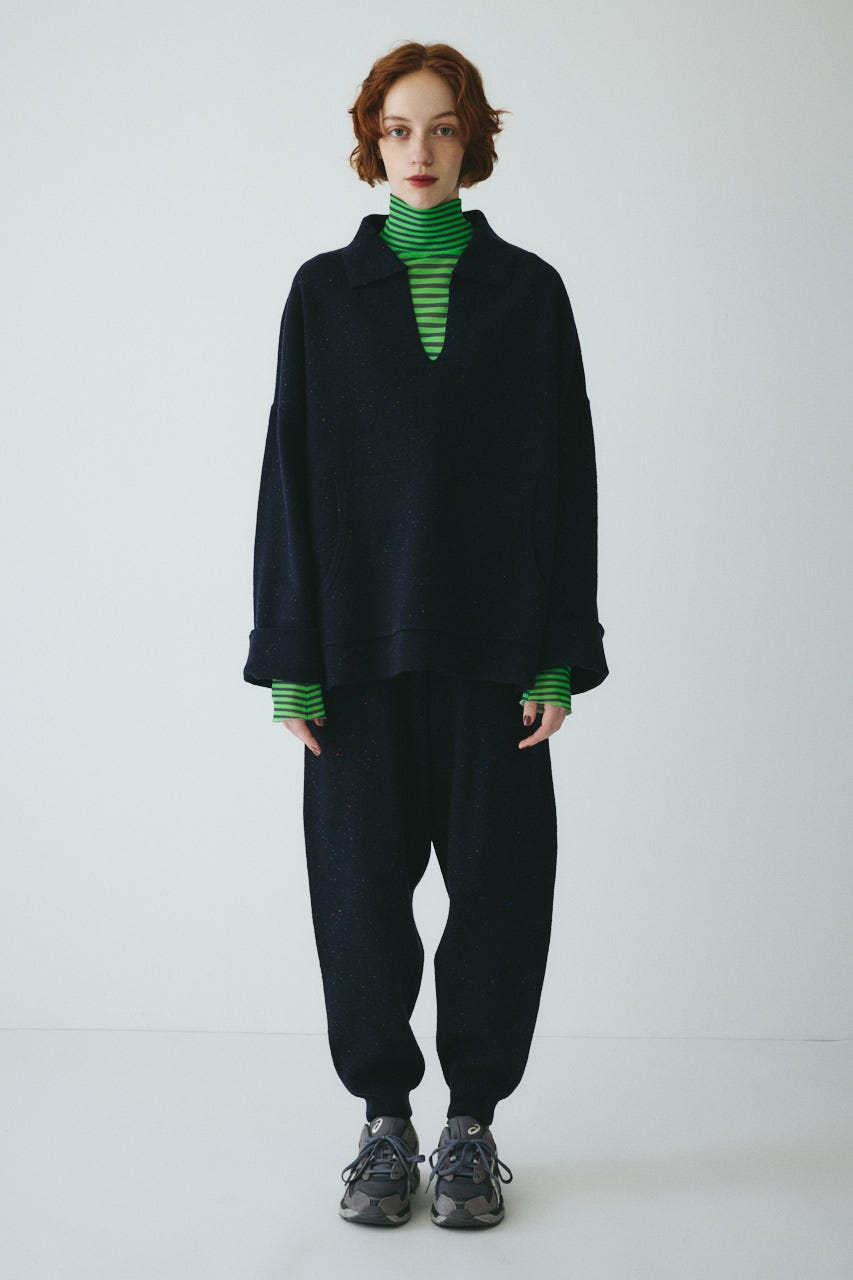 立体感のある袖やウエスト部分のライン、ヒップまで隠れるシルエットなど、立体感のあるフォルムを意識した作りとなっており、温かみのあるカラーMIXのネップヤーンを用いて、肉感のある接結編みに仕立てています。