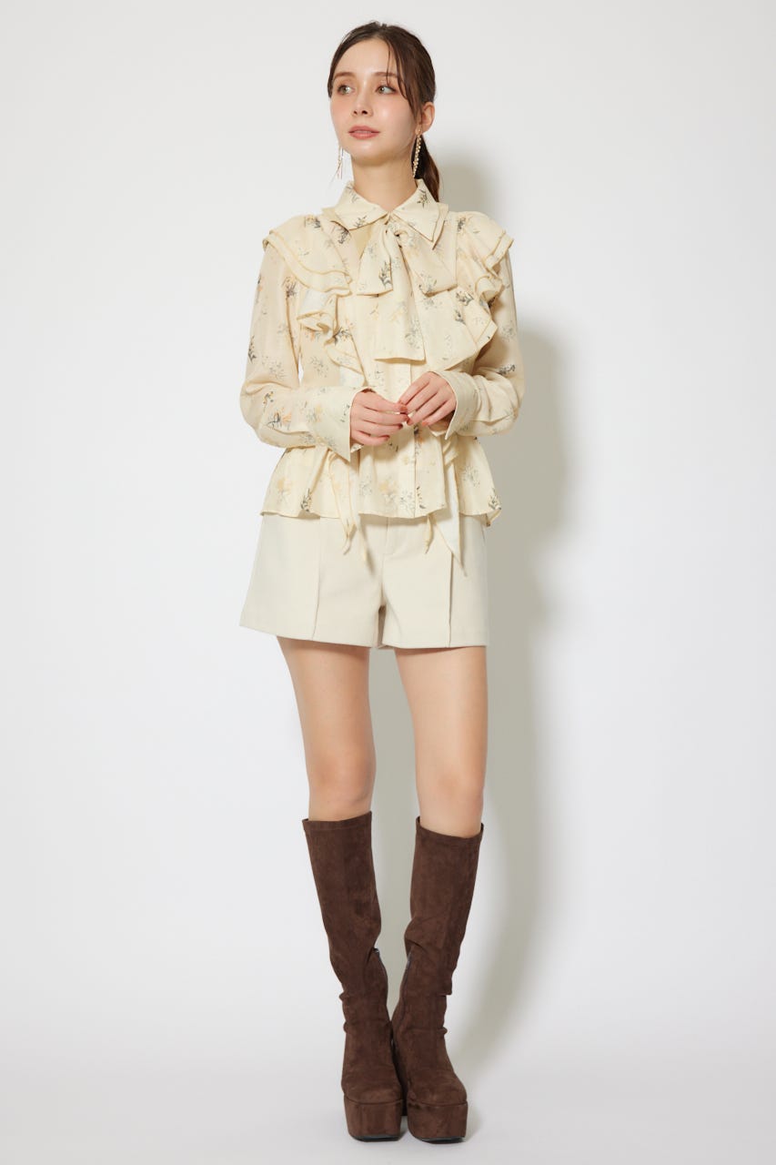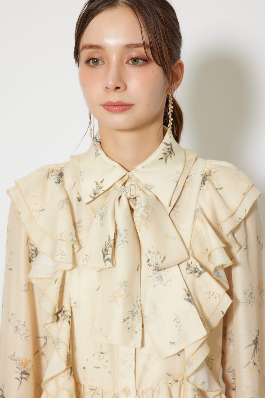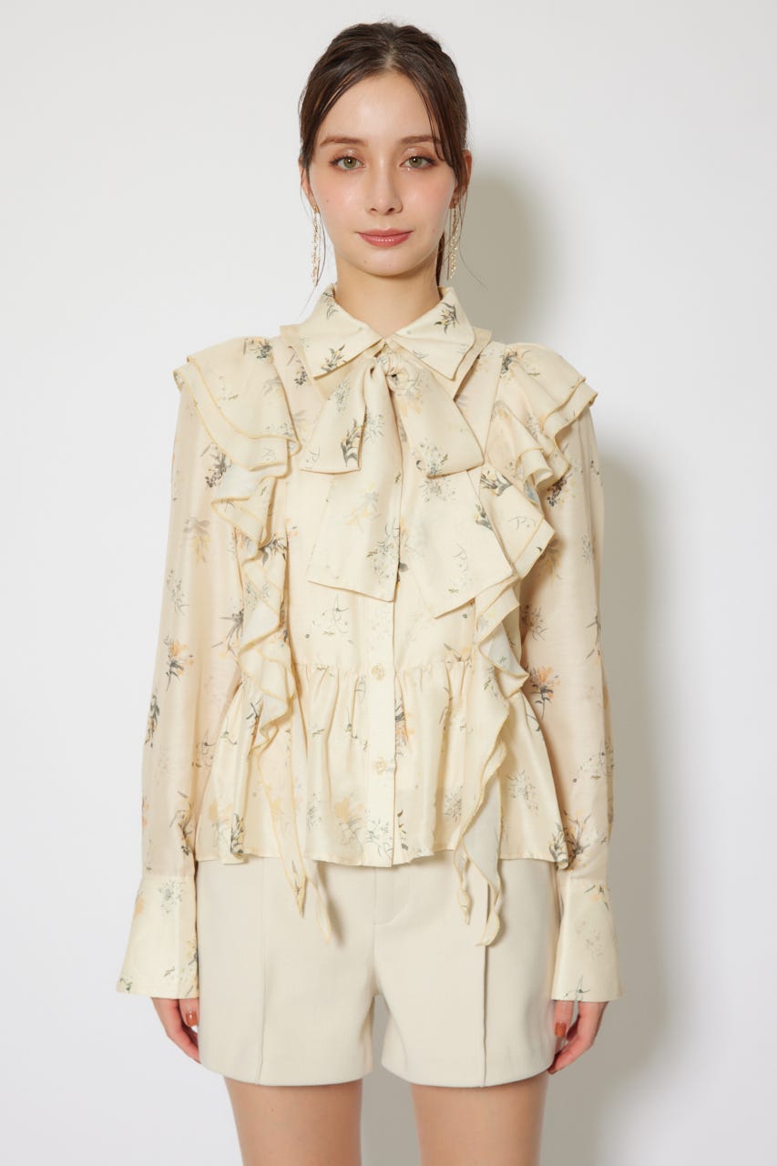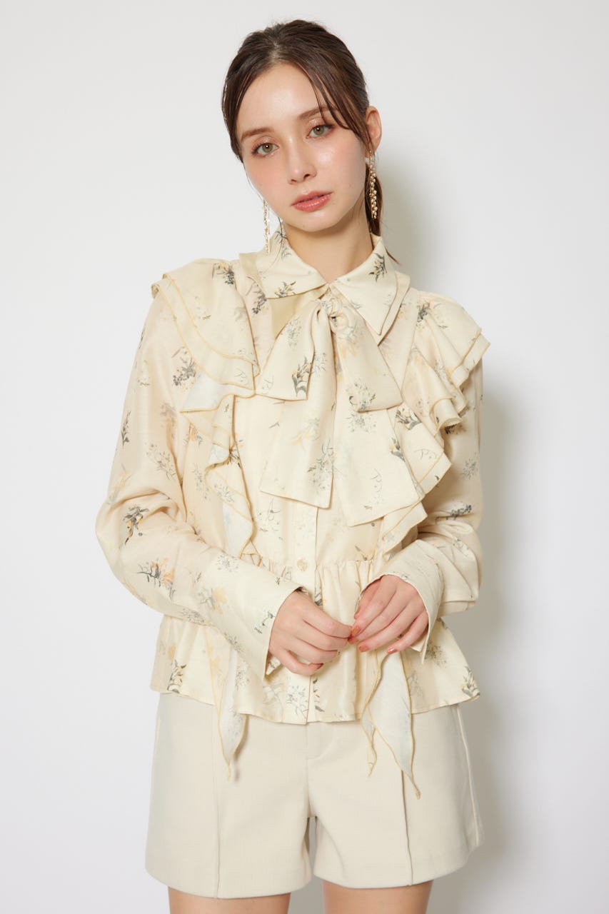 ふんだんにあしらったフリルとクラシカルなボウタイデザインが華やかな印象を与えるブラウス。