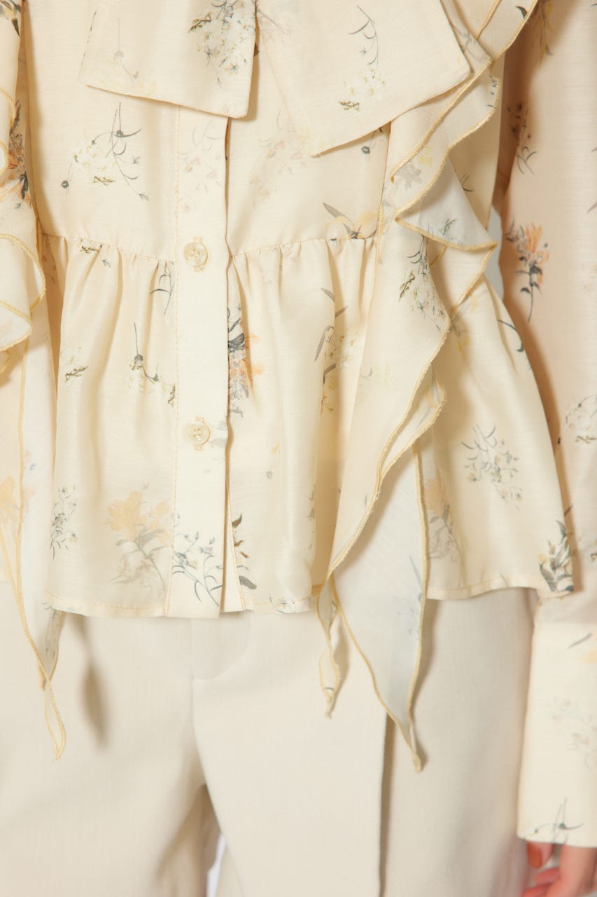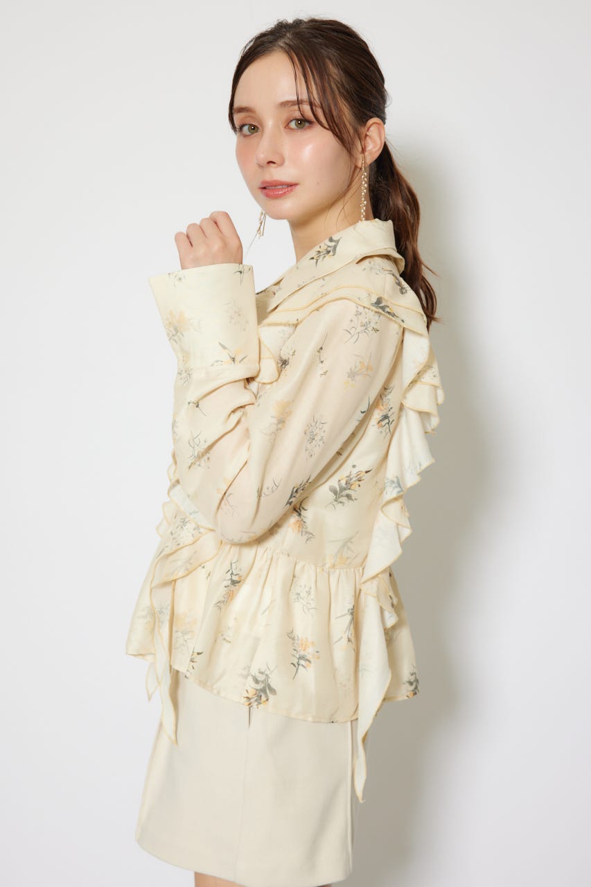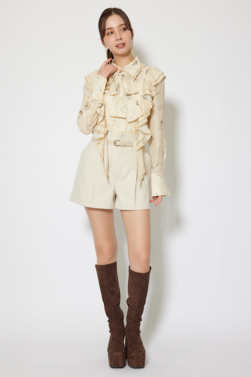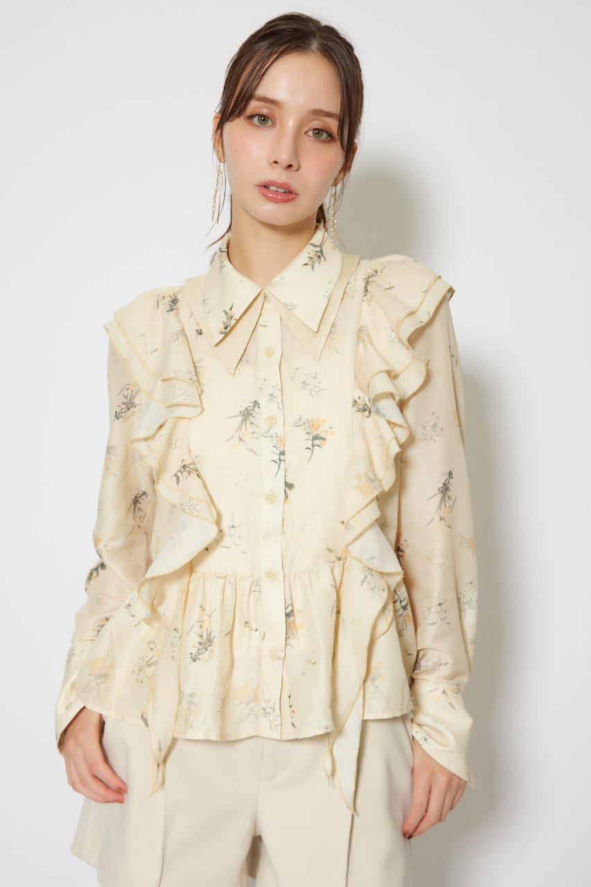 ふんだんにあしらったフリルとクラシカルなボウタイデザインが華やかな印象を与えるブラウス。