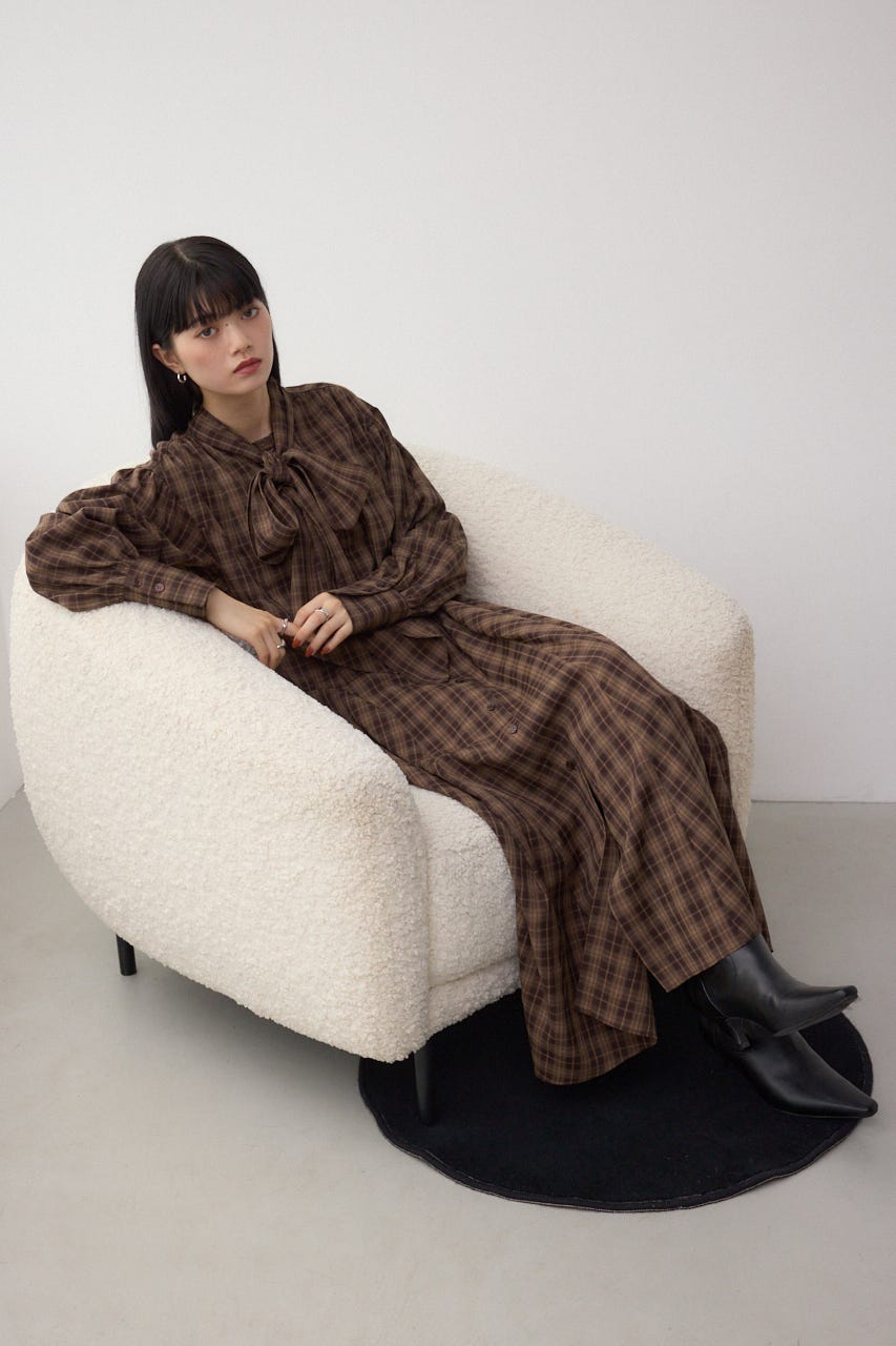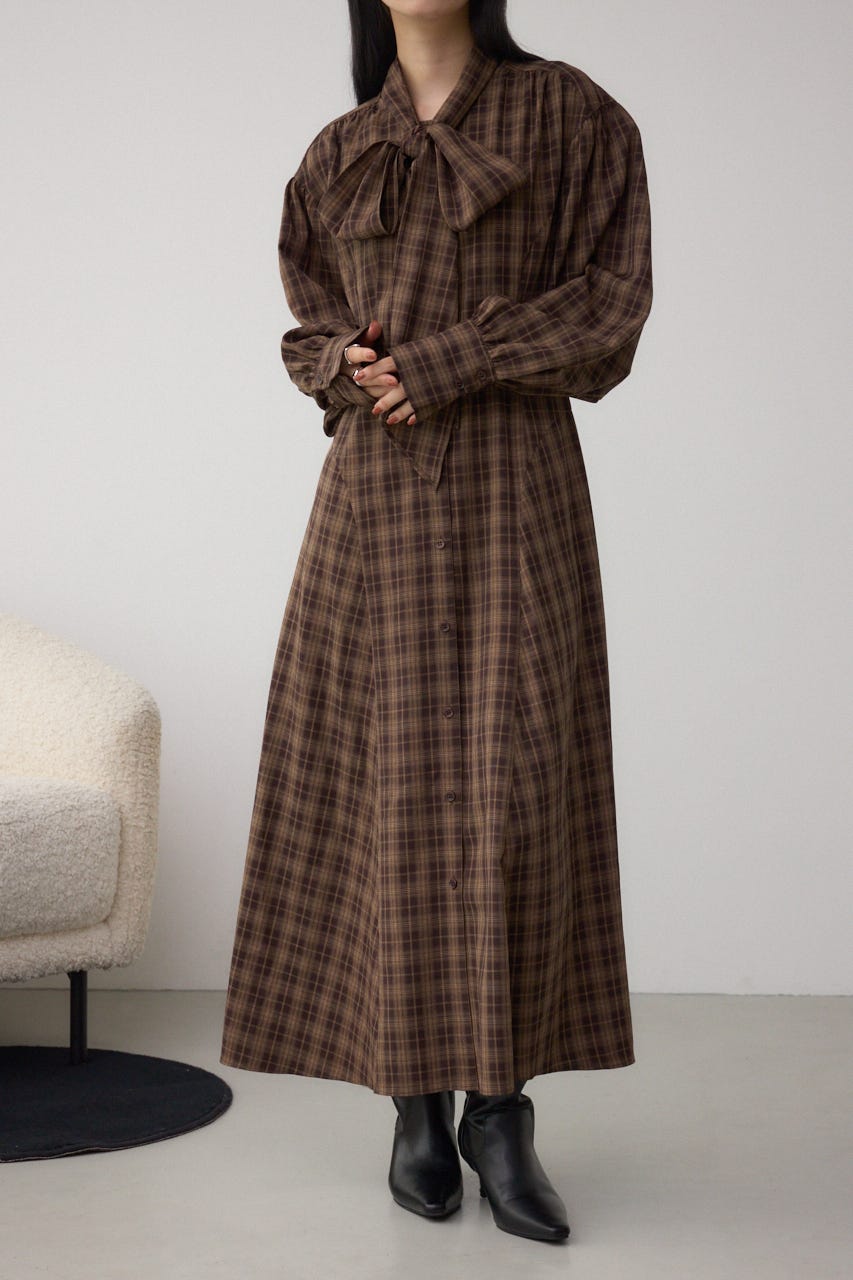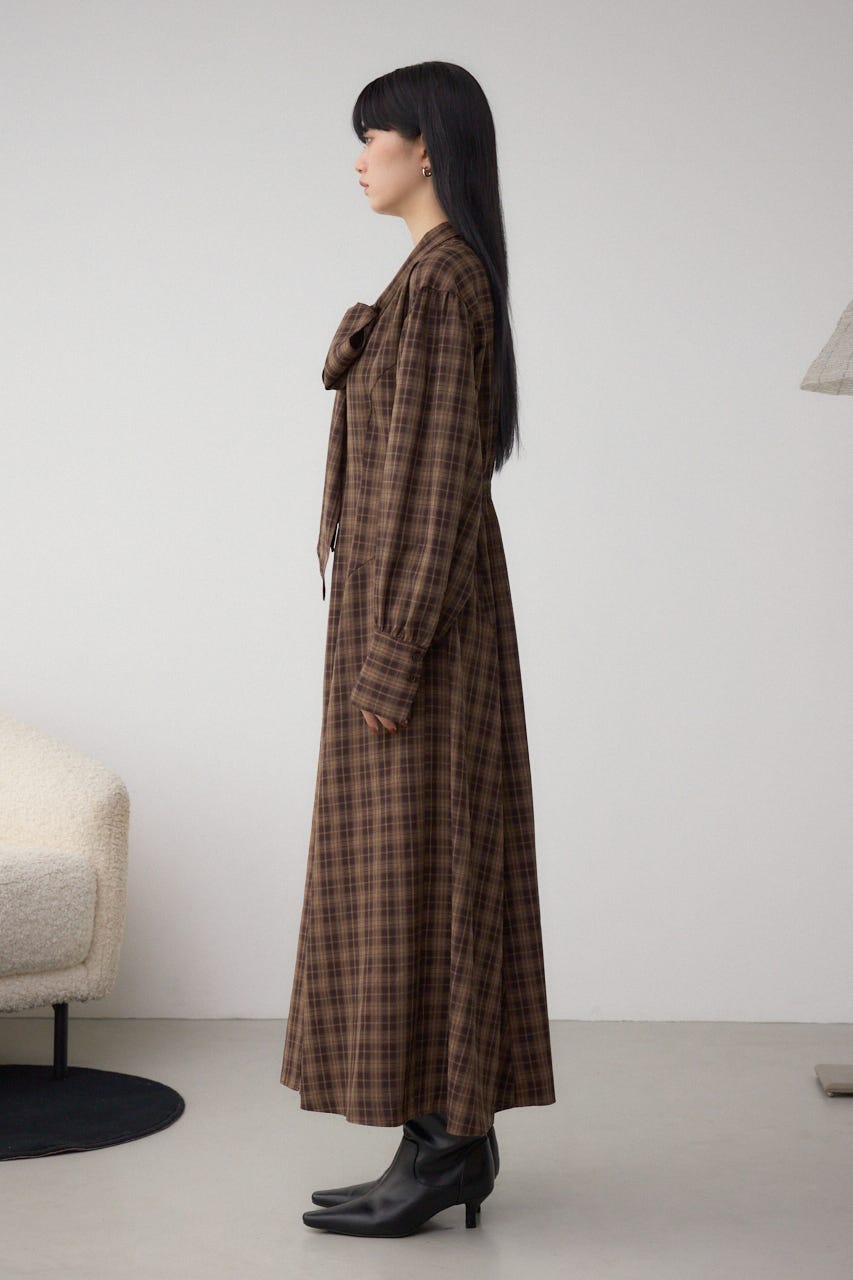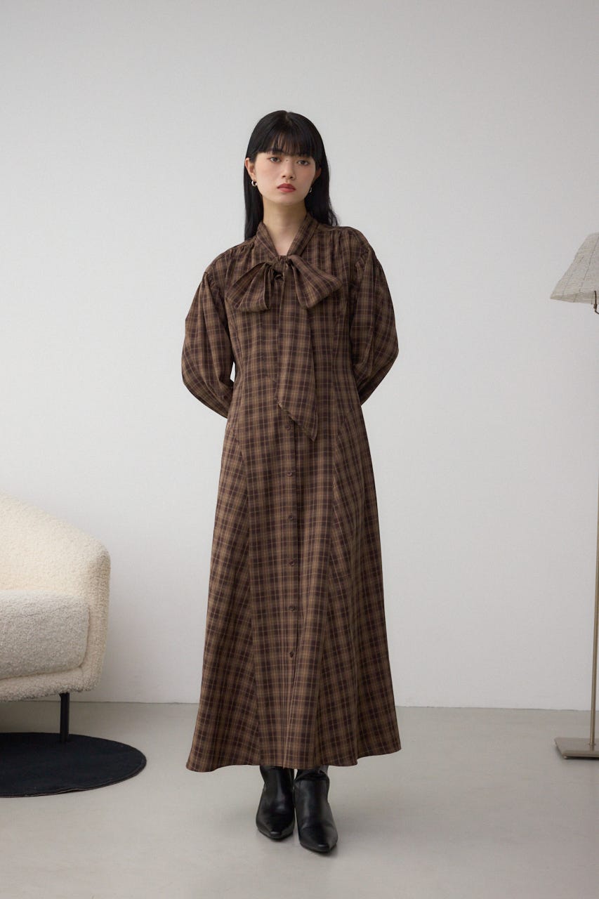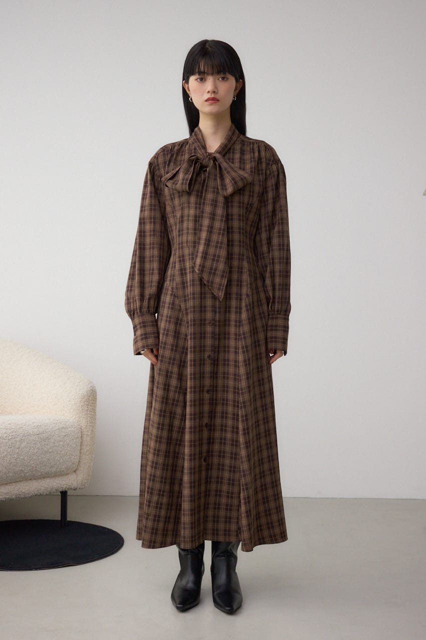 秋冬に注目のボウタイデザインのクラシカルムード漂うチェック柄ワンピース。
