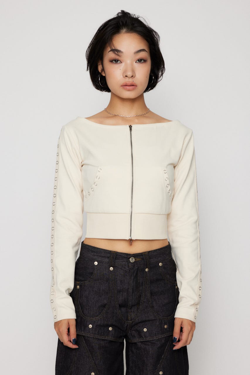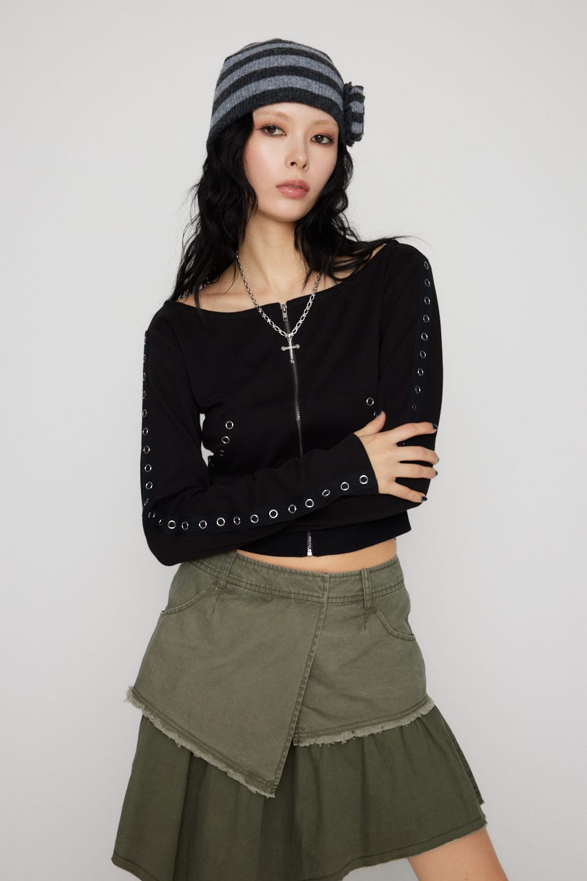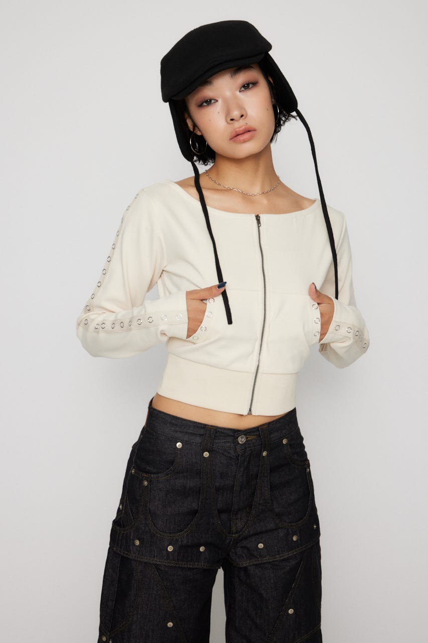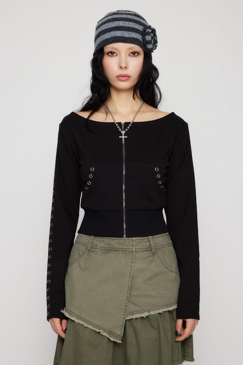 ■POINT:袖のハトメデザインが目を惹く、オフショルダートップス。