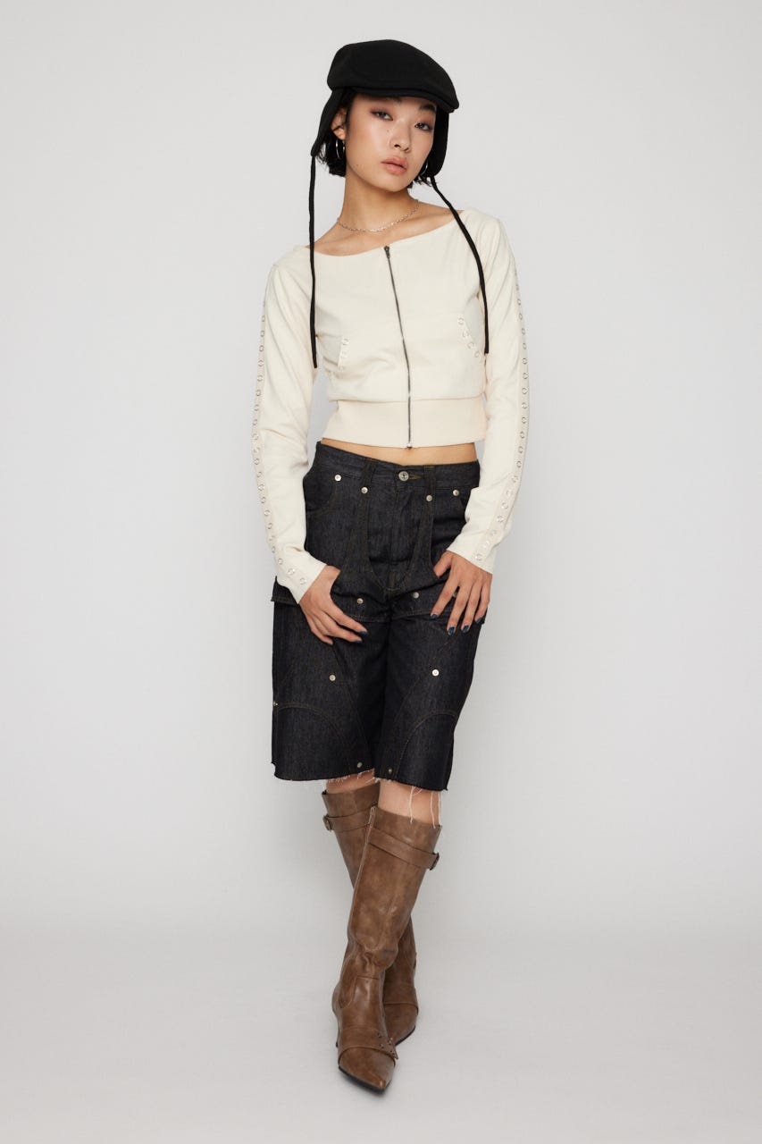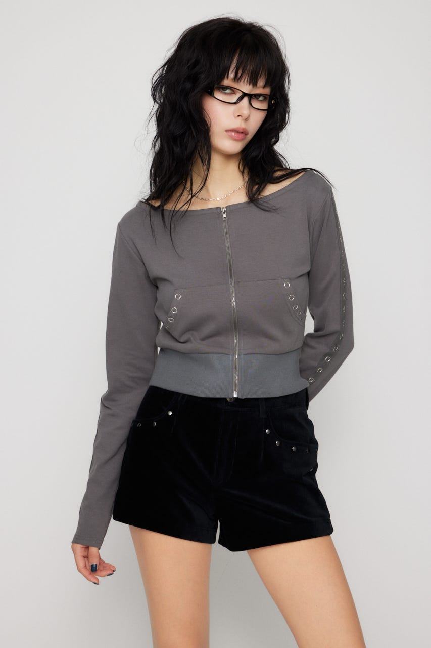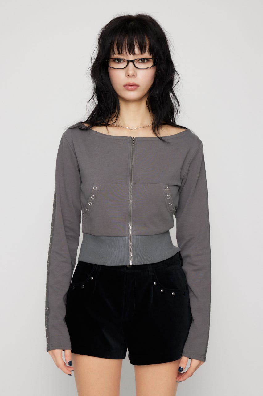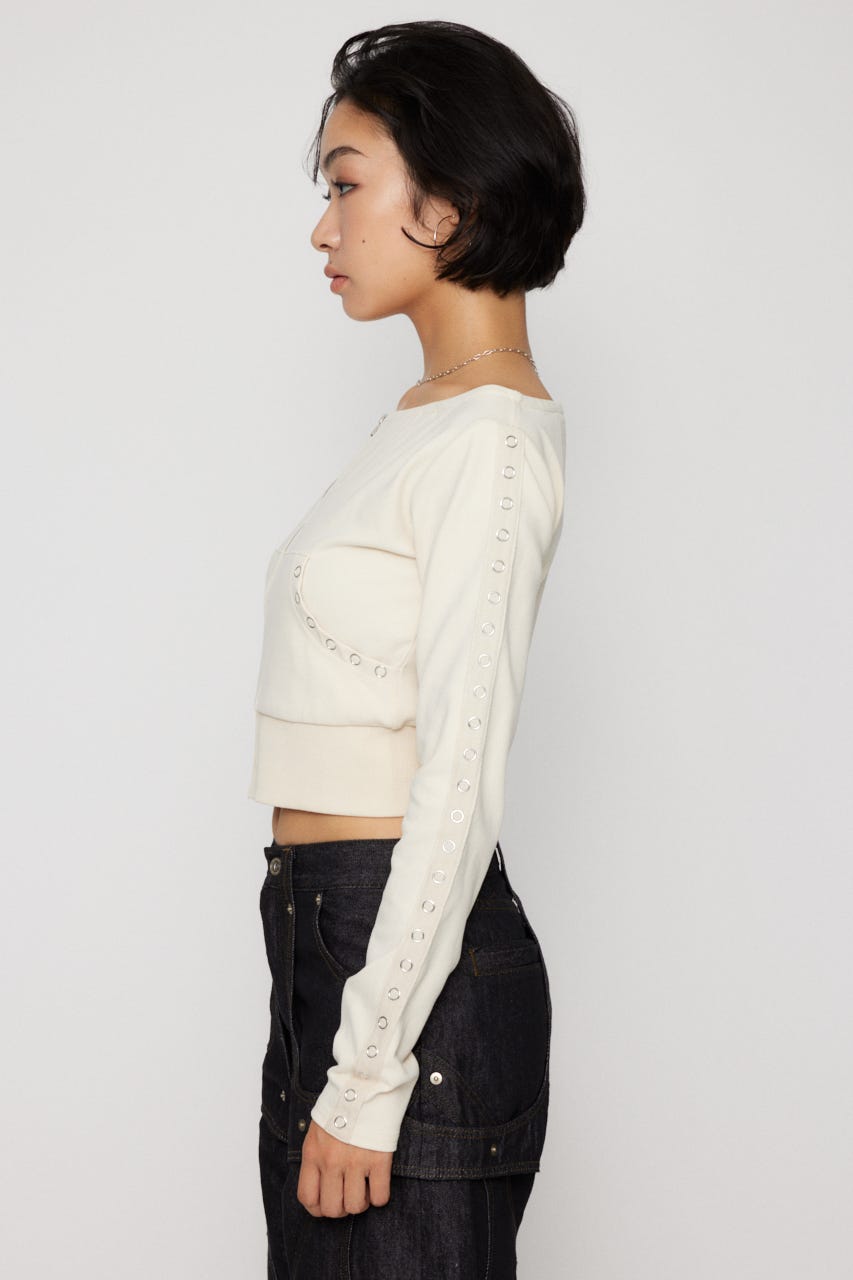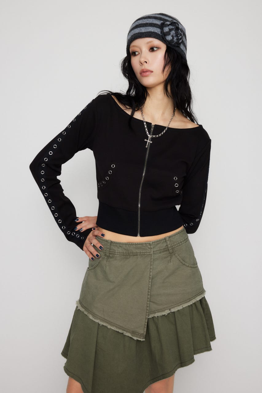 ■POINT:袖のハトメデザインが目を惹く、オフショルダートップス。