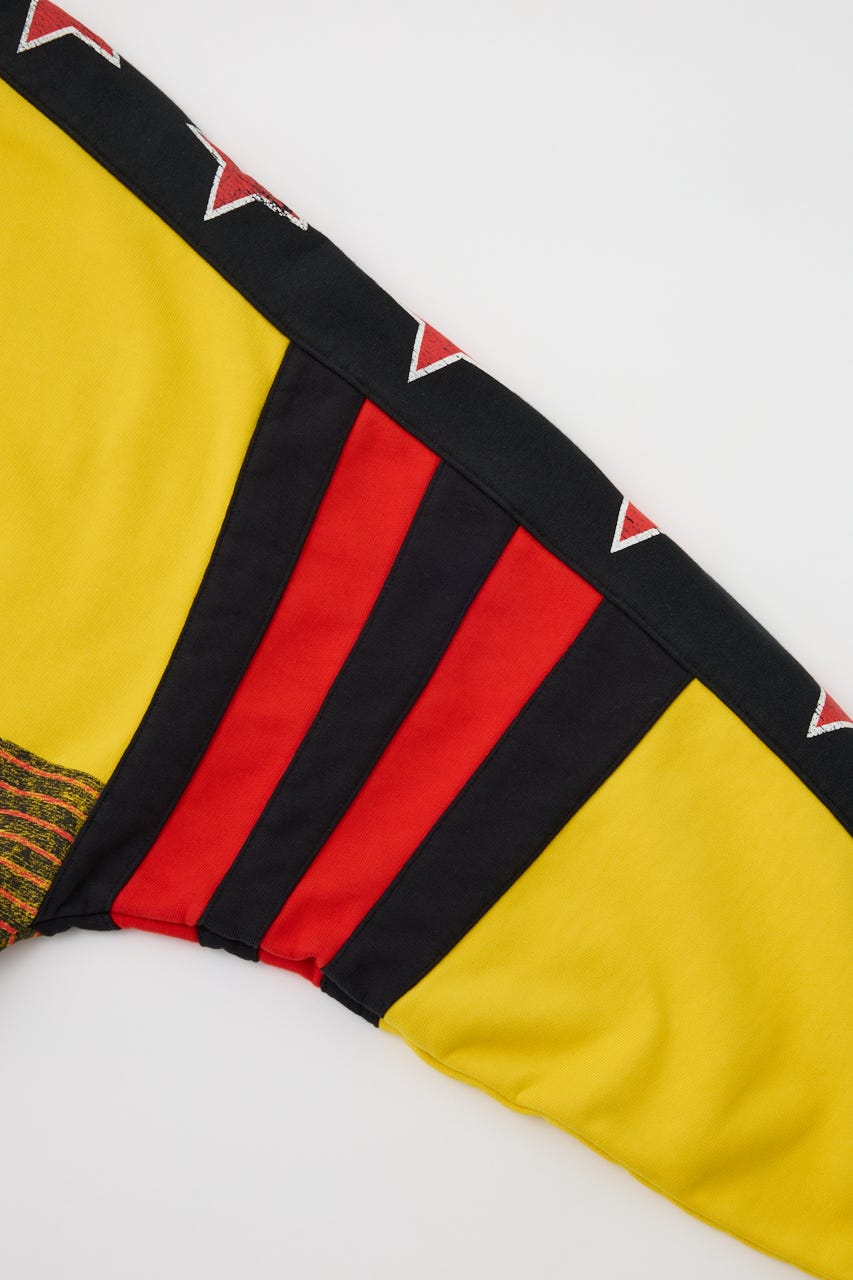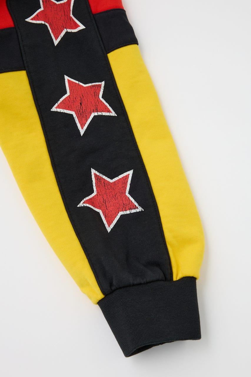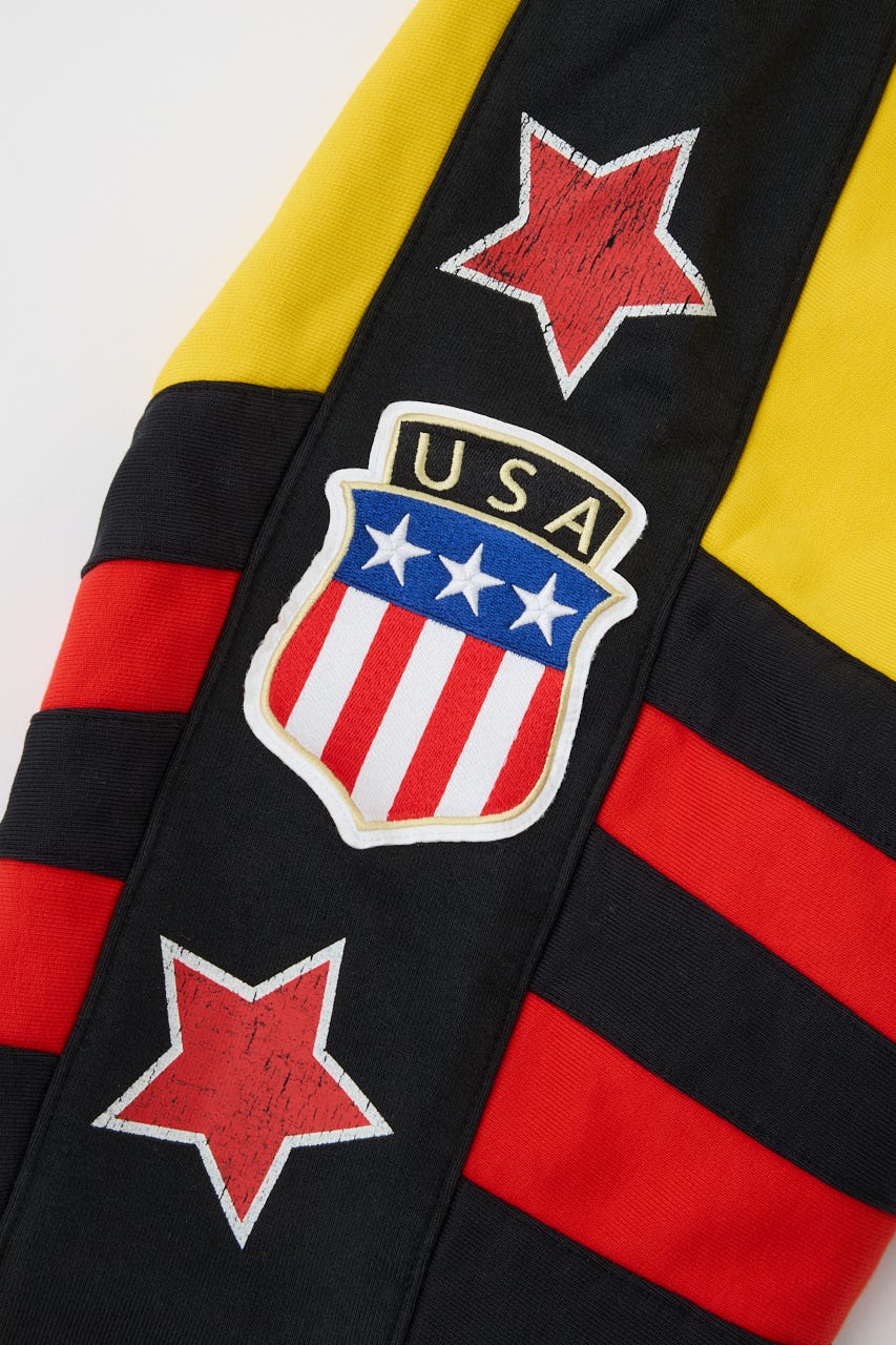 ゆったりとしたオーバーサイズのフォルムに、ビンテージサイクリングにインスパイアされたひときわ目を引くグラフィックと大胆な配色が施されている。