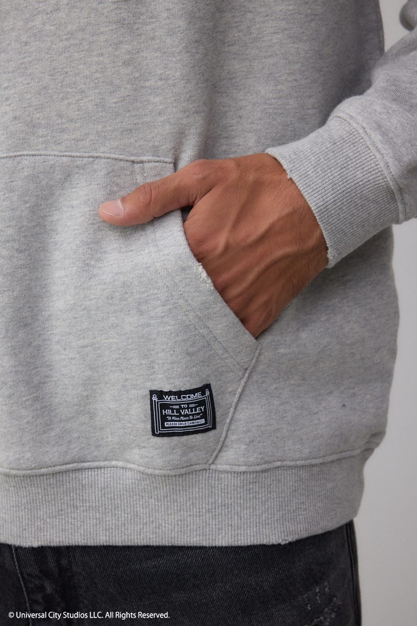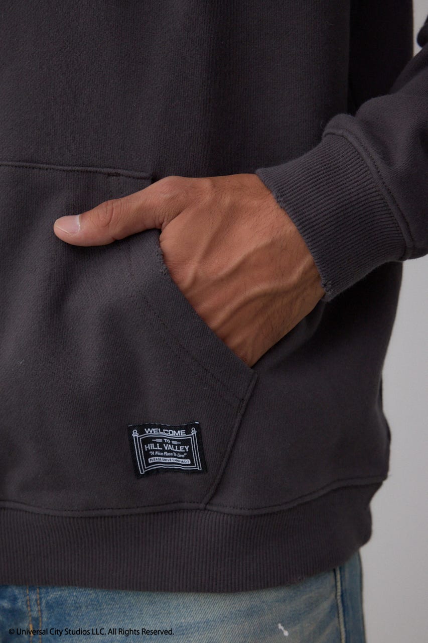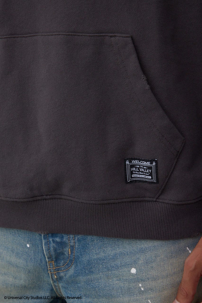 左裾にシリーズの舞台ヒル・バレーのピスネーム付き、男女問わずに着られるスウェットです。