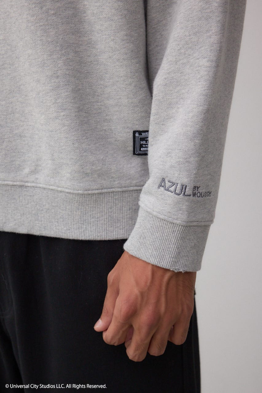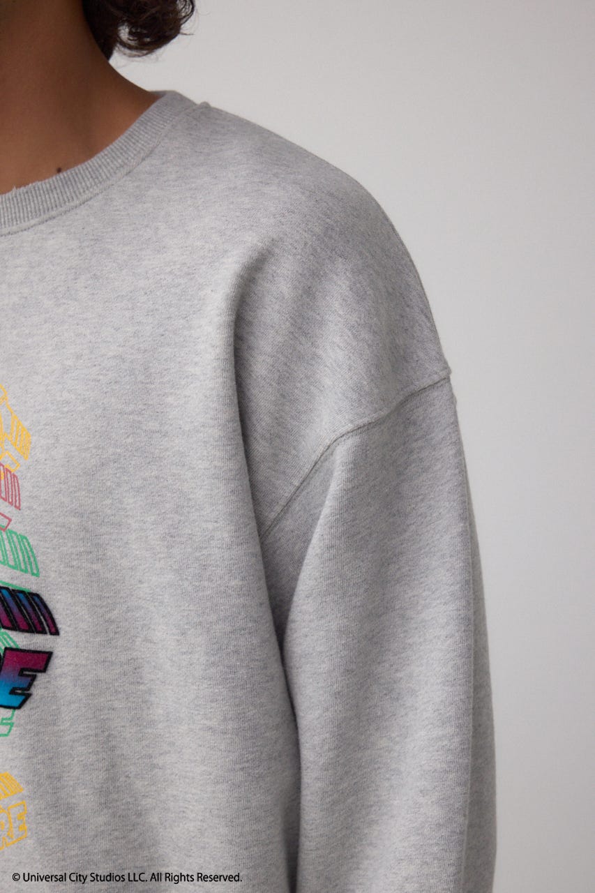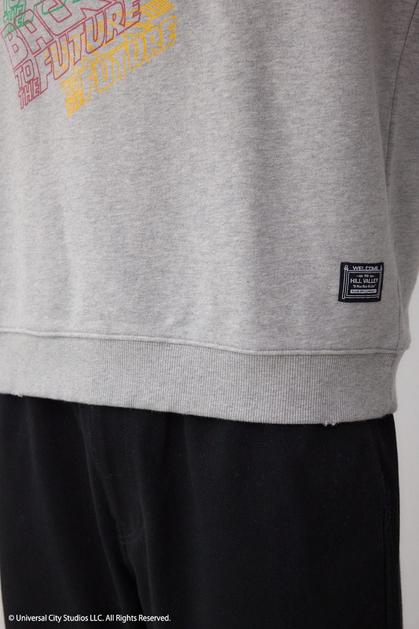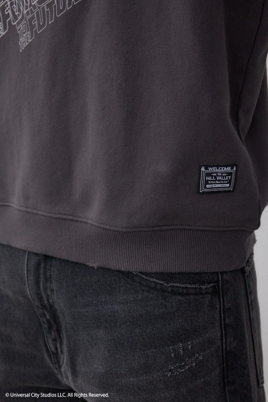 フロントに存在感があるフロッキープリント、左裾にシリーズの舞台ヒル・バレーのピスネーム付き、男女問わずに着られるスウェットです。
