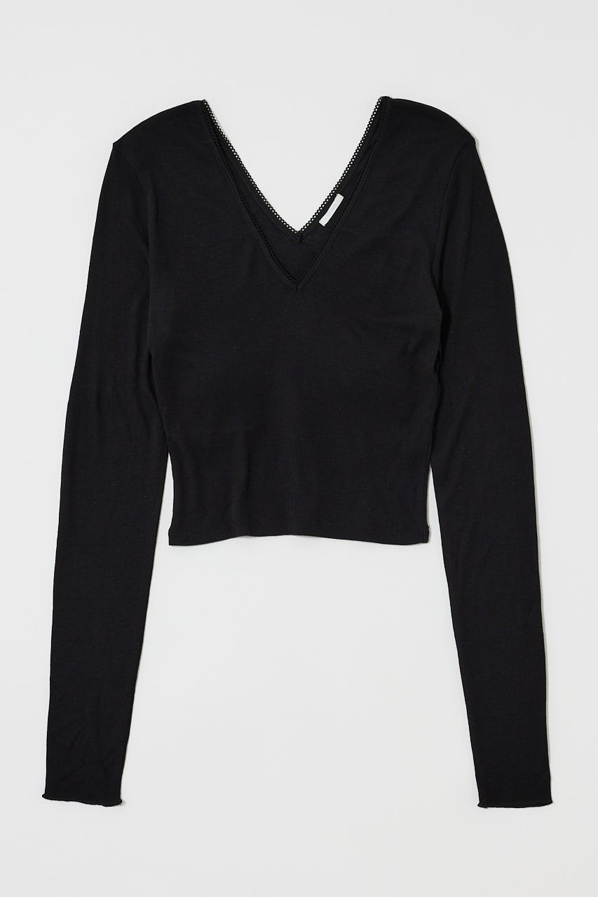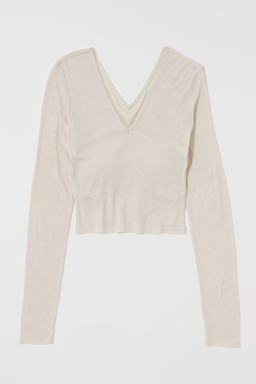 デコルテを美しく見せる深めのVネックに、繊細なピコレースをあしらったカットソーインナー。