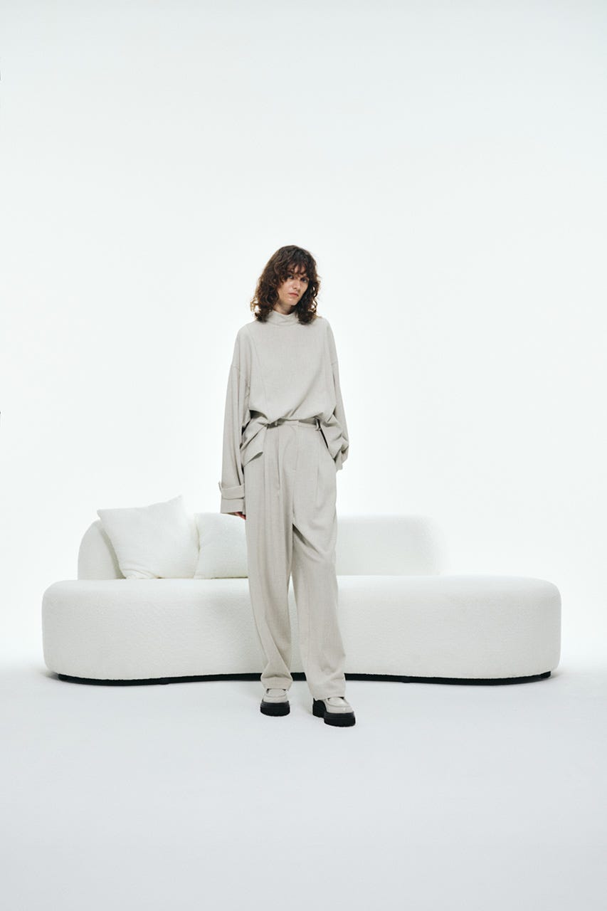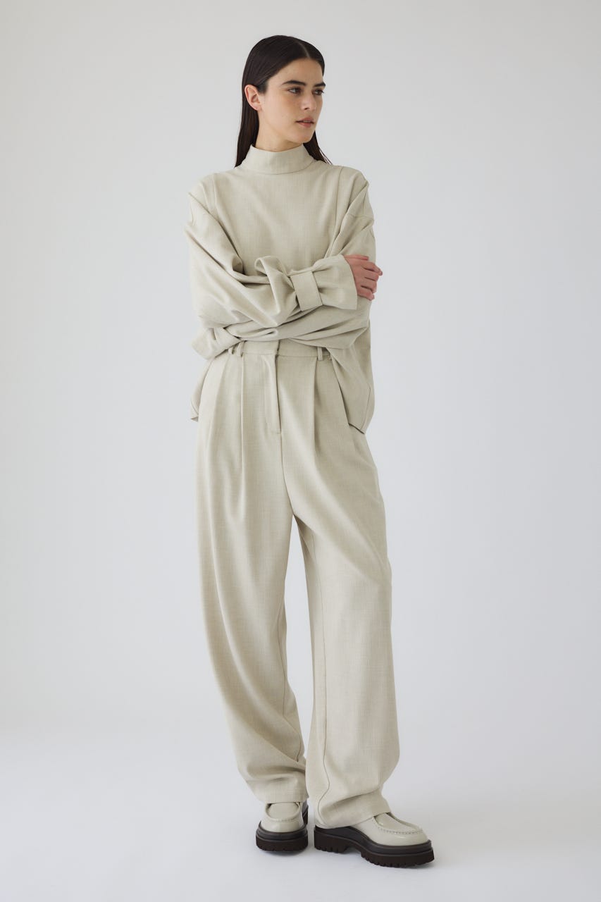 共地のプルオーバー(460JSL30-0161)と合わせたセットアップスタイルならオンオフ問わず活躍する洗練された着こなしが即座に完成します。