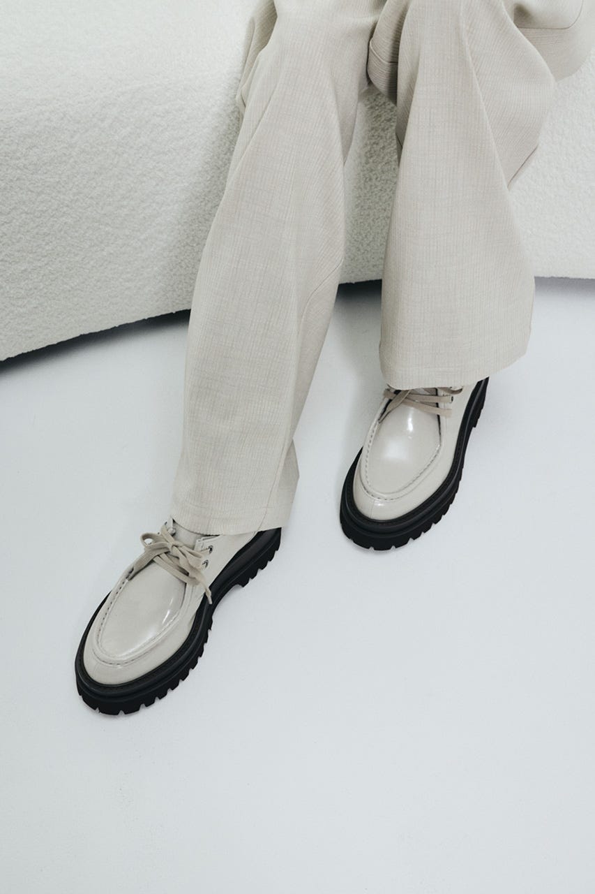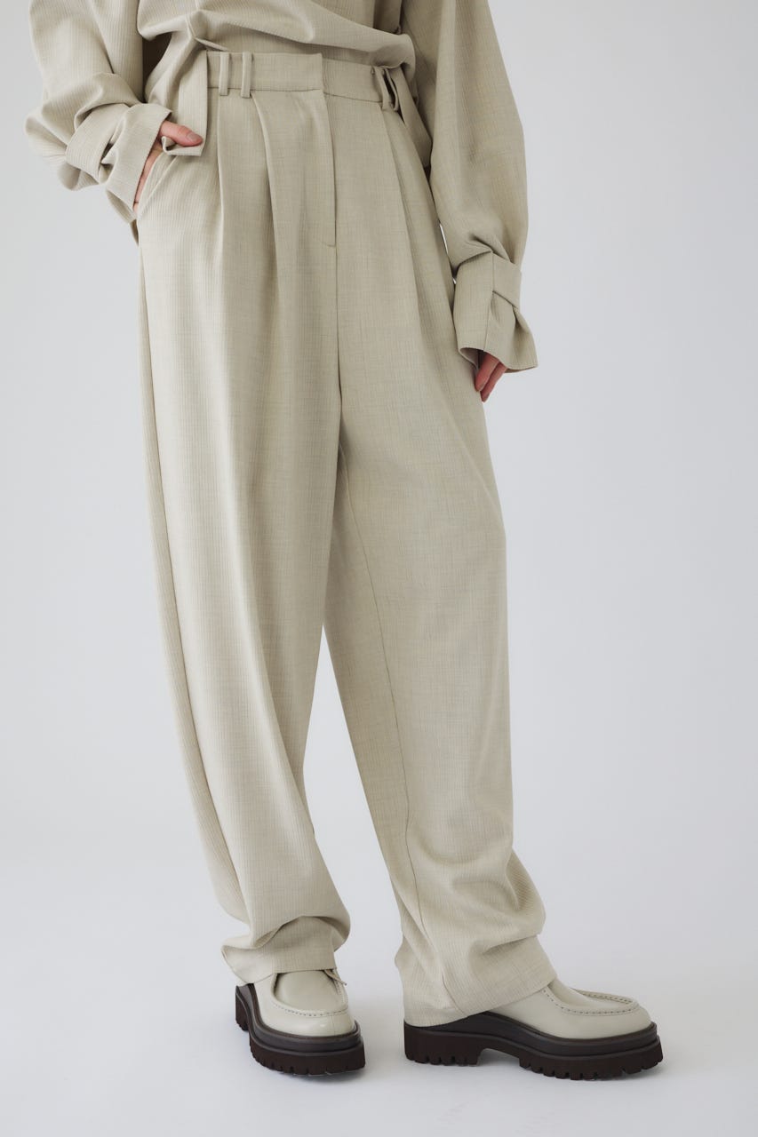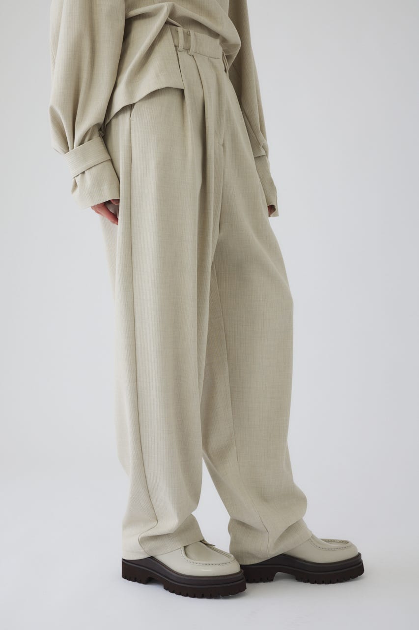 シルエットはRIM.ARK定番の「W tuck wide PT」の形を採用して深めのタックが腰回りをカバーしつつ、美しいワイドシルエットを描きます。