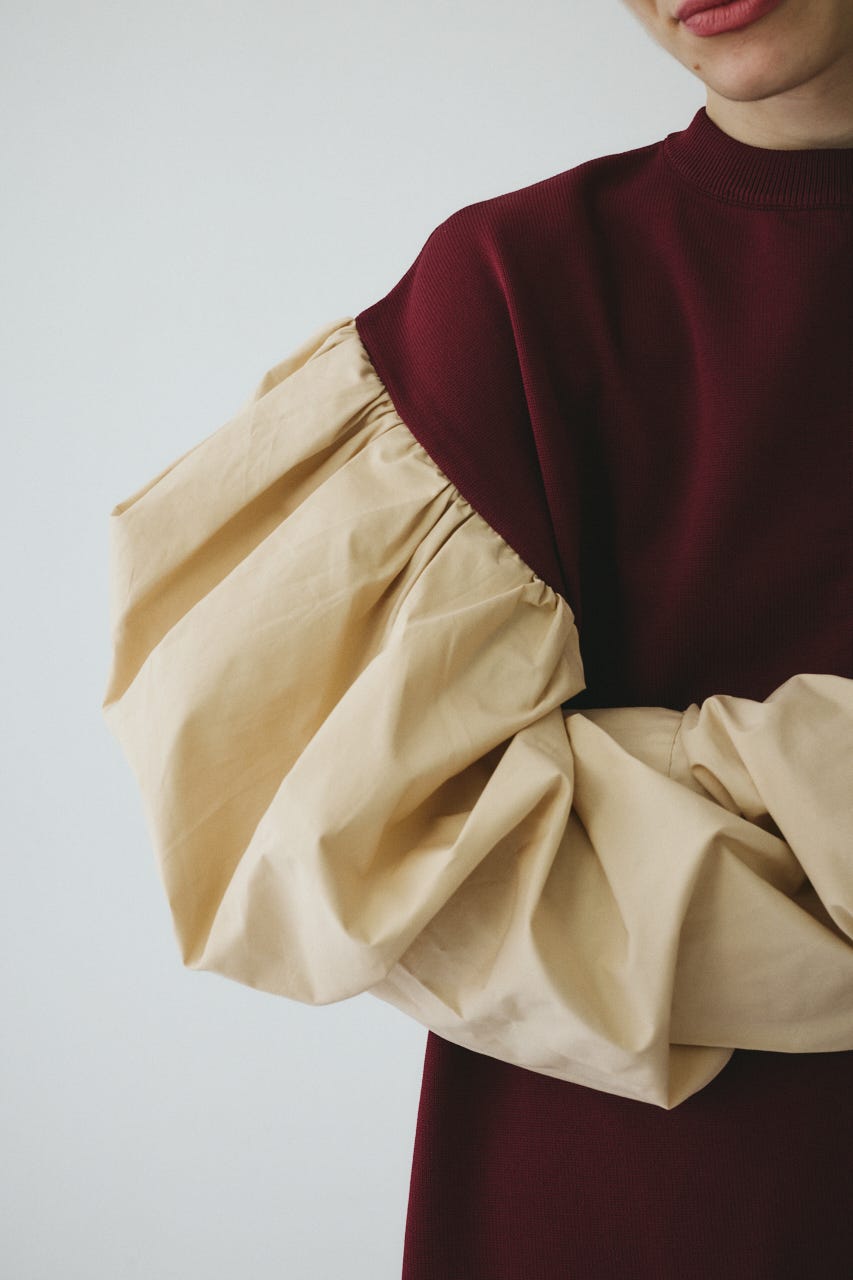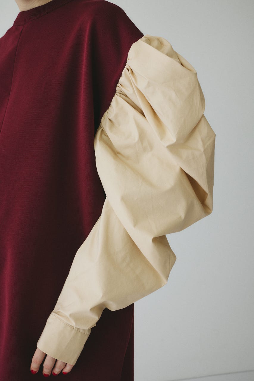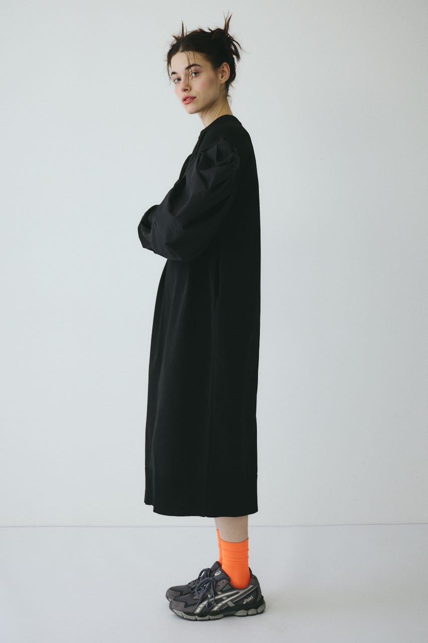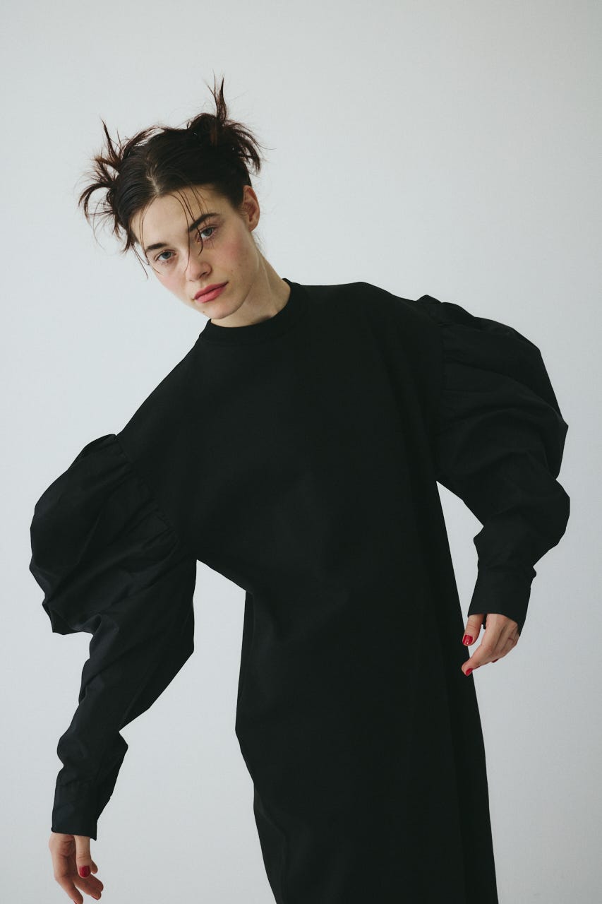 袖にはハリのあるシャツ素材を使用し、立体的なボリュームスリーブがシルエットに動きを生み出します。