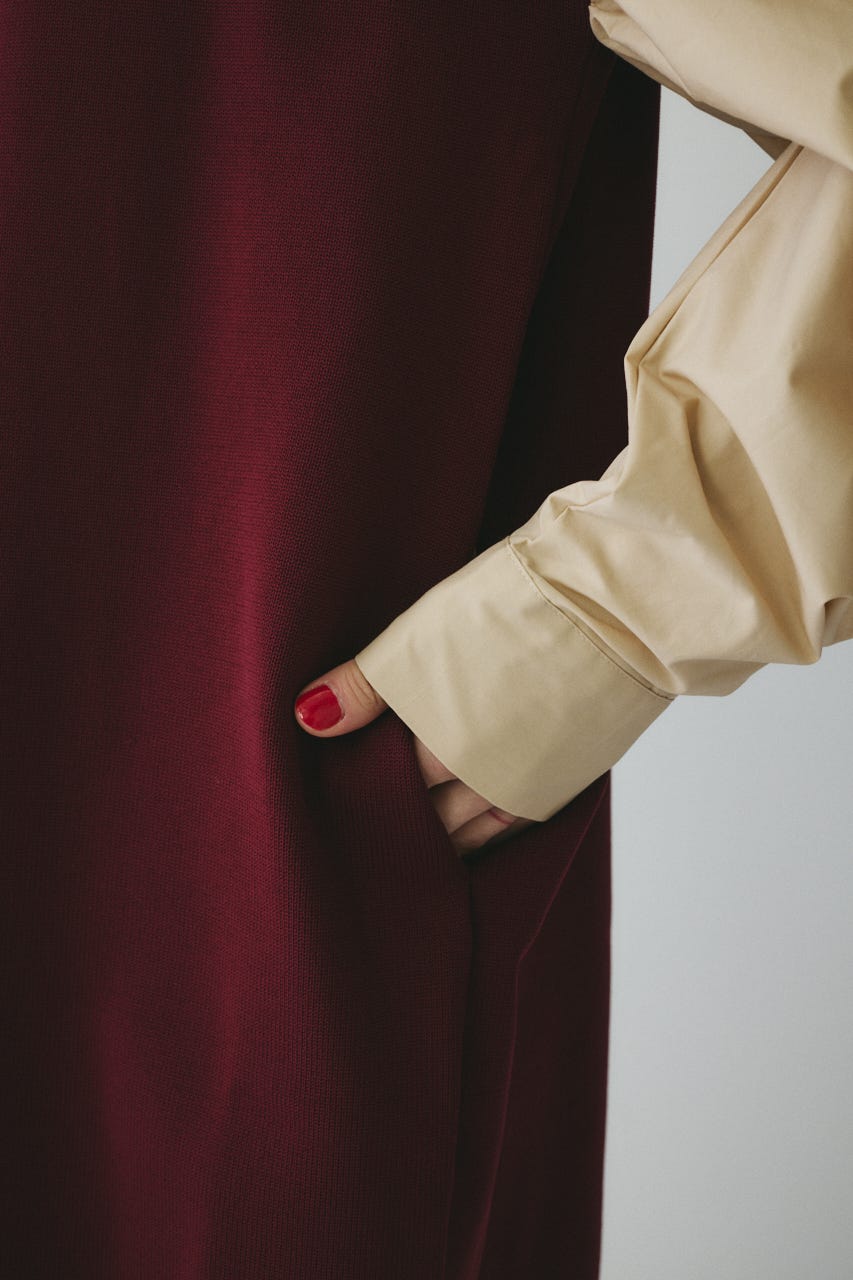 BODYは、マットなポリエステルの細い糸を多本取りし、ジャージのように編んだニット素材。袖は表面が滑らかな布帛生地をふんだんに使っています。