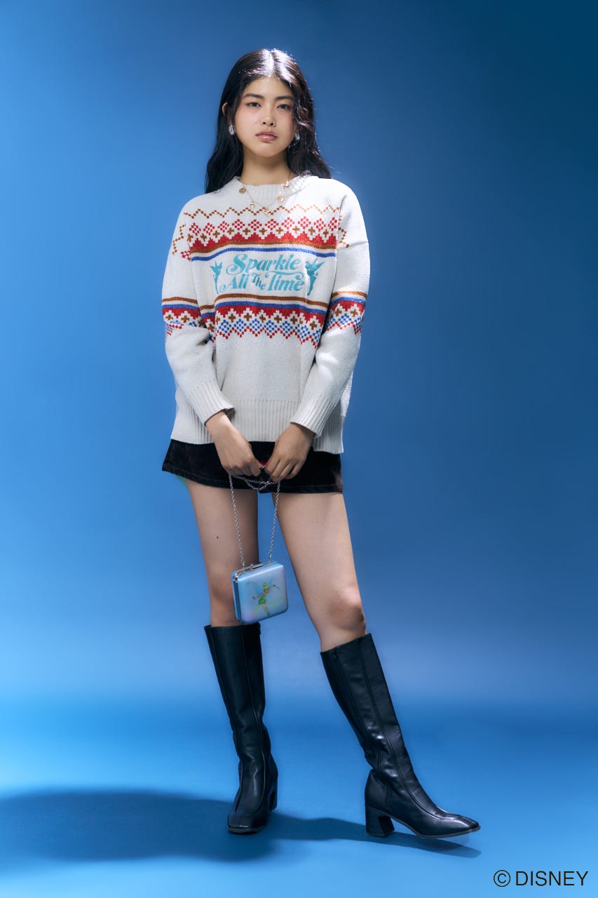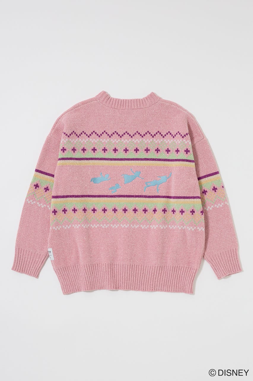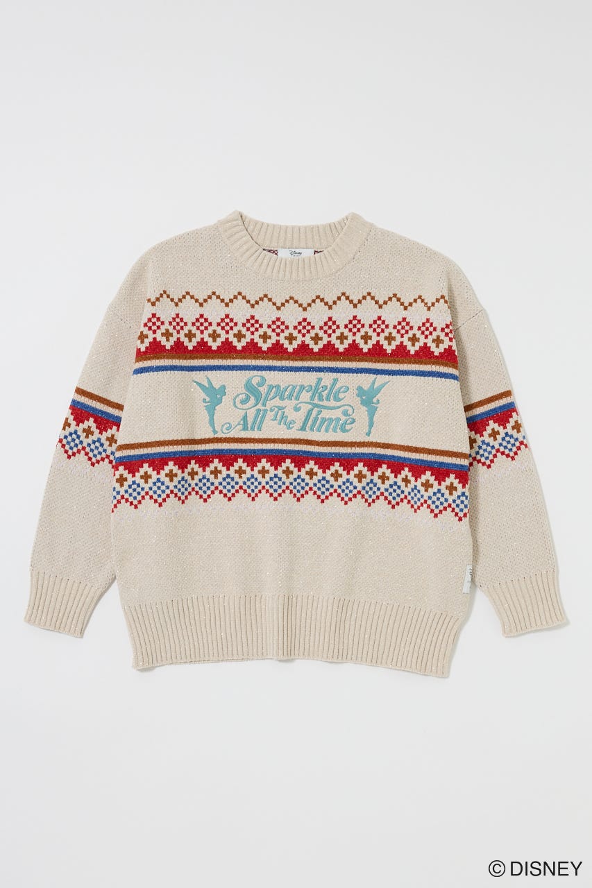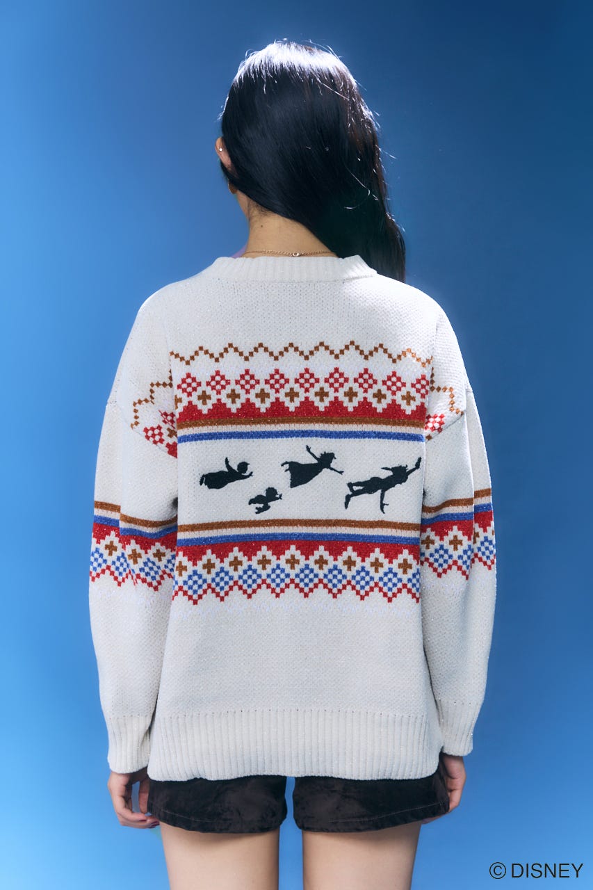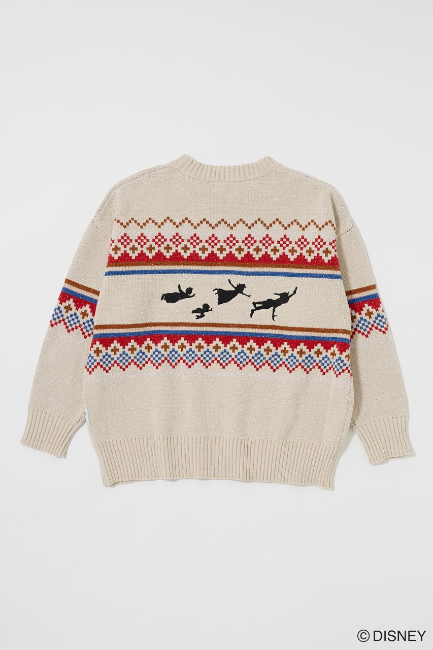 秋冬シーズンに欠かすことのできないフェアアイル調の柄にティンカーベル、ピーターパン達を刺繍で表現した1枚。