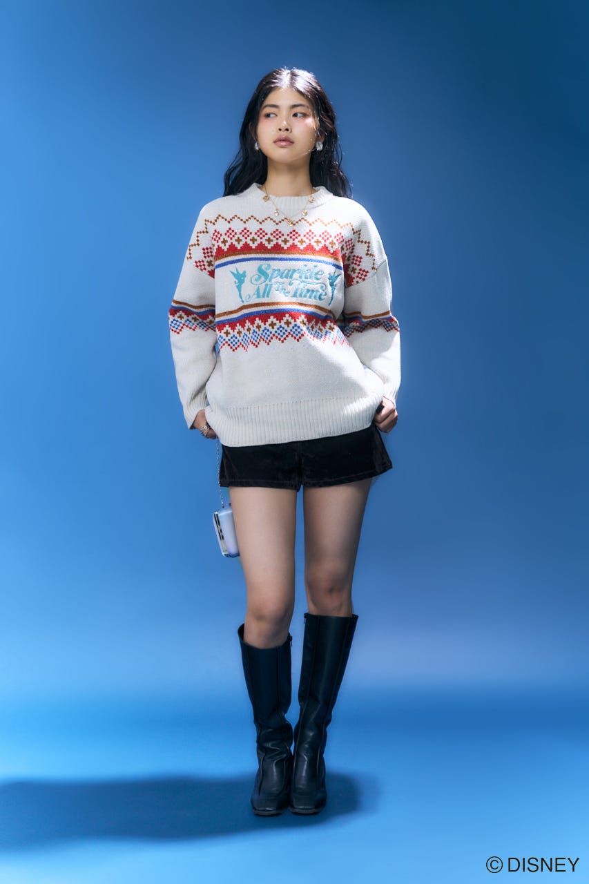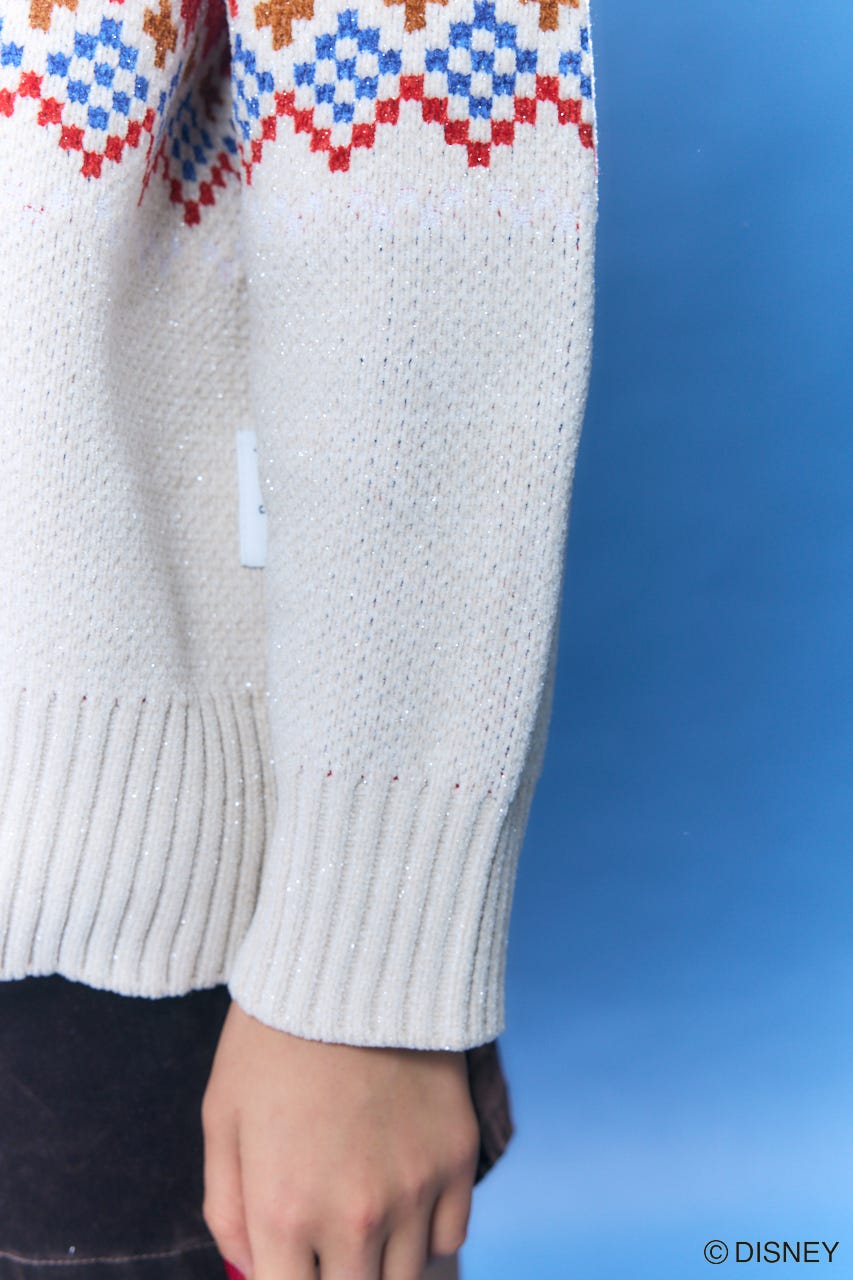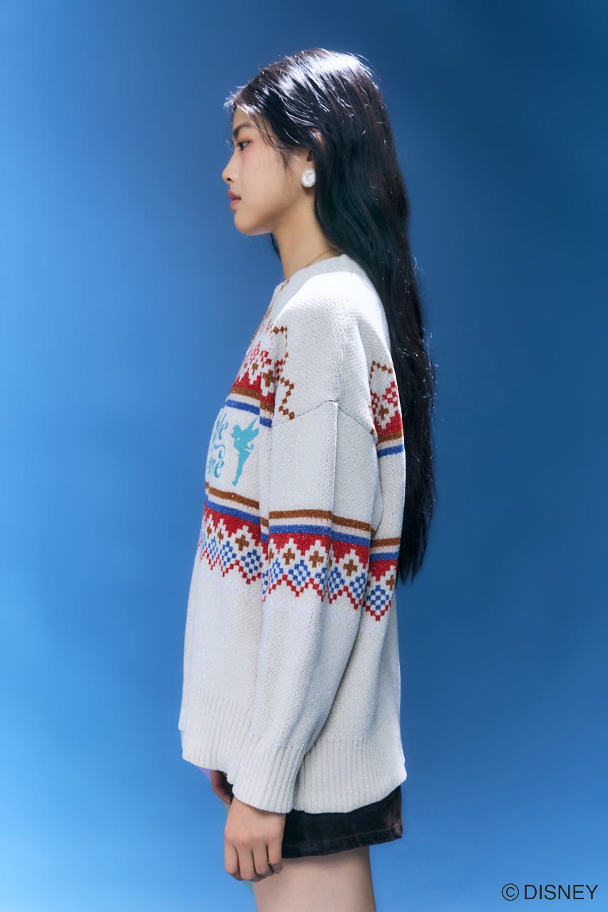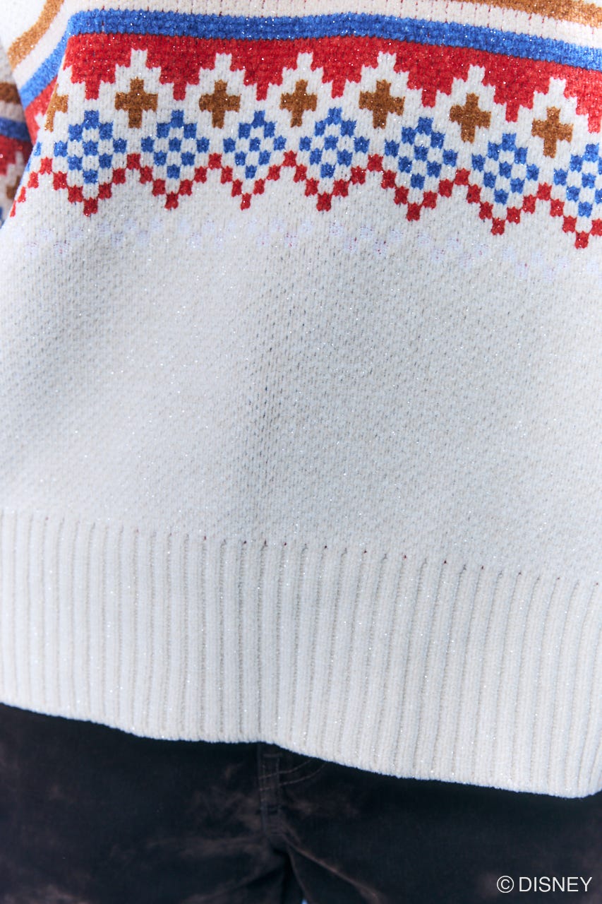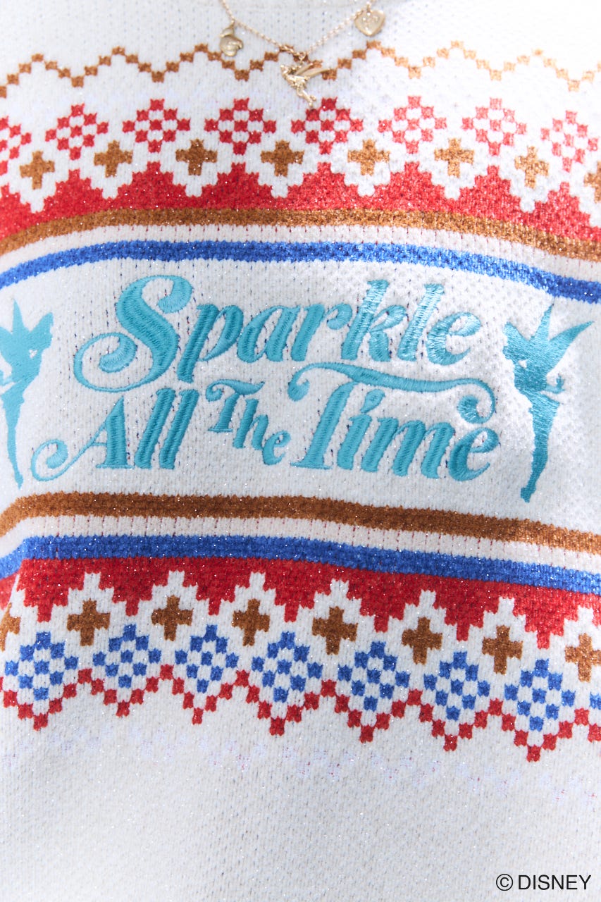 秋冬シーズンに欠かすことのできないフェアアイル調の柄にティンカーベル、ピーターパン達を刺繍で表現した1枚。