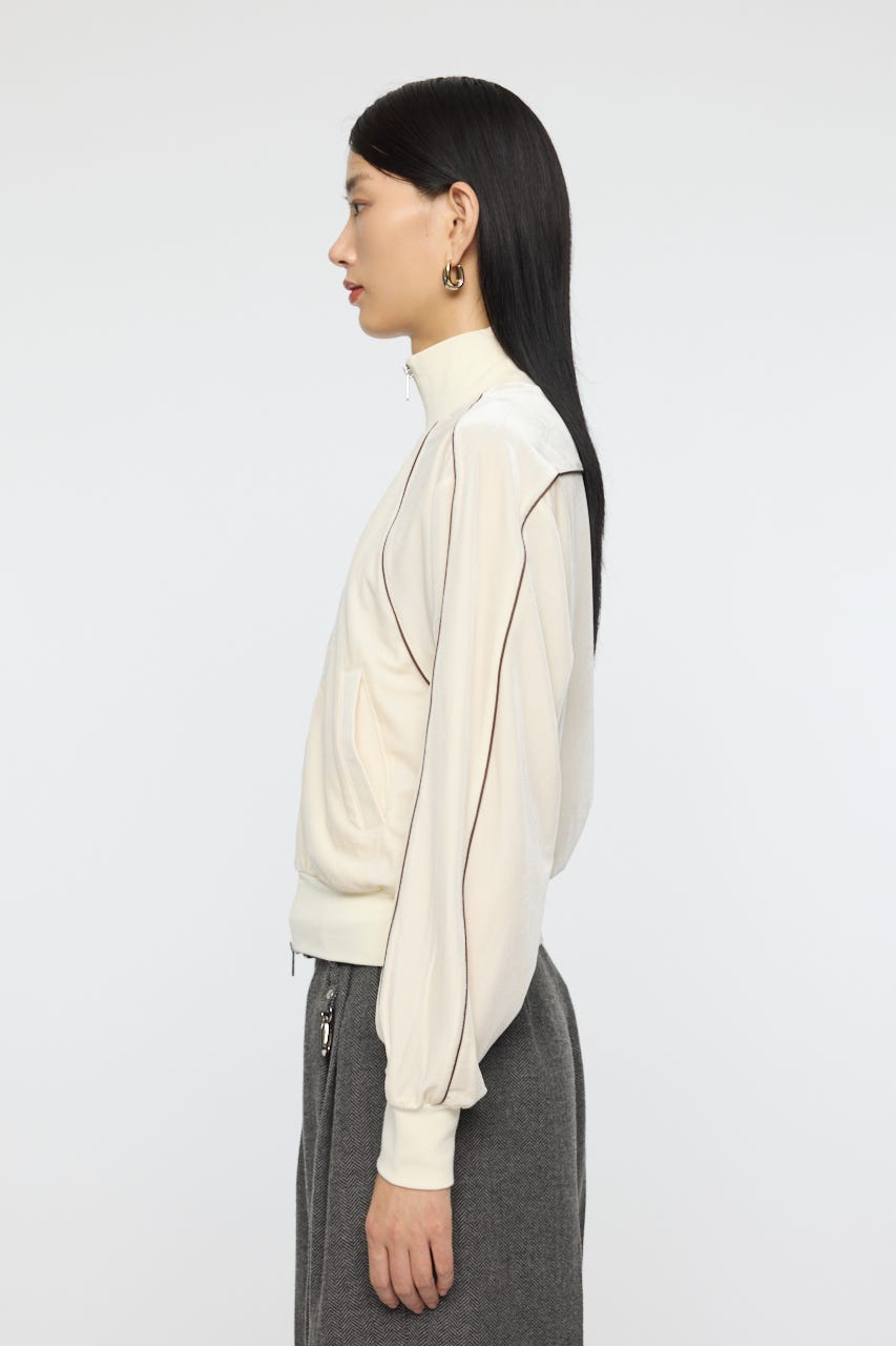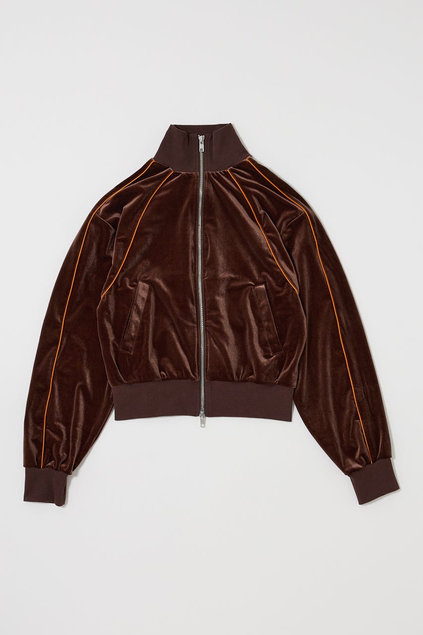 ベロア素材ならではの上品な輝きと艶感が魅力のトラックジャケット。