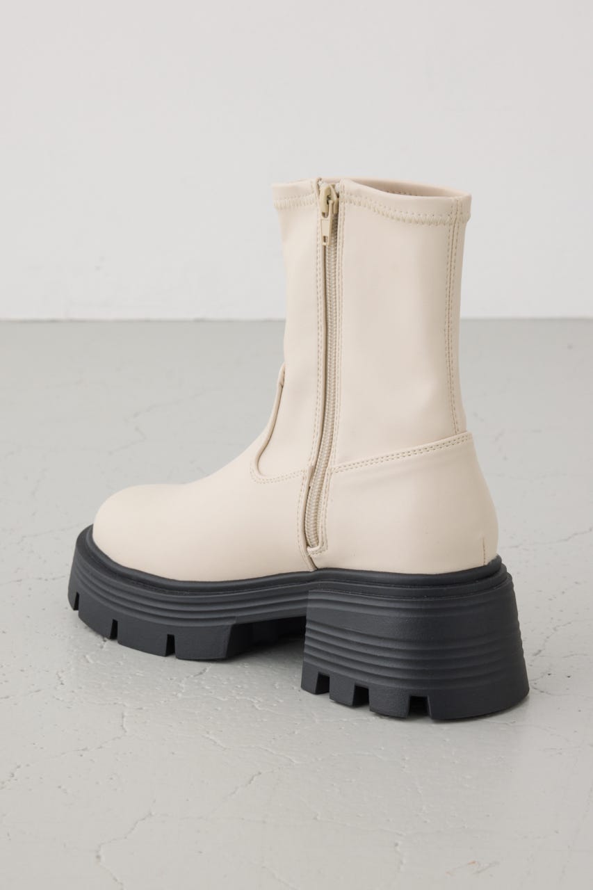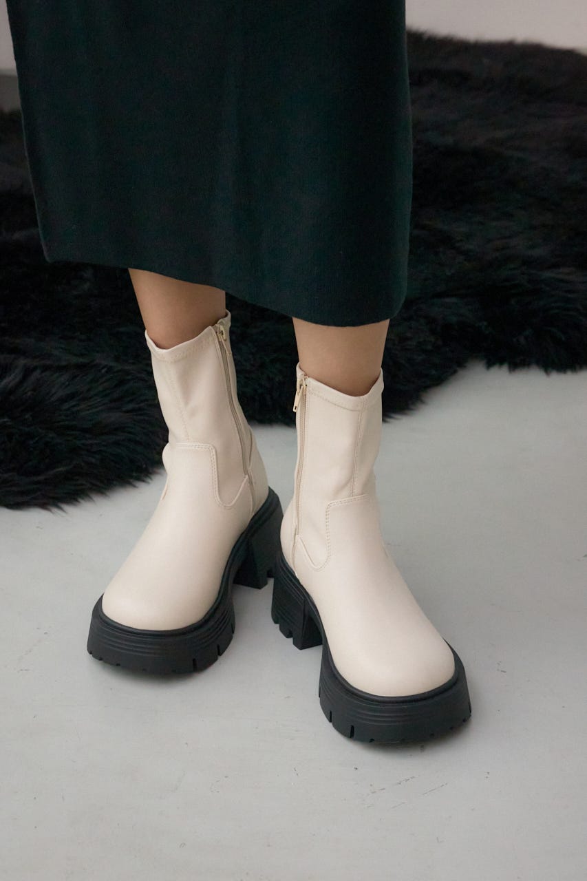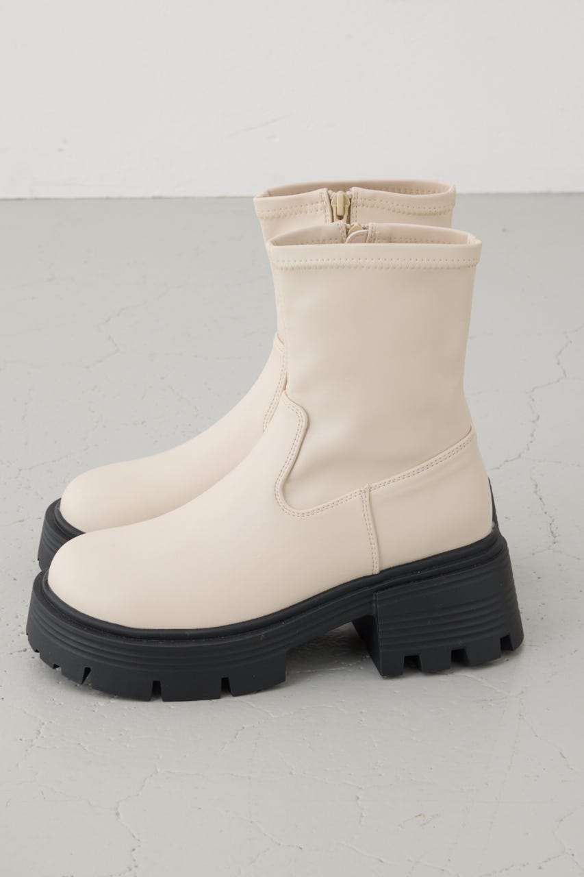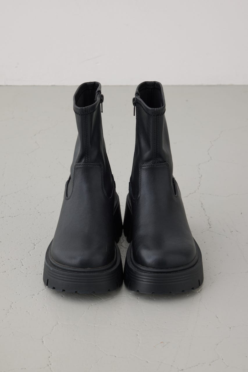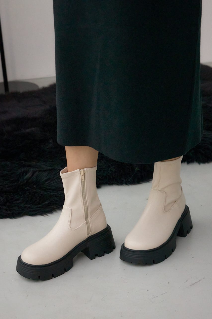 柔らかなストレッチ素材が足首を優しく包み込み、スタイルアップ見えを叶えるショートブーツ。
