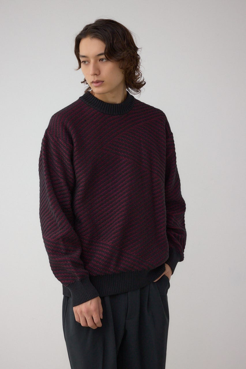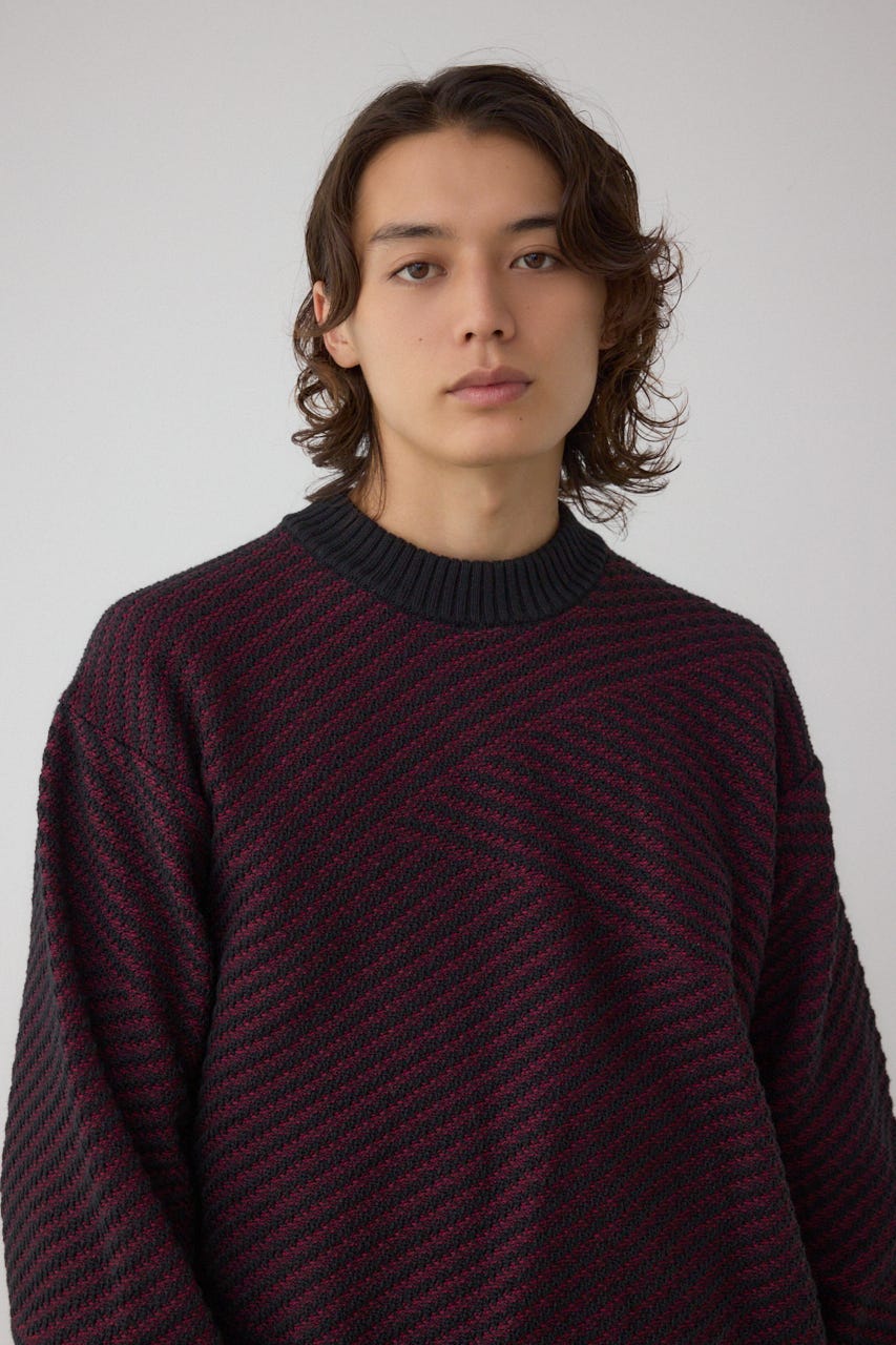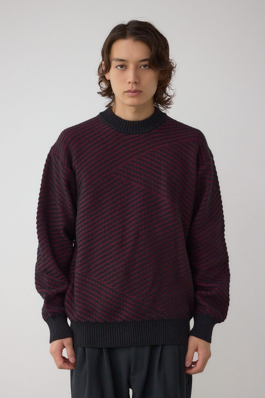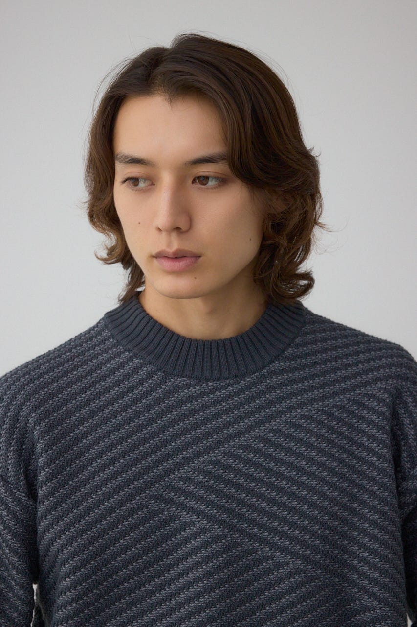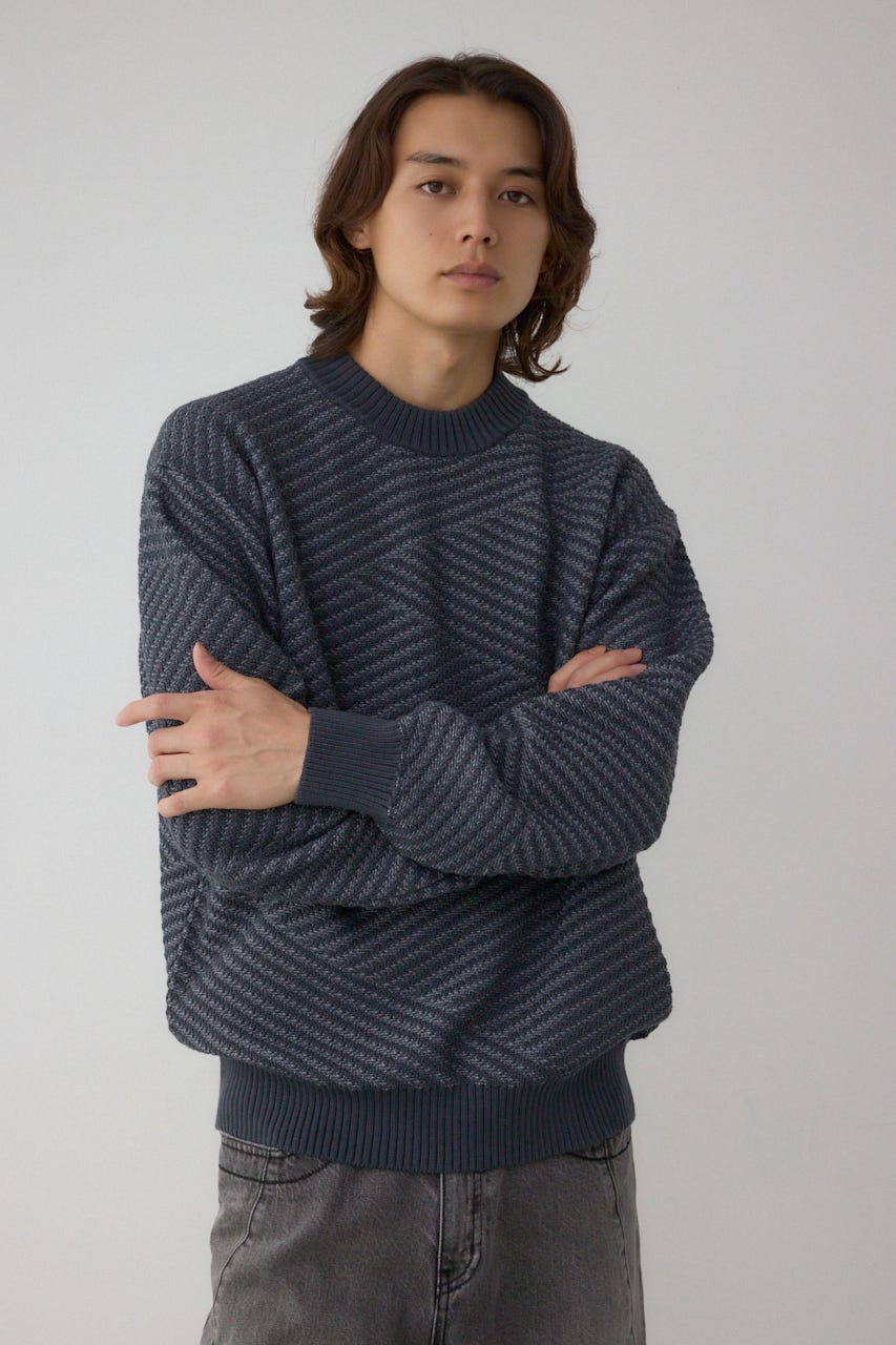 幾何学的な切り替えとジグトーンのダブルジャガードで立体感と存在感を出したニットトップスです。