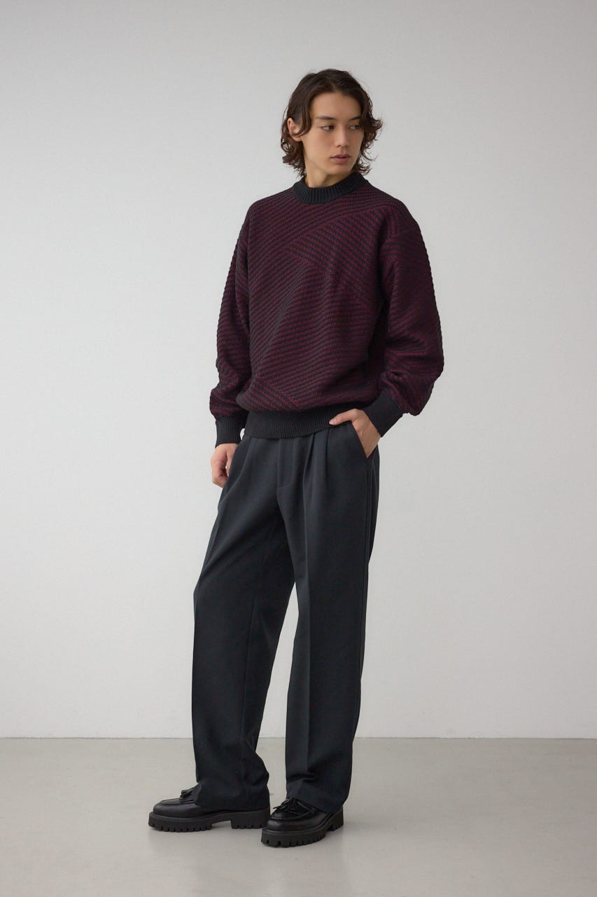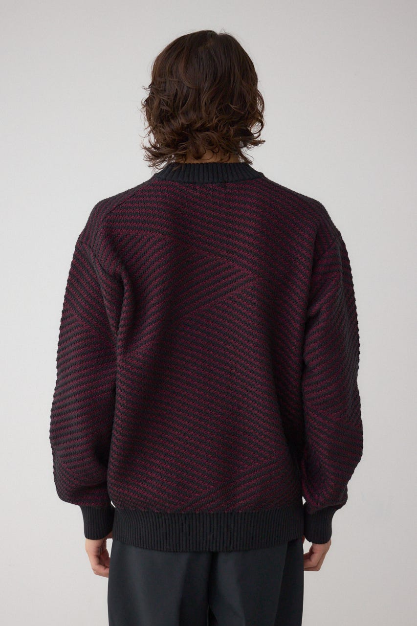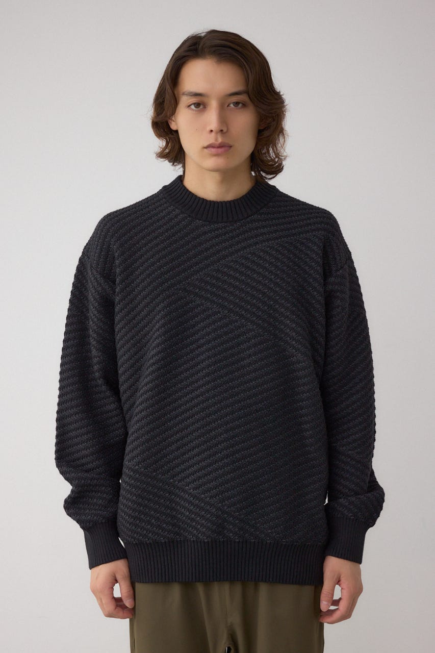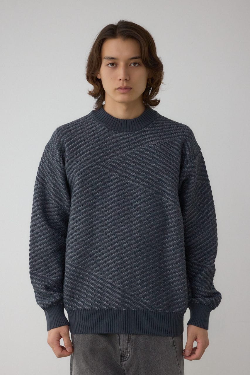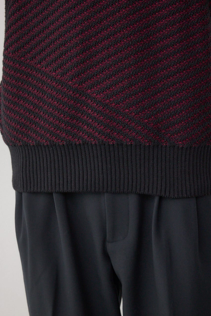 幾何学的な切り替えとジグトーンのダブルジャガードで立体感と存在感を出したニットトップスです。