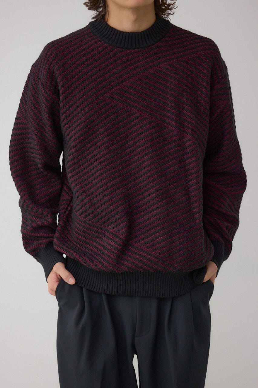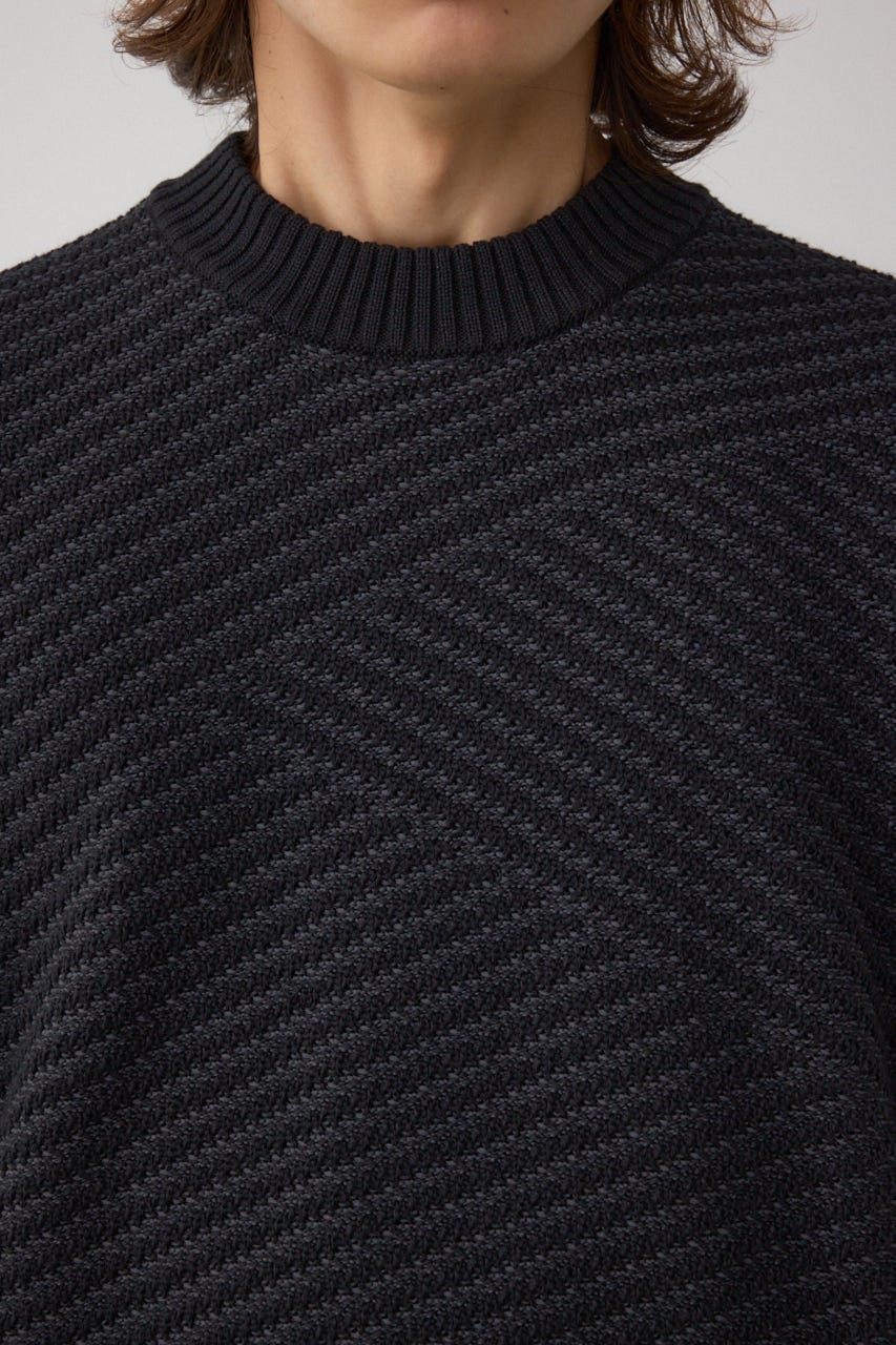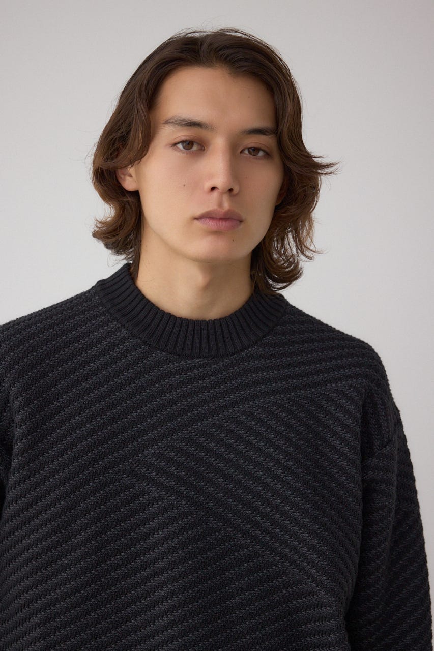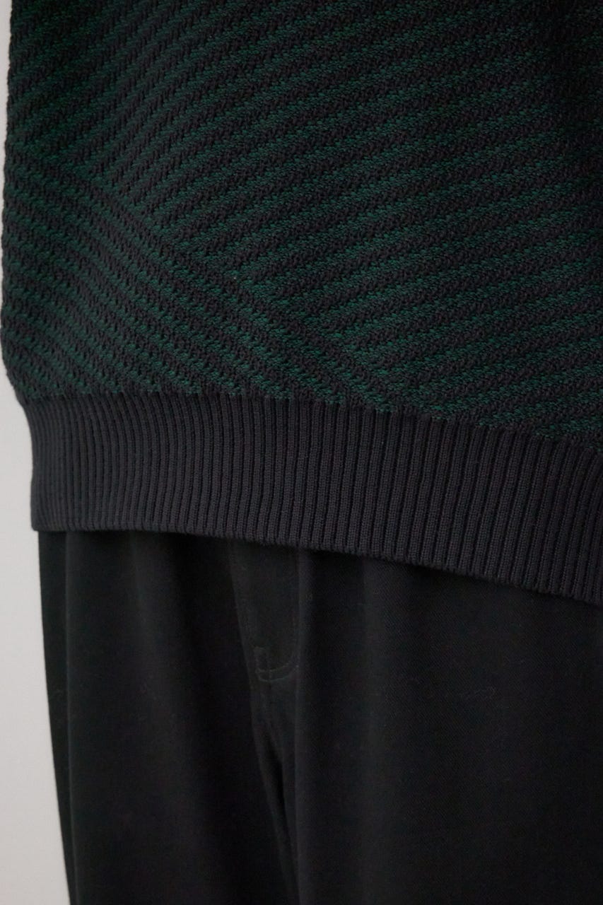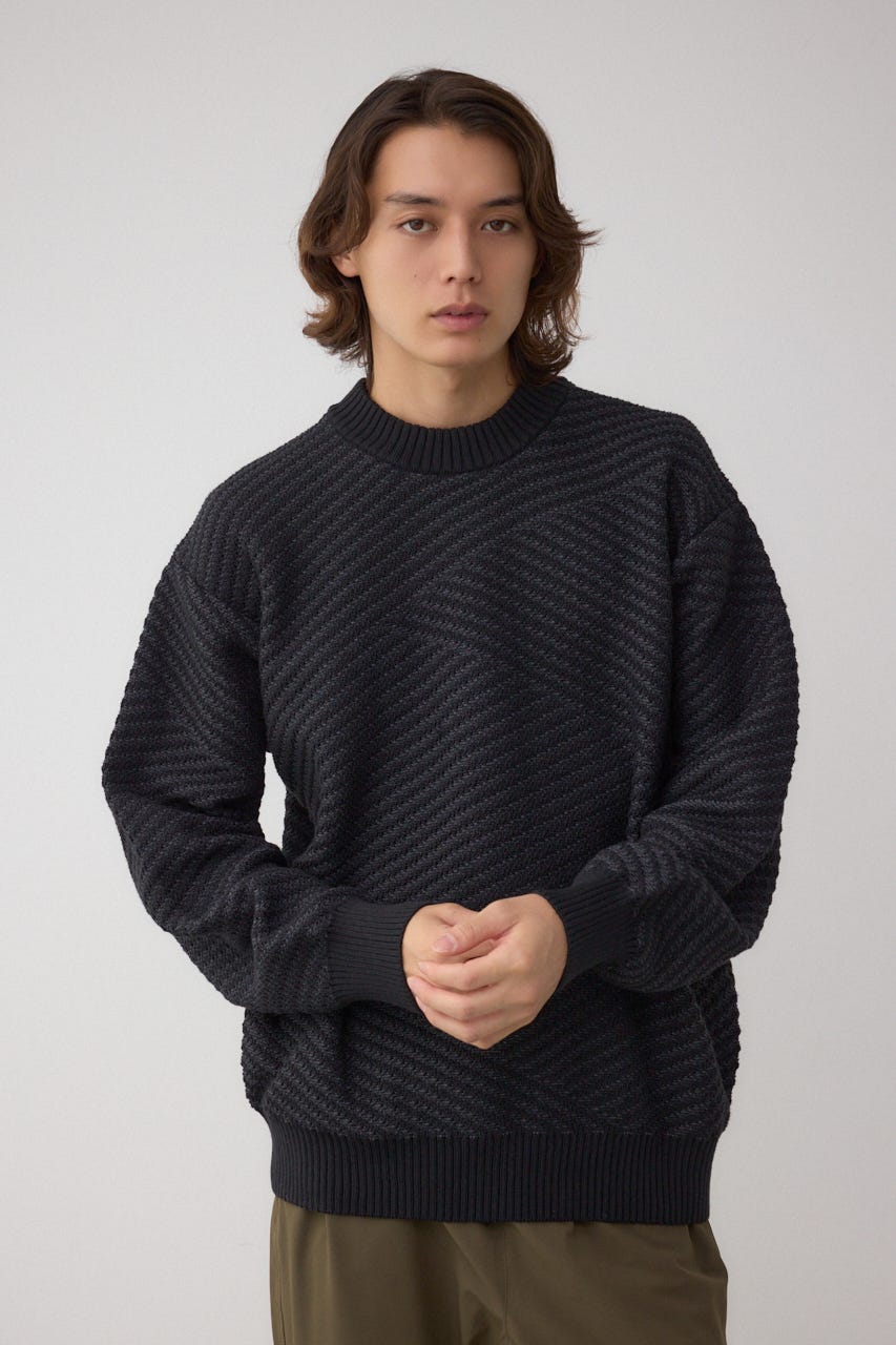 幾何学的な切り替えとジグトーンのダブルジャガードで立体感と存在感を出したニットトップスです。
