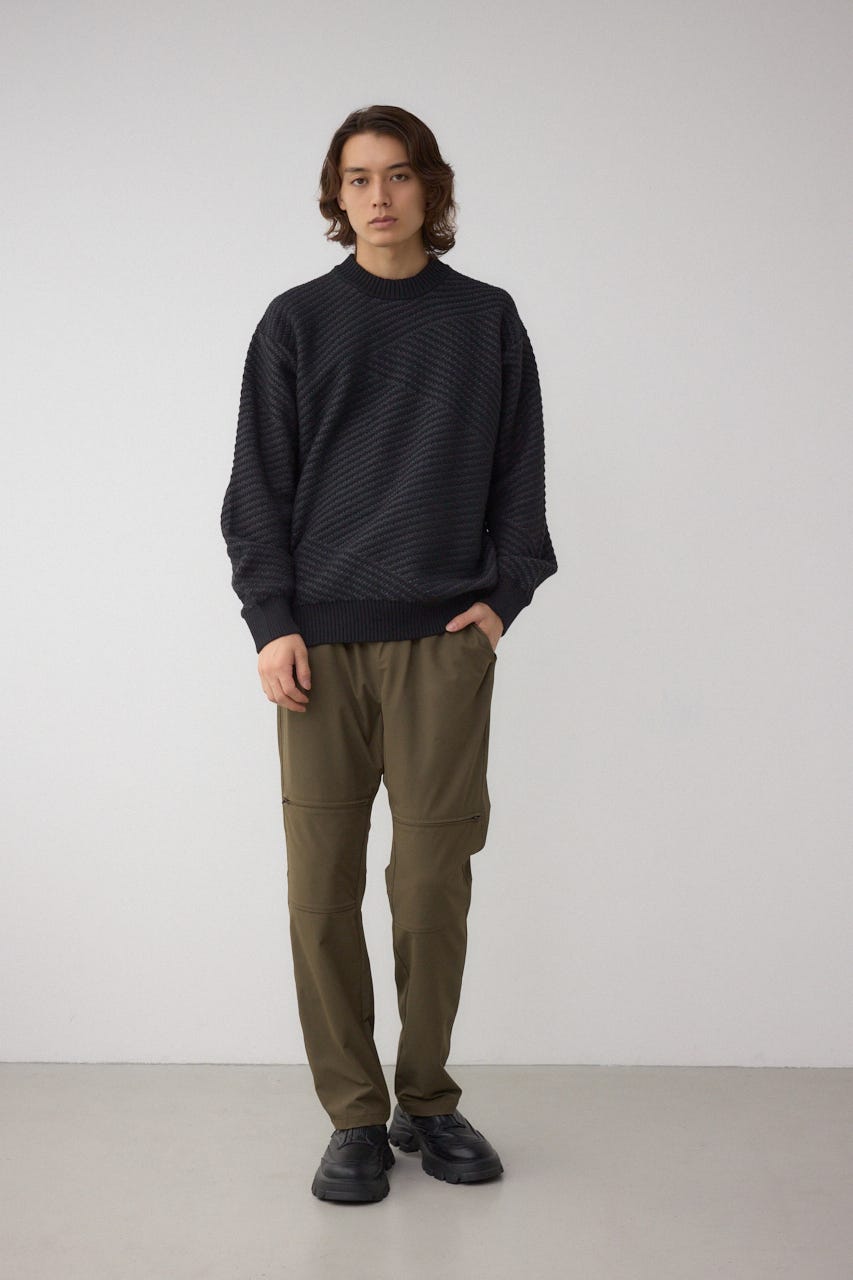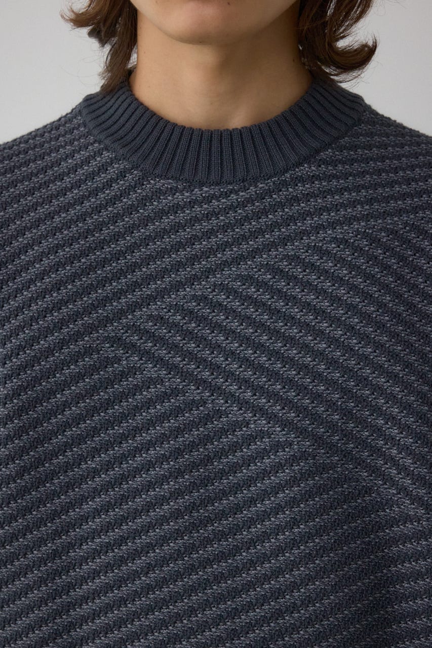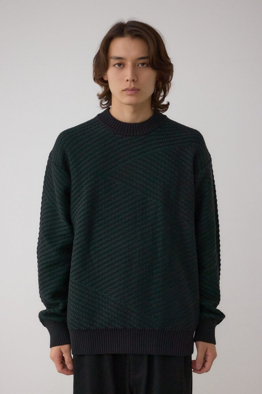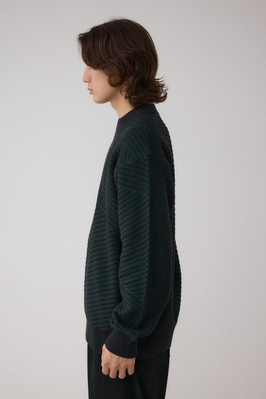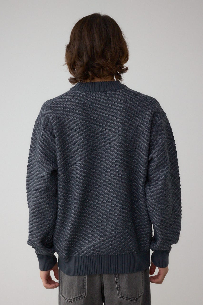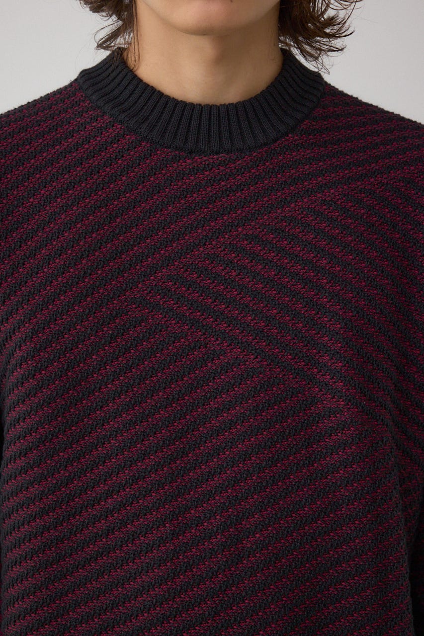 幾何学的な切り替えとジグトーンのダブルジャガードで立体感と存在感を出したニットトップスです。