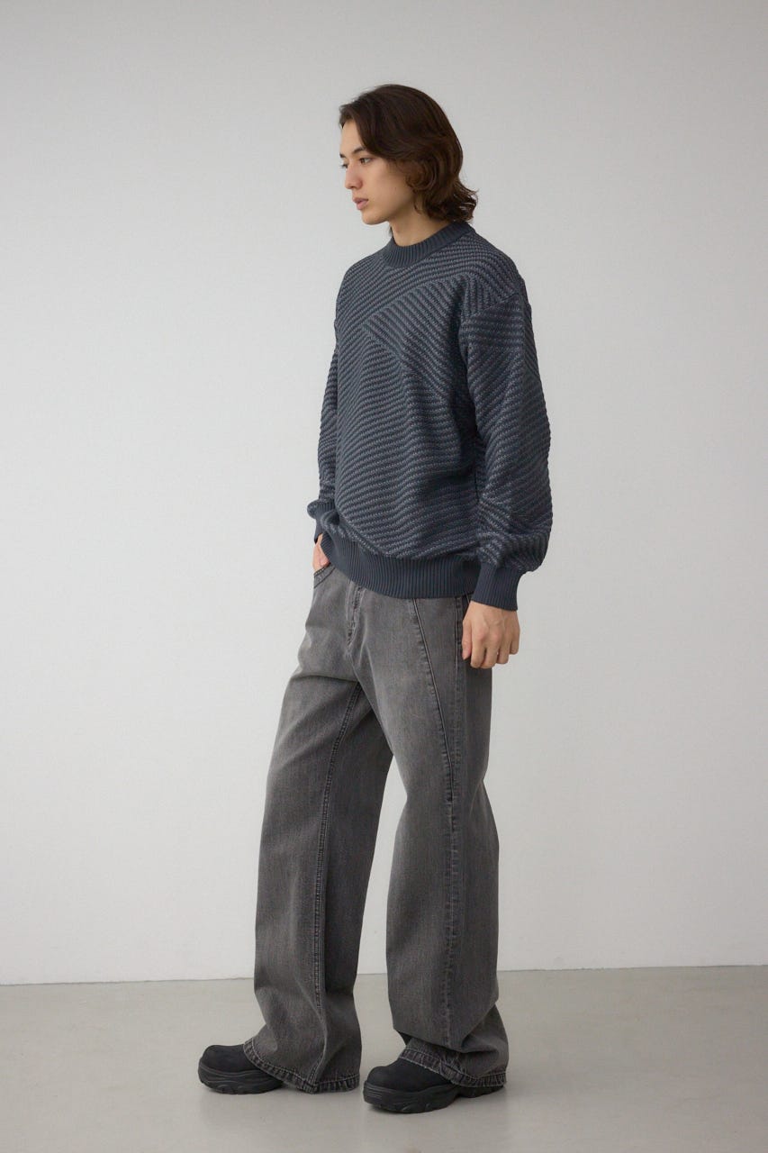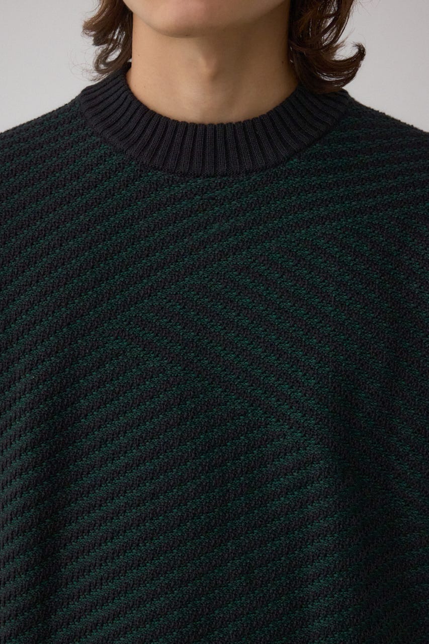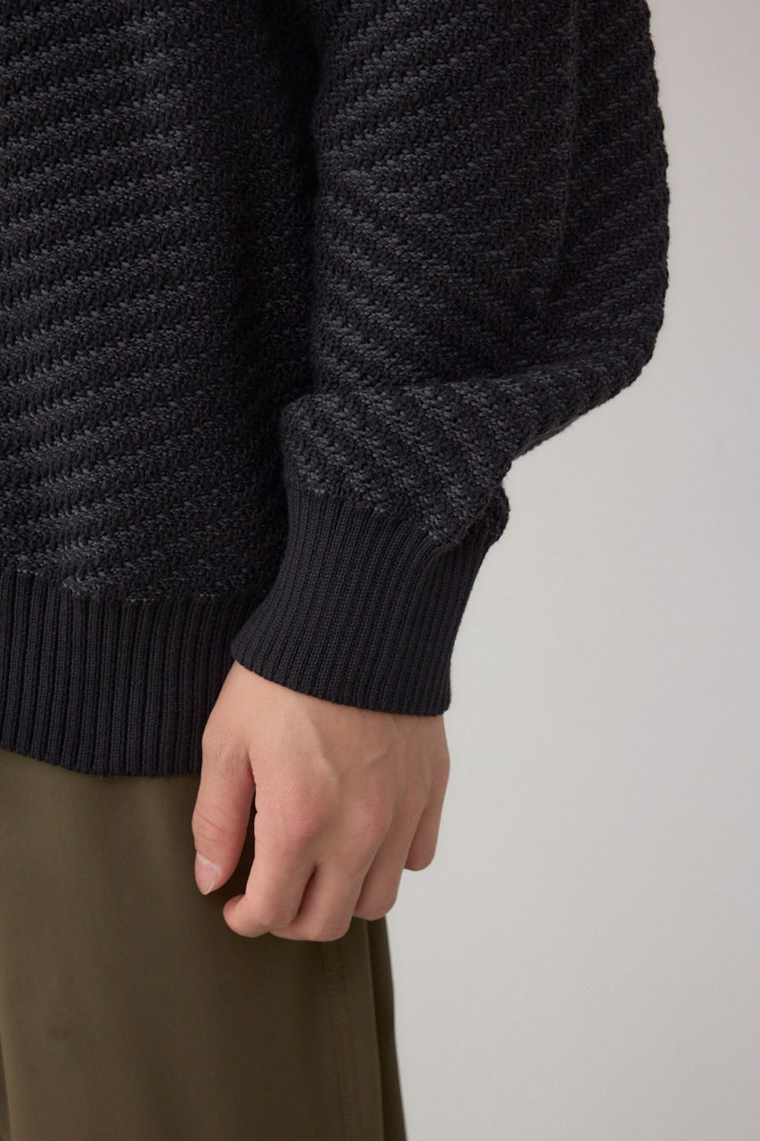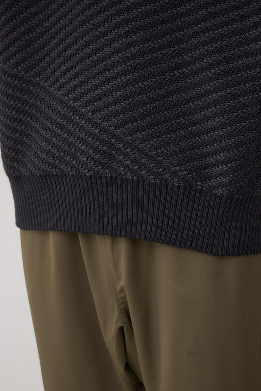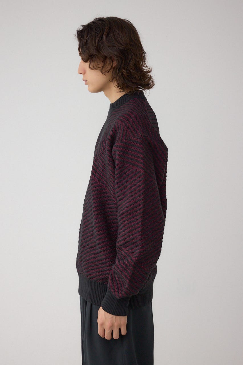 幾何学的な切り替えとジグトーンのダブルジャガードで立体感と存在感を出したニットトップスです。