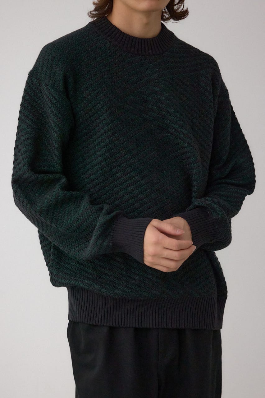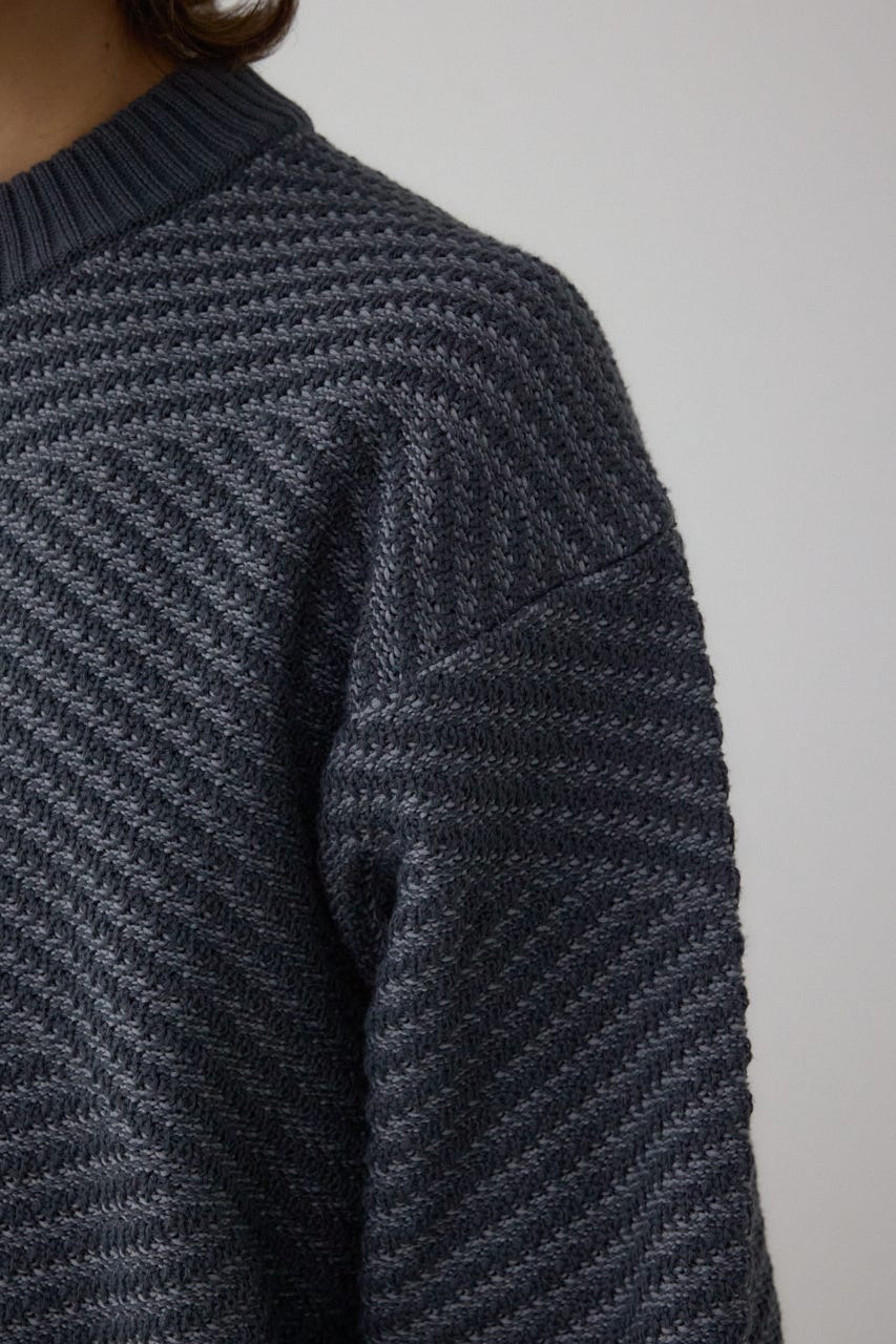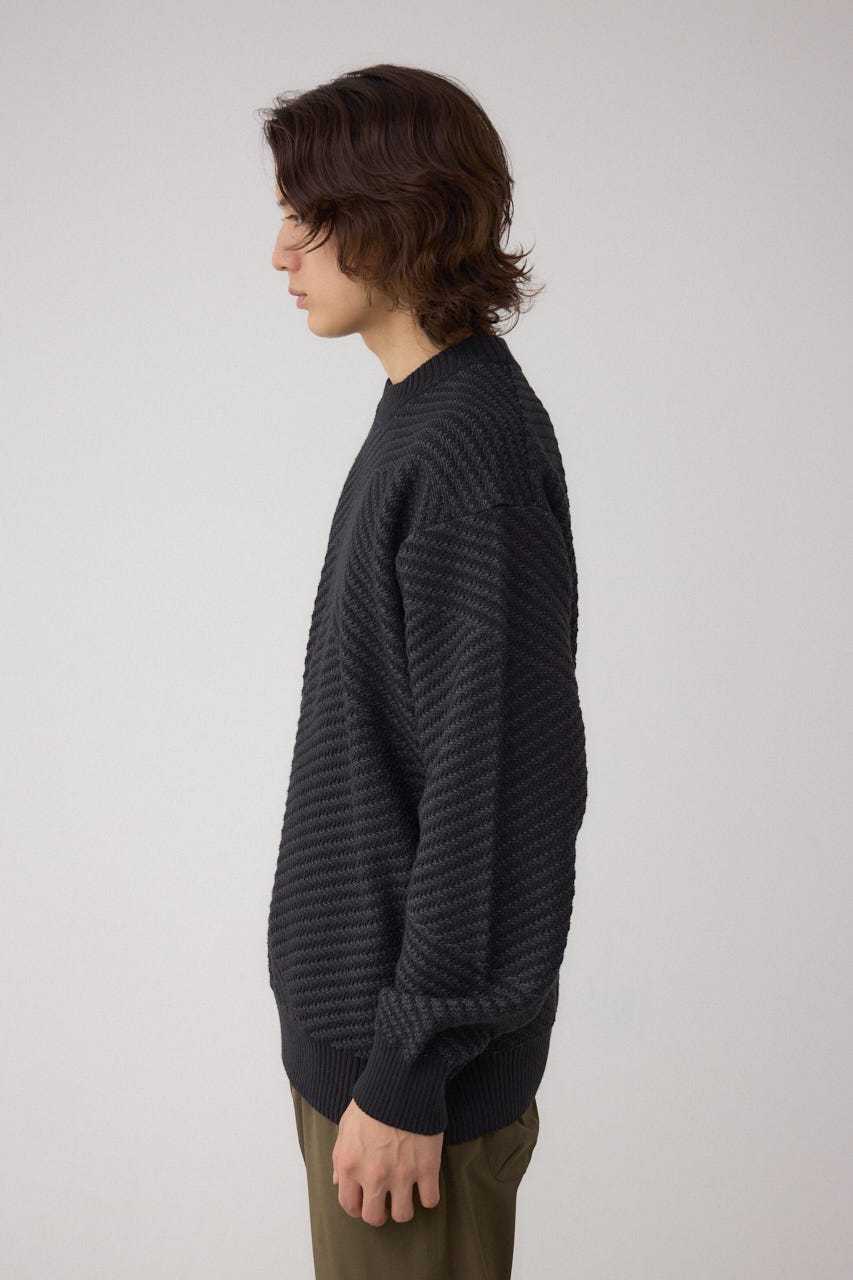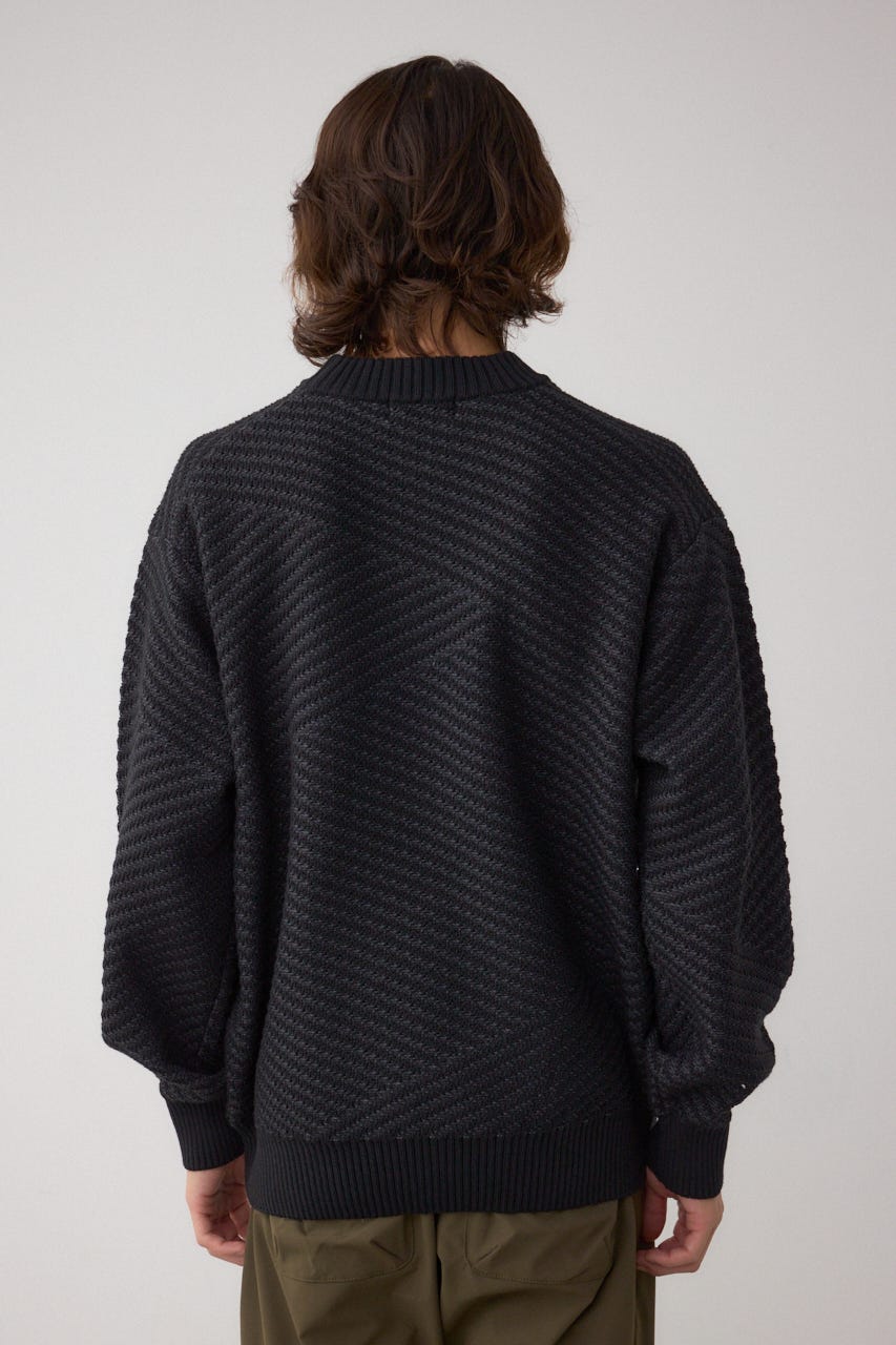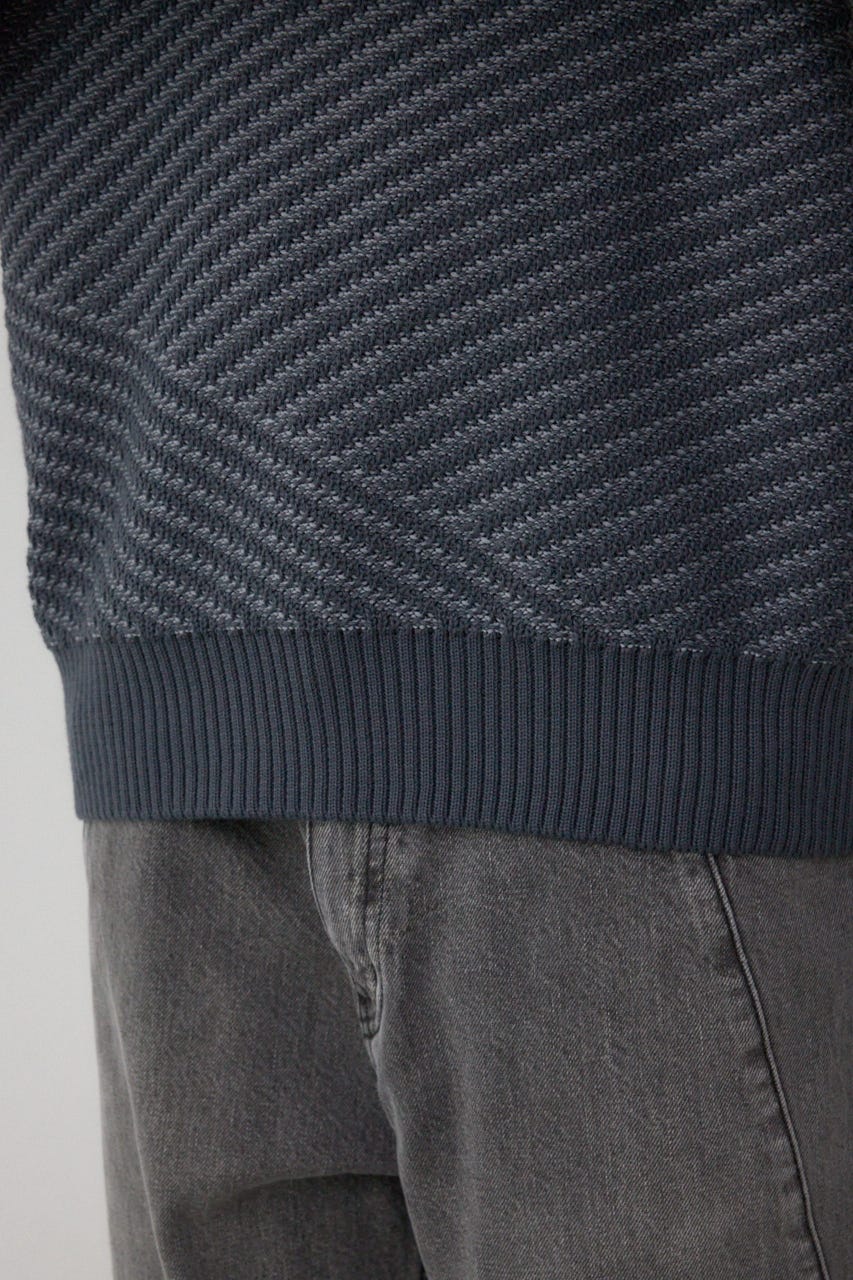 幾何学的な切り替えとジグトーンのダブルジャガードで立体感と存在感を出したニットトップスです。
