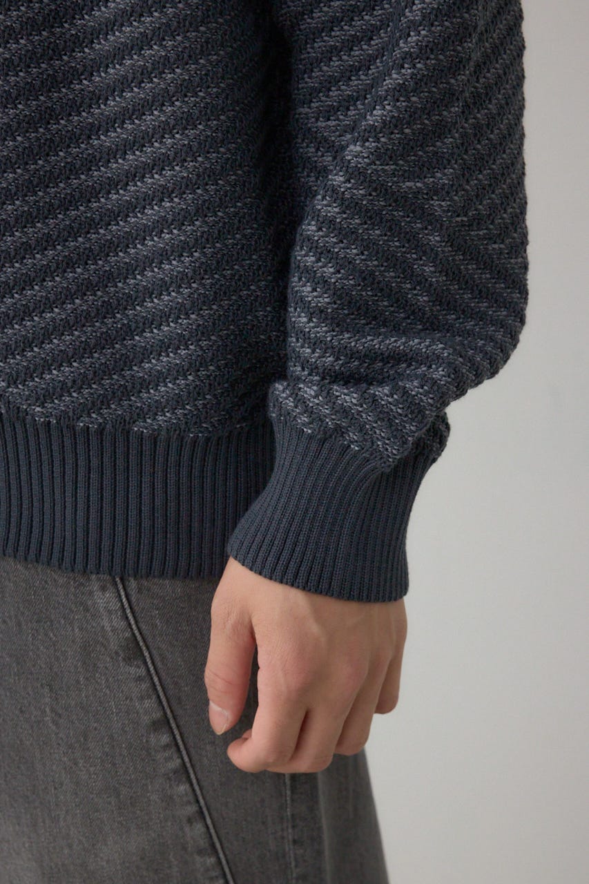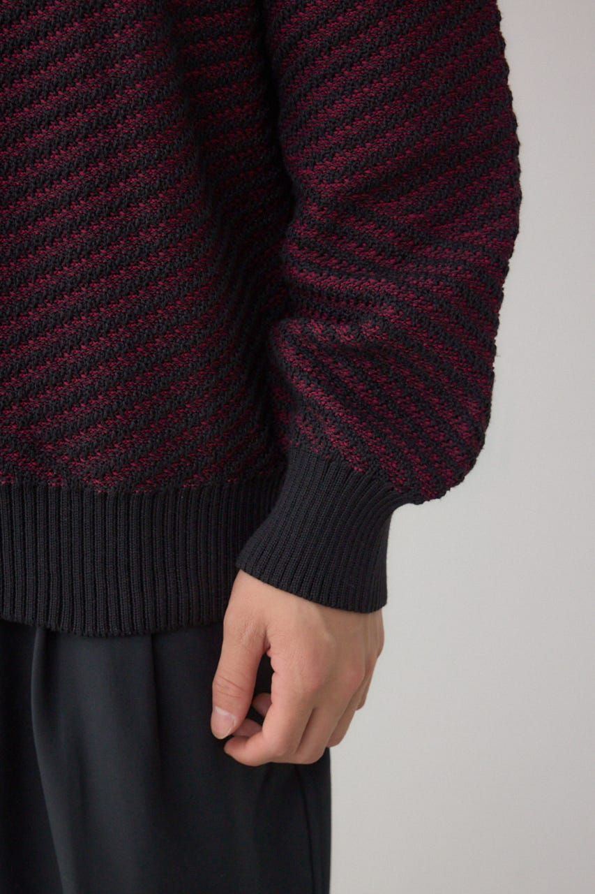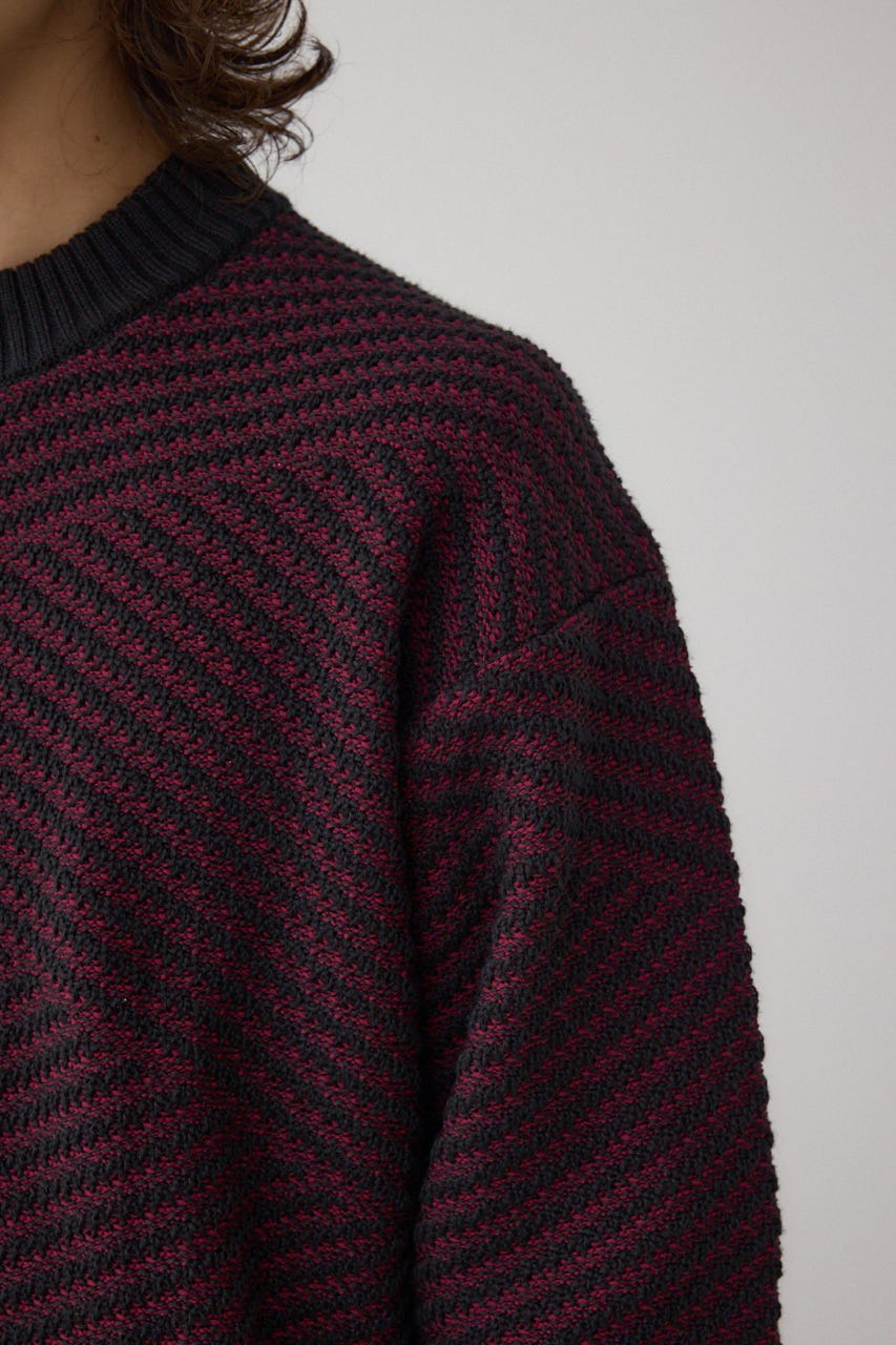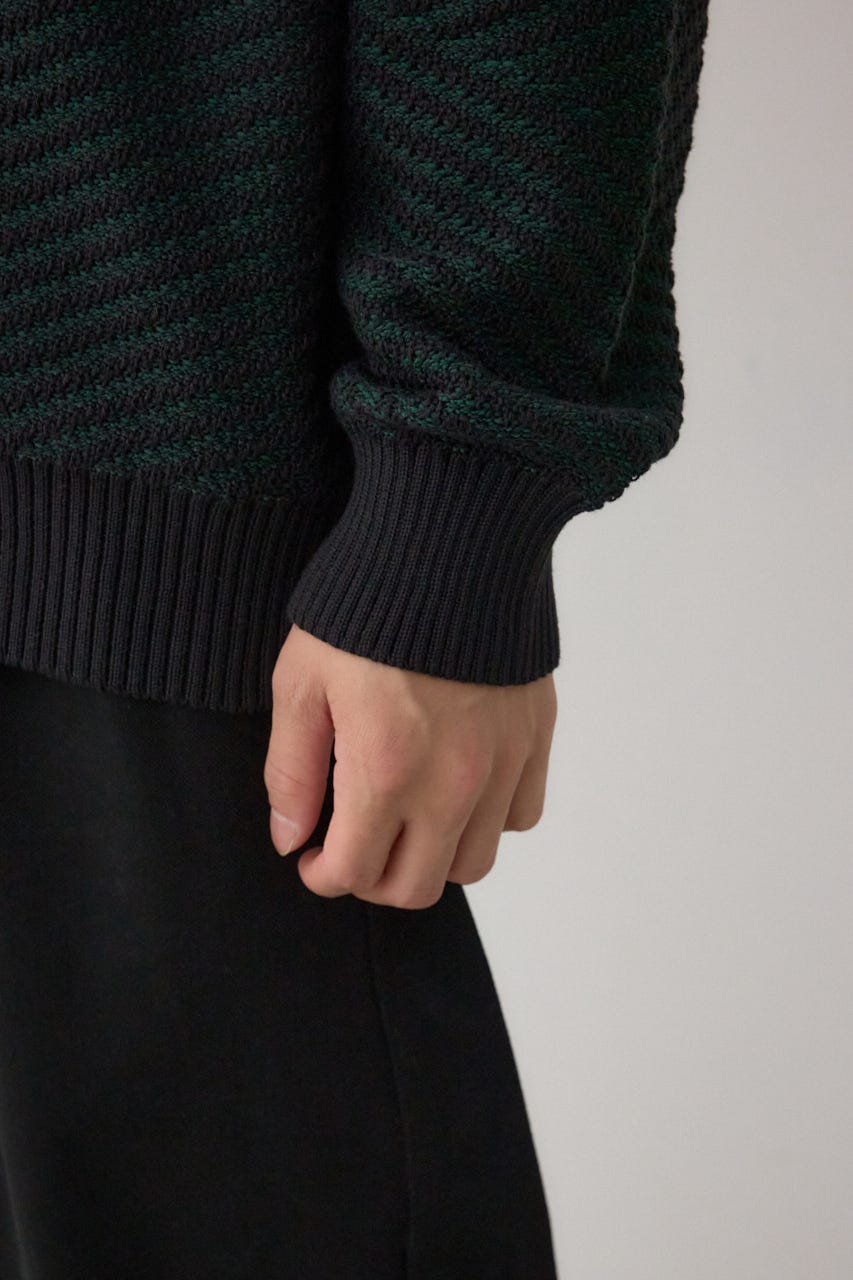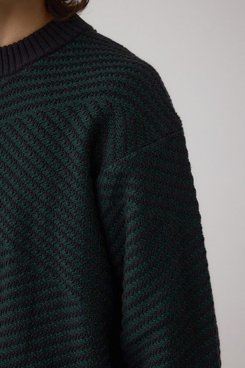 幾何学的な切り替えとジグトーンのダブルジャガードで立体感と存在感を出したニットトップスです。