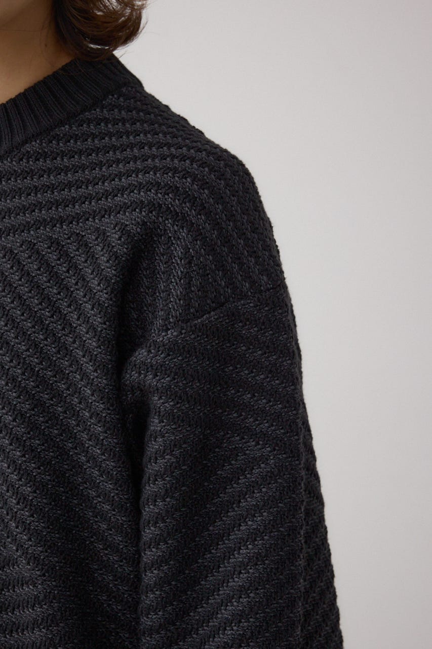幾何学柄のような切り替えとダブルジャガードの柄編みで、AZULらしい個性を表現した張り感のあるニットトップス。