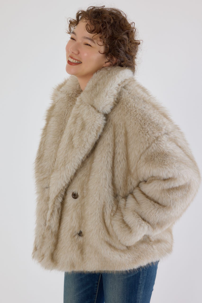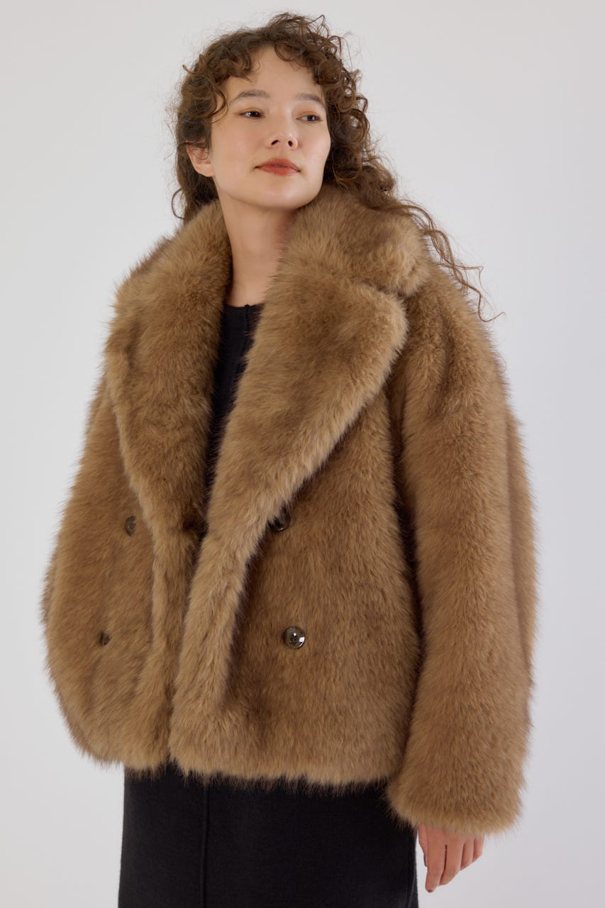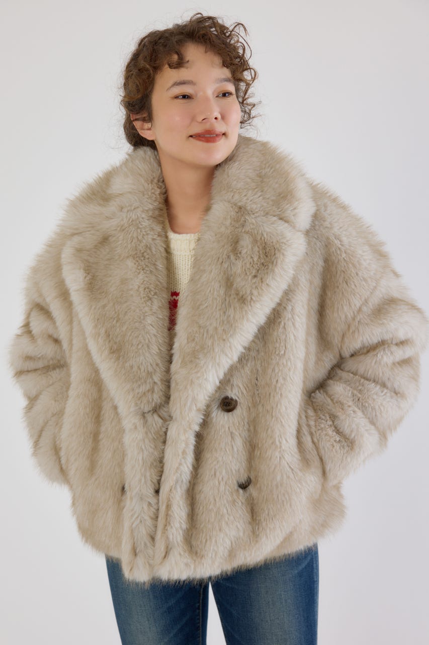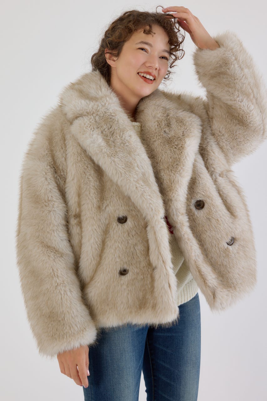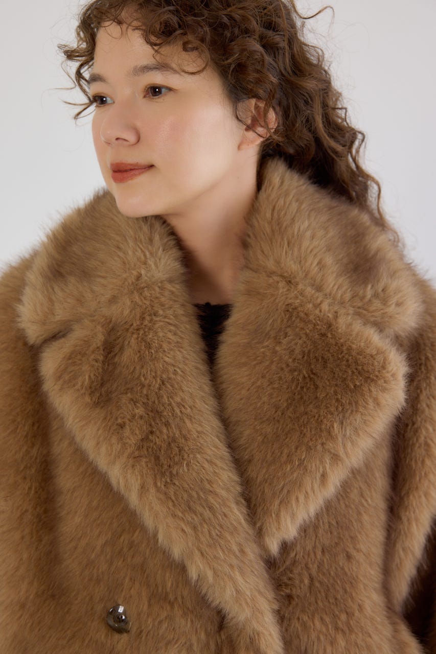フォックスファーのような毛足長めのファーを使用し、洗練された女性の魅力を演出できるフェイクファーのPコート。