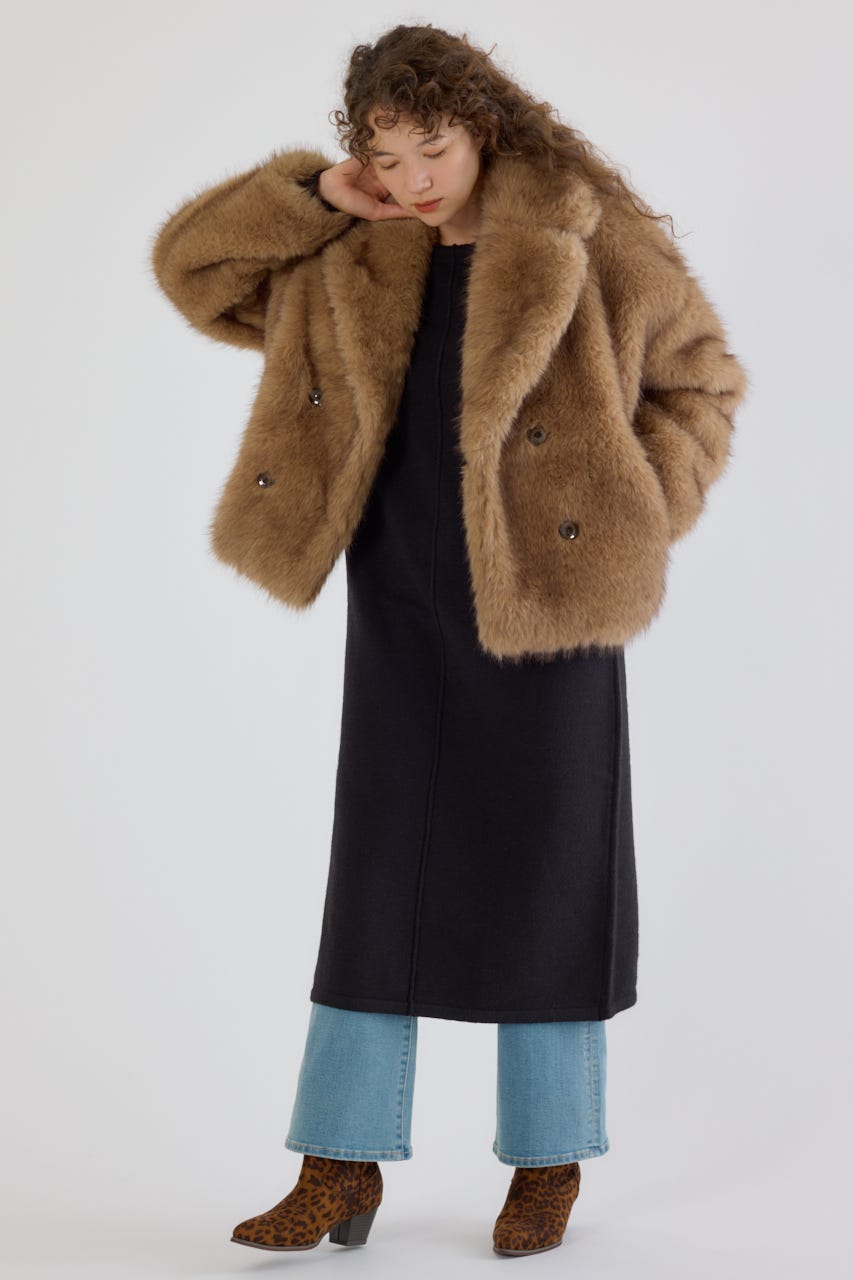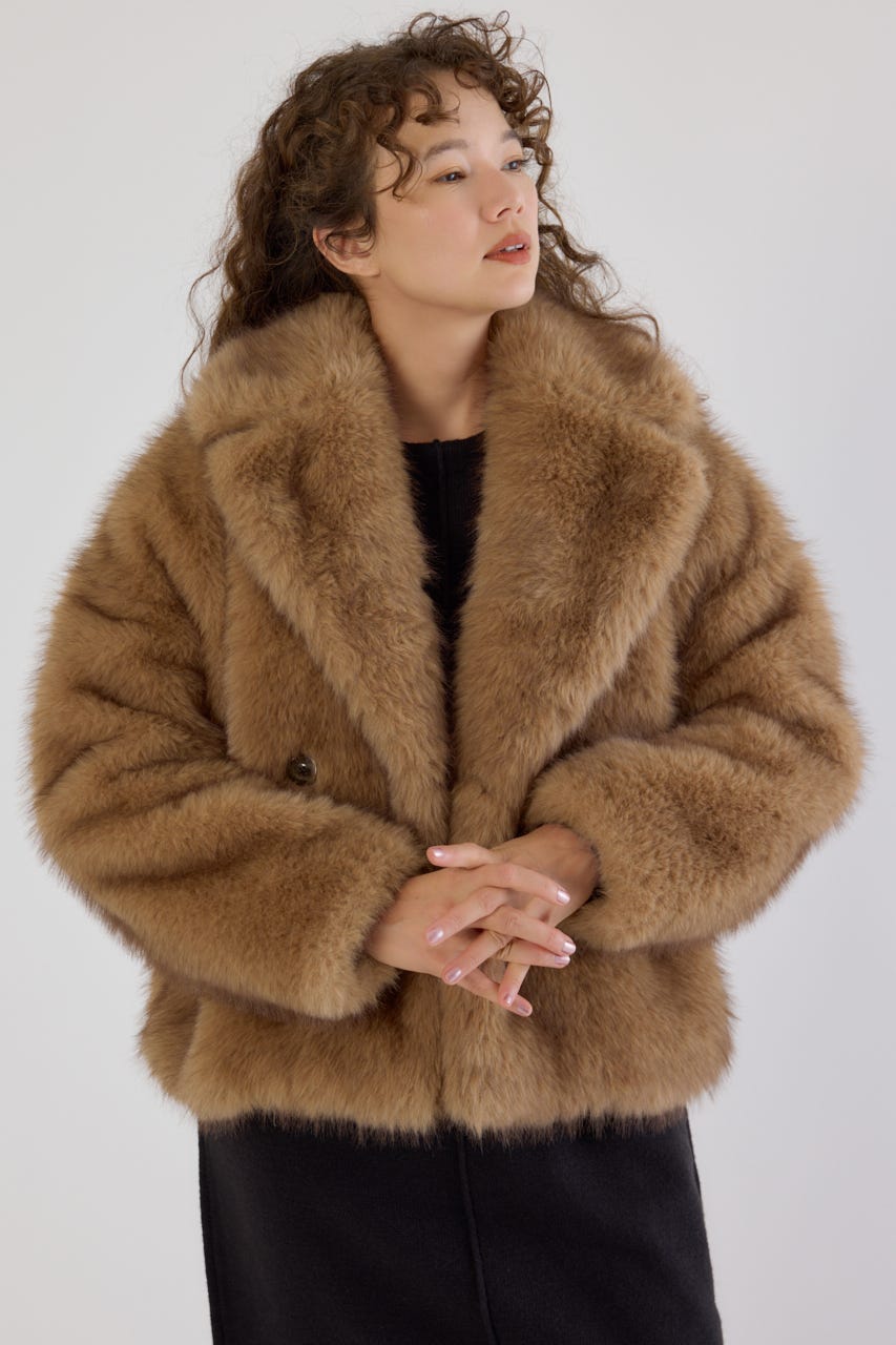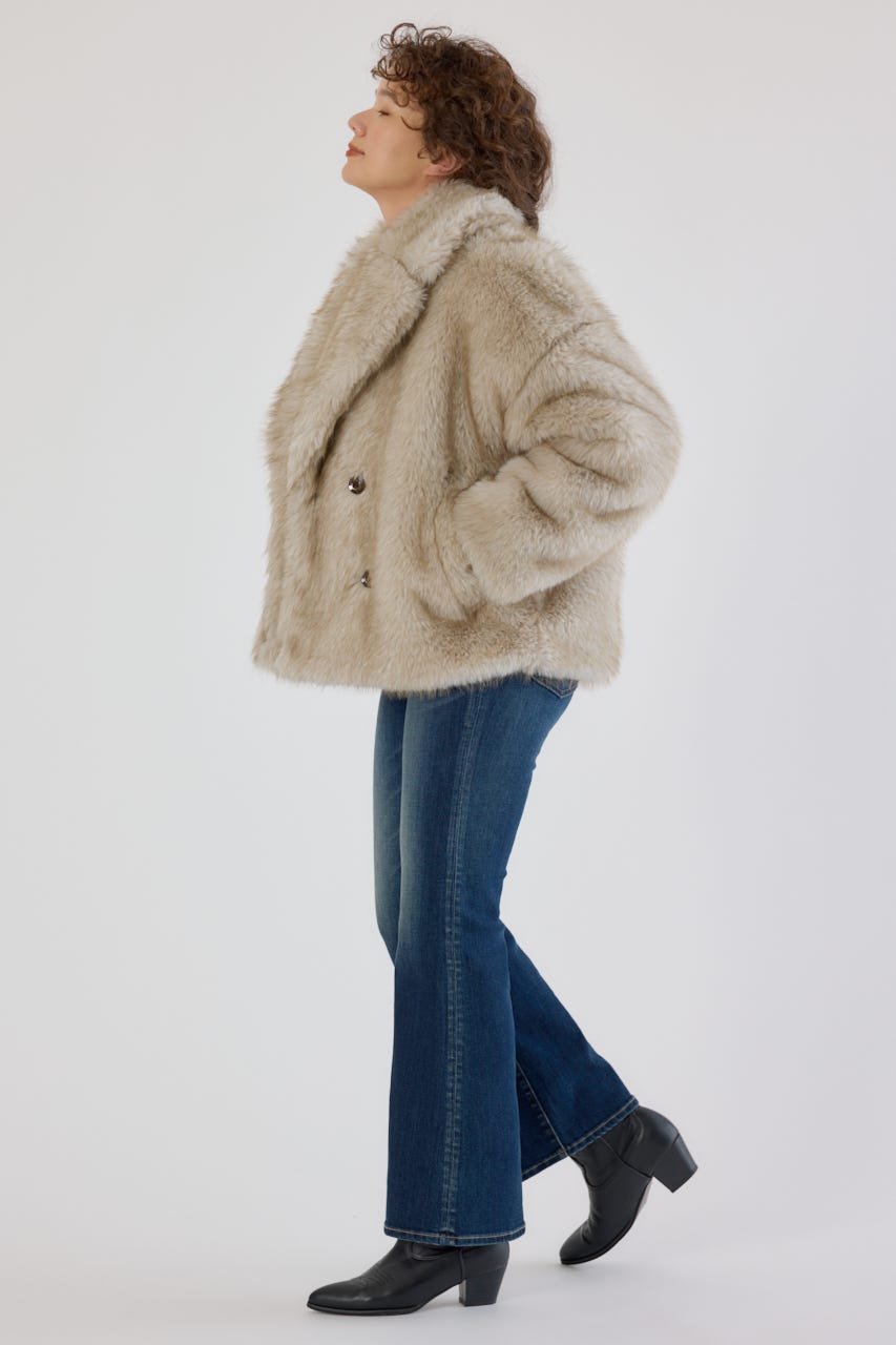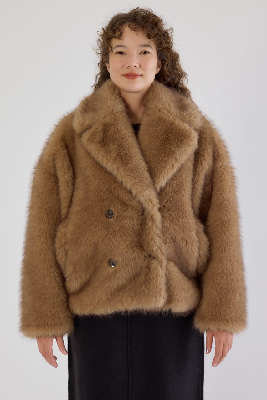 フォックスファーのような毛足長めのファーを使用し、洗練された女性の魅力を演出できるフェイクファーのPコート。