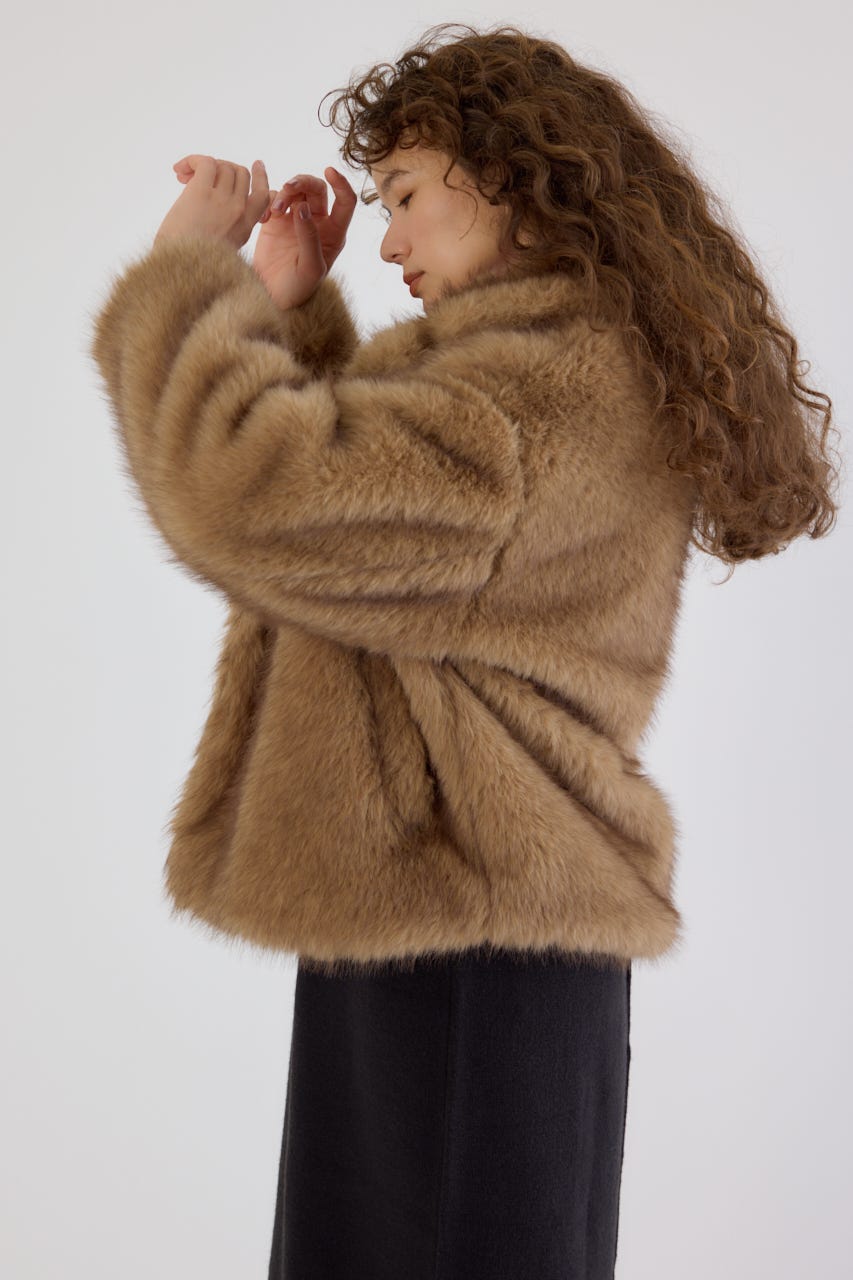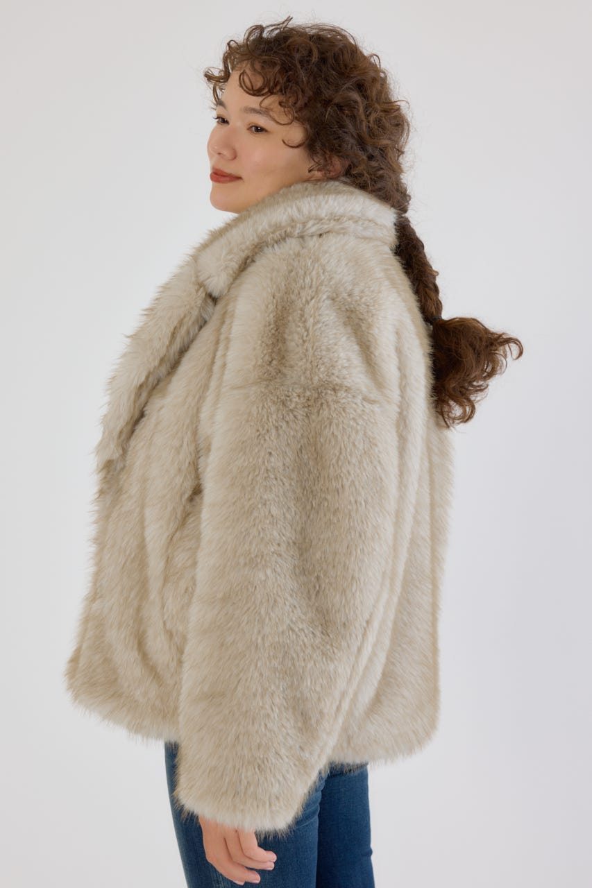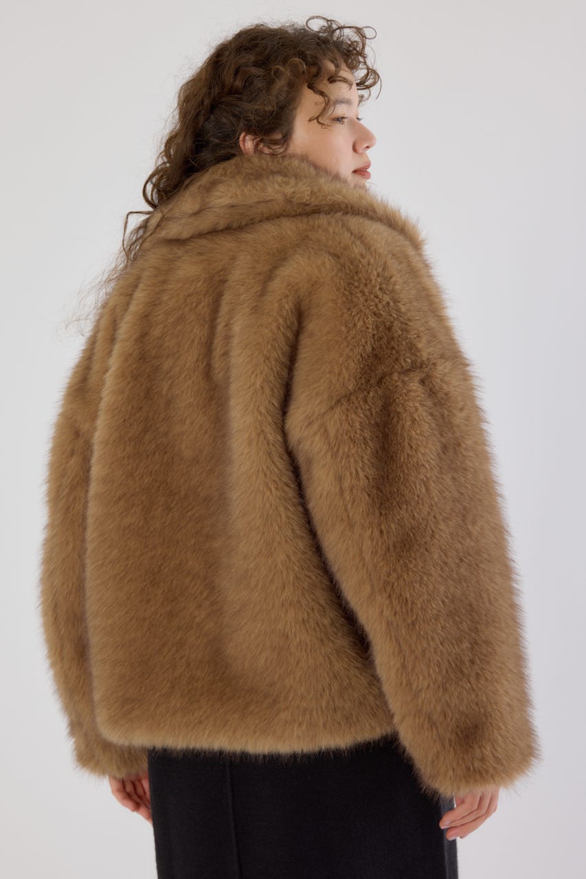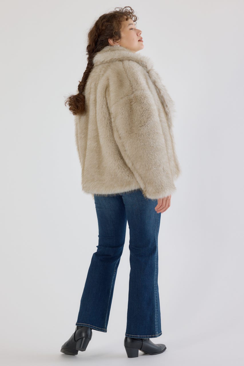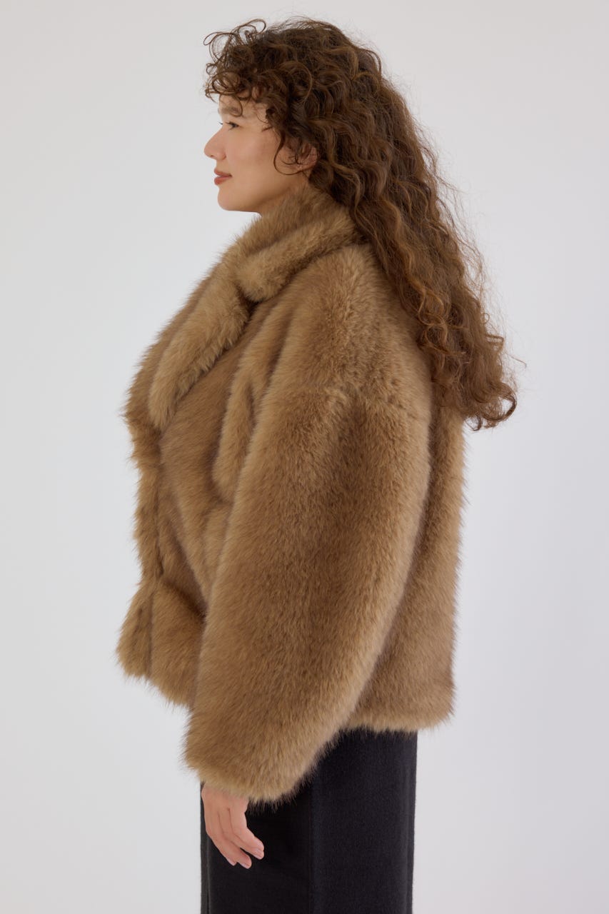 フォックスファーのような毛足長めのファーを使用し、洗練された女性の魅力を演出できるフェイクファーのPコート。